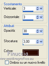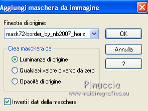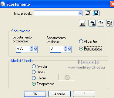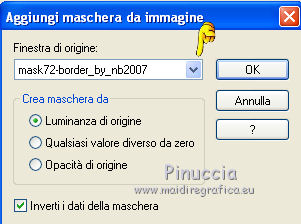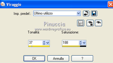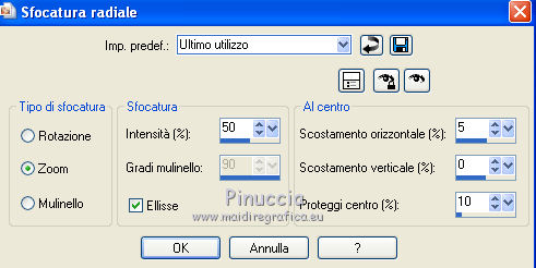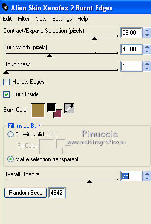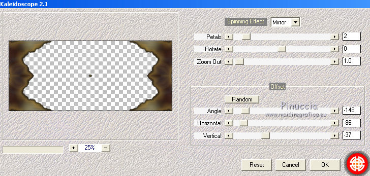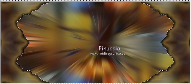 qui puoi trovare qualche risposta ai tuoi dubbi. Se l'argomento che ti interessa non è presente, ti prego di segnalarmelo. Per tradurre questo tutorial ho usato PSP X. Questo tutorial è una creazione di ©Titoune e non può essere copiato su altri siti nè essere offerto per il download. Lo stesso vale per la mia traduzione. Il materiale viene da vari gruppi di condivisione. Il copyright appartiene ai rispettivi autori. Grazie ai creatori dei tubes che mettono a disposizione il loro lavoro in vari gruppi di condivisione. Occorrente: Materiale qui Rispetta il lavoro degli autori, non cambiare il nome del file e non cancellare il watermark. Filtri: consulta, se necessario, la mia sezione filtri qui Mehdi - Kaleidoscope qui Alien Skin Xenofex 2.0 - Burnt Edges qui ![]() Apri le maschere in PSP e minimizzale con il resto del materiale. 1. Apri una nuova immagine trasparente 1280 x 550 pixels. Selezione>Seleziona tutto. 2. Apri l'immagine "Halloween_Halloween_Holiday_Decoration_011255" e vai a Modifica>Copia. Torna al tuo lavoro e vai a Modifica>Incolla nella selezione. Selezione>Deseleziona. 3. Effetti>Effetti di immagine>Motivo unico, con i settaggi standard. ![]() Effetti>Effetti di bordo>Aumenta di più. 4. Regola>Sfocatura>Sfocatura radiale. ![]() 5. Livelli>Duplica. Effetti>Plugins>Alien Skin Xenofex 2.0 - Burnt Edges. ![]() Effetti>Effetti di bordo>Erodi. 6. Effetti>Plugins>Mehdi - Kaleidoscope 2.1. ![]() 7. Attiva lo strumento Selezione , rettangolo,e seleziona il motivo centrale. ![]() Premi sulla tastiera il tasto CANC. Selezione>Deseleziona. 8. Attiva lo strumento Bacchetta magica ,e clicca al centro dell'immagine per selezionarla. ![]() Selezione>Modifica>Espandi - 5 pixels. Selezione>Inverti. 9. Effetti>Effetti di trama>Trama - seleziona la trama Muro di mattoni, se stai usando le versioni più recenti di PSP trama Corel_15_032, con i seguenti settaggi. ![]() Selezione>Inverti. 10. Livelli>Nuovo livello raster. Livelli>Disponi>Sposta giù. 11. L'immagine Halloween_Halloween_Holiday_Decoration_011255... dovrebbe essere ancora in memoria se così non fosse copiala nuovamente. Modifica>Incolla nella selezione. Selezione>Deseleziona. Attiva il livello superiore. 12. Apri una nuova immagine trasparente 375 x 550 pixels. Imposta il colore di primo piano con un colore scelto dal tuo top; per l'esempio #dec644. Riempi l'immagine trasparente con questo colore.13. Livelli>Nuovo livello maschera>Da immagine. Apri il menu sotto la finestra di origine e vedrai la lista dei files aperti. Seleziona la maschera "Mask72-border_by_nb2007", con i seguenti settaggi: ![]() Livelli>Unisci>Unisci gruppo. Modifica>Copia. Torna al tuo top e vai a Modifica>Incolla come nuovo livello. 14. Effetti>Effetti di immagine>Scostamento. ![]() Livelli>Duplica. Immagine>Rifletti. Livelli>Unisci>Unisci giù. 15. Effetti>Effetti 3D>Sfalsa ombra, con il colore #310b03. ![]() Ripeti l'Effetto Sfalsa ombra, cambiando verticale e orizzontale con -3. 16. Attiva il livello Raster 1. Selezione>Seleziona tutto. Immagine>Ritaglia la selezione. 17. Immagine>Dimensioni tela - 1280 x 1500 pixels. ![]() Livelli>Nuovo livello raster. Livelli>Disponi>Sposta giù. 18. Imposta il colore di sfondo con un colore più scuro. Per l'esempio #a8985f. Riempi il livello con questo colore.19. Effetti>Effetti di trama>Trama, con i settaggi precedenti. 20. Apri una nuova immagine trasparente 1280x 550 pixels, e riempila con il colore chiaro di primo piano.21 Livelli>Nuovo livello maschera>Da immagine. Apri il menu sotto la finestra di origine, e seleziona la maschera "mask72-border_by_nb2007_horiz", con i seguenti settaggi. ![]() Livelli>Unisci>Unisci gruppo. 22. Modifica>Copia. Torna al tuo top e vai a Modifica>Incolla come nuovo livello. 23. Effetti>Effetti di immagine>Scostamento. ![]() 24. Effetti>Effetti 3D>Sfalsa ombra, con i settaggi precedenti. 25. Apri il tube halloweentubes56 e vai a Modifica>Copia. Torna al tuo lavoro e vai a Modifica>Incolla come nuovo livello. 26. Immagine>Ridimensiona, al 55%, tutti i livelli non selezionato. Spostalo a sinistra, o dove preferisci.Effetti>Effetti 3D>sfalsa ombra, con i settaggi precedenti. 27. Apri il tube halloween3byjoanne e vai a Modifica>Copia. Torna al tuo lavoro e vai a Modifica>Incolla come nuovo livello. 28. Regola>Tonalità e saturazione>Viraggio. ![]() 29. Spostalo in basso a destra.Livelli>Duplica e passa la modalità di miscelatura di questo livello in Luce netta. 30. Attiva il livello sottostante dell'originale. Effetti>Effetti 3D>sfalsa ombra, con i settaggi precedenti. 31. Firma il tuo lavoro. Livelli>Unisci>Unisci tutto e salva in formato jpg. ![]() Se hai problemi o dubbi, o trovi un link non funzionante, o anche soltanto per un saluto, scrivimi. 31 Ottobre 2011 |