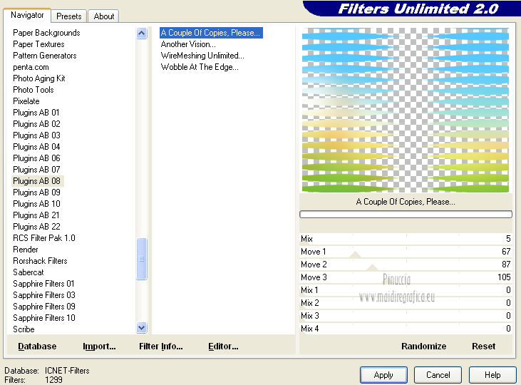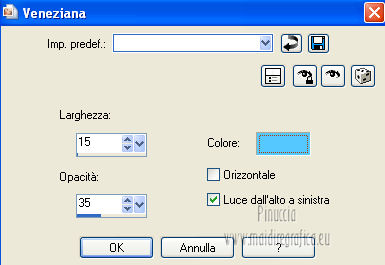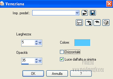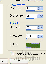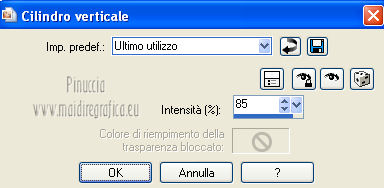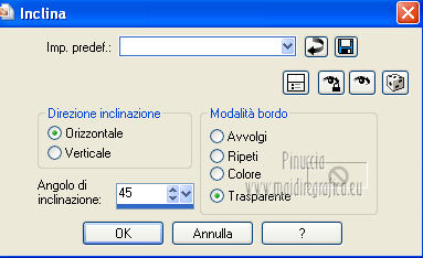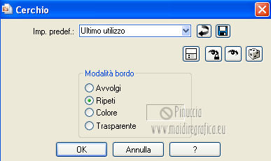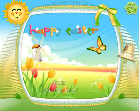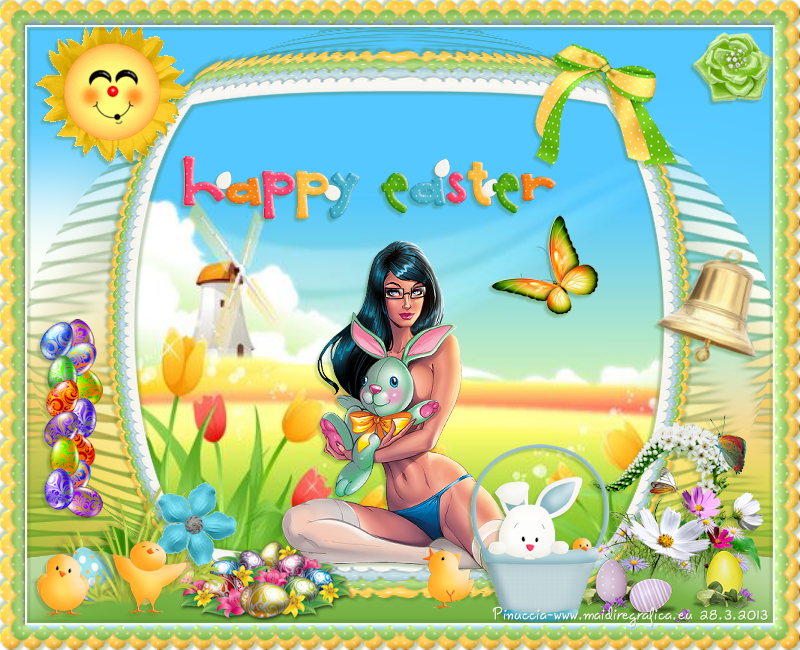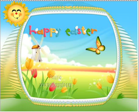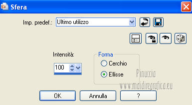 qui puoi trovare qualche risposta ai tuoi dubbi. Se l'argomento che ti interessa non è presente, ti prego di segnalarmelo. Questo tutorial è una creazione di ©Titoune e non può essere copiato su altri siti nè essere offerto per il download. Lo stesso vale per la mia traduzione. Il tutorial è stato creato con PSP X5, ma può essere eseguito anche con le altre versioni di PSP. Secondo la versione utilizzata (anteriore a PSP X) potresti ottenere dei risultati differenti. Per tradurlo, ho usato PSP X. Grazie ai creatori dei tubes che mettono a disposizione il loro lavoro in vari gruppi di condivisione. Rispetta il lavoro degli autori, non cambiare il nome del file e non cancellare il watermark. Occorrente: Un tube a scelta. Il resto del materiale qui Il tube utilizzato è di Jenn. Gli elementi scrap sono una creazione Alexx's Designs Filtri: Filters Unlimited 2.0 qui Plugins AB 08 - A Couple Of Copies,Please qui Animation Shop qui ![]() Metti la selezione "Sélection_scrap_happy_easter_color" nella cartella Selezioni. 1. Apri una nuova immagine trasparente 750 x 600 pixels. 2. Apri l'elemento ald_eastercollab2013freebie.png (20) e vai a Modifica>Copia. Torna al tuo lavoro e vai a Modifica>Incolla come nuovo livello. 3. Immagine>Ridimensiona, al 75%, tutti i livelli non selezionato. 4. Immagine>Ruota per gradi - 90 gradi a sinistra. ![]() 5. Effetti>Effetti geometrici>Cerchio. ![]() 6. Effetti>Effetti geometrici>Cilindro verticale. ![]() Rinomina questo livello "cornice". 7. Attiva lo strumento Bacchetta magica ![]() e clicca al centro della cornice per selezionarla. Selezione>Modifica>Espandi - 2 pixels. 8. Livelli>Nuovo livello raster. Livelli>Disponi>Sposta giù. 9. Apri l'immagine "Landscape_Vector7_-_ZZVE" e vai a Modifica>Copia. Torna al tuo lavoro e vai a Modifica>Incolla nella selezione. Selezione>Seleziona tutto. 10. Attiva il livello inferiore. Modifica>Incolla nella selezione (l'immagine è sempre in memoria). Regola>Sfocatura>Sfocatura gaussiana - raggio 40. ![]() Selezione>Deseleziona. 11. Livelli>Duplica. Effetti>Plugins>Filter Unlimited 2.0 - Plugins AB08 - A Couple Of Copies, Please... ![]() 12. Effetti>Effetti 3D>Sfalsa ombra, con il colore #426e1e. ![]() Ripeti l'Effetto Sfalsa ombra, cambiando verticale e orizzontale con -3. 13. Effetti>Effetti geometrici>Inclina. ![]() 14. Effetti>Effetti di riflesso>Specchio rotante. ![]() 15. Effetti>Effetti geometrici>Sfera. ![]() Rinomina questo livello "sfera". 16. Attiva il livello "cornice". Effetti>Effetti 3D>Sfalsa ombra, con i settaggi precedenti. 17. Attiva il livello "sfera". Attiva lo strumento Selezione ![]() clicca sull'icona Selezione personalizzata ![]() e imposta i seguenti settaggi. ![]() 18. Livelli>Nuovo livello raster. Apri l'elemento ald_eastercollab2013freebie.png (8) e vai a Modifica>Copia. Torna al tuo lavoro e vai a Modifica>Incolla nella selezione. Selezione>Deseleziona. Effetti>Effetti di riflesso>Specchio rotante, con i settaggi precedenti. Effetti>Effetti 3D>Sfalsa ombra, con i settaggi precedenti. 19. Attiva il livello superiore (cornice). Apri l'elemento 63115152_p (sole) e vai a Modifica>Copia. Torna al tuo lavoro e vai a Modifica>Incolla come nuovo livello. Spostalo in alto a sinistra.Vedi l'esempio finale. 20. Effetti>Effetti 3D>Sfalsa ombra, con il colore #426e1e. ![]() 21. Apri l'elemento ald_eastercollab2013freebie.png (7) e vai a Modifica>Copia. Torna al tuo lavoro e vai a Modifica>Incolla come nuovo livello. Spostalo nella parte superiore della cornice.Vedi l'esempio finale. Effetti>Effetti 3D>Sfalsa ombra, con i settaggi precedenti. 22. Apri l'elemento d2d165be (farfalla) e vai a Modifica>Copia. Torna al tuo lavoro e vai a Modifica>Incolla come nuovo livello. Spostalo nella cornice.![]() Effetti>Effetti 3D>Sfalsa ombra, con i settaggi precedenti. 23. Apri l'elemento ald_eastercollab2013freebie.png (22) e vai a Modifica>Copia. Torna al tuo lavoro e vai a Modifica>Incolla come nuovo livello. Spostalo nella parte superiore destra della cornice.Vedi l'esempio finale. Effetti>Effetti 3D>Sfalsa ombra, con i settaggi precedenti. 24. Apri l'elemento ald_eastercollab2013freebie.png (12) e vai a Modifica>Copia. Torna al tuo lavoro e vai a Modifica>Incolla come nuovo livello. Sposta anche questo elemento nella parte superiore della cornice.Vedi l'esempio finale. Effetti>Effetti 3D>Sfalsa ombra, con i settaggi precedenti. 25. Apri l'elemento 0_5acd3_4a570797_XL (campana) e vai a Modifica>Copia. Torna al tuo lavoro e vai a Modifica>Incolla come nuovo livello. Spostalo a destra.![]() Effetti>Effetti 3D>Sfalsa ombra, con i settaggi precedenti. 26. Apri l'elemento 2a573549 (fiori_farfalla) e vai a Modifica>Copia. Torna al tuo lavoro e vai a Modifica>Incolla come nuovo livello. Spostalo in basso a destra.Vedi l'esempio finale. Effetti>Effetti 3D>Sfalsa ombra, con i settaggi precedenti. 27. Apri l'elemento 0_813f8_f1bb47f0_L (3 uova) e vai a Modifica>Copia. Torna al tuo lavoro e vai a Modifica>Incolla come nuovo livello. Spostalo in basso a destra.![]() Effetti>Effetti 3D>Sfalsa ombra, con i settaggi precedenti. 28. Apri l'elemento ald_eastercollab2013freebie.png (1) e vai a Modifica>Copia. Torna al tuo lavoro e vai a Modifica>Incolla come nuovo livello. Spostalo nella parte inferiore destra della cornice.![]() Effetti>Effetti 3D>Sfalsa ombra, con i settaggi precedenti. 29. Apri l'elemento ald_eastercollab2013freebie.png (5) e vai a Modifica>Copia. Torna al tuo lavoro e vai a Modifica>Incolla come nuovo livello. Spostalo in basso.![]() Effetti>Effetti 3D>Sfalsa ombra, con i settaggi precedenti. 30. Apri l'elemento 021f613b (uova_fiori) e vai a Modifica>Copia. Torna al tuo lavoro e vai a Modifica>Incolla come nuovo livello. Spostalo in basso.Vedi l'esempio finale. Nessun Effetto Sfalsa ombra. 31. Apri l'elemento ald_eastercollab2013freebie.png (13) e vai a Modifica>Copia. Torna al tuo lavoro e vai a Modifica>Incolla come nuovo livello. Spostalo nella parte inferiore sinistra della cornice.![]() Effetti>Effetti 