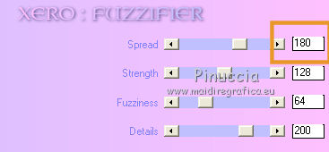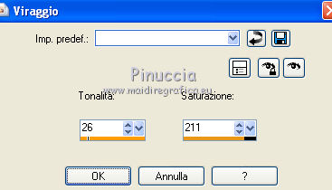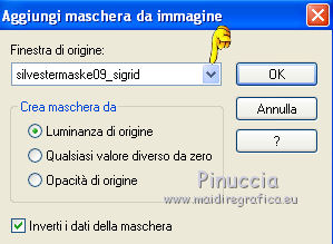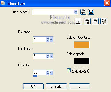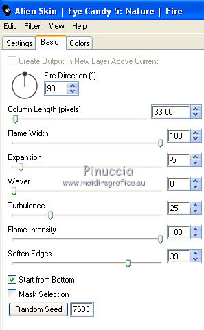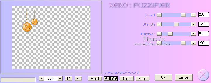 qui puoi trovare qualche risposta ai tuoi dubbi. Se l'argomento che ti interessa non è presente, ti prego di segnalarmelo. Per tradurre questo tutorial ho usato PSP X. Questo tutorial è una creazione di ©Titoune e non può essere copiato su altri siti nè essere offerto per il download. Lo stesso vale per la mia traduzione. Il materiale viene da vari gruppi di condivisione. Il copyright appartiene ai rispettivi autori. Grazie ai creatori dei tubes che mettono a disposizione il loro lavoro in vari gruppi di condivisione. Rispetta il lavoro degli autori, non cambiare il nome del file e non cancellare il watermark. Occorrente: Materiale qui Il tube utilizzato è di Gina tube Filtri: consulta, se necessario, la mia sezione filtri qui Graphics Plus - Cross Shadow qui Alien Skin Eye Candy 5 Nature - Fire qui Xero - Fuzzifier qui Animation Shop qui ![]() Metti la selezione nella cartella Selezioni. Apri la maschera silverstermaske09_sigrid in PSP e minimizzala con il resto del materiale. 1. Imposta il colore di primo piano con #e99728, e il colore di sfondo con il colore nero. 2. Apri una nuova immagine trasparente 750 x 600 pixels, e riempila con il colore nero.3. Apri il tube lunapaisagem1157 e vai a Modifica>Copia. Torna al tuo lavoro e vai a Modifica>Incolla come nuovo livello. 4. Immagine>Ridimensiona, all'85%, tutti i livelli non selezionato. Regola>Messa a fuoco>Metti a fuoco. Sposta il tube a destra, vedi l'esempio finale.Livelli>Duplica, e cambia la modalità di miscelatura di questo livello in Luce diffusa. 5. Livelli>Nuovo livello raster. Riempi con il colore di primo piano #e99728.6. Effetti>Plugins>Graphics Plus - Cross Shadow. ![]() 7. Livelli>Nuovo livello maschera>Da immagine. Apri il menu sotto la finestra di origine e vedrai la lista dei files aperti. Seleziona la maschera silvestermaske09_sigrid, con i seguenti settaggi. ![]() Livelli>Unisci>Unisci gruppo. Regola>Messa a fuoco>Metti a fuoco. 8. Effetti>Effetti 3D>Sfalsa ombra, con il colore nero. ![]() Ripeti l'Effetto Sfalsa ombra, cambiando verticale e orizzontale con -3. 9. Apri il tube w-kugel_set5_01a_©sigrid e vai a Modifica>Copia. Torna al tuo lavoro e vai a Modifica>Incolla come nuovo livello. 10. Immagine>Ridimensiona, al 75%, tutti i livelli non selezionato. Regola>Messa a fuoco>Metti a fuoco. 11. Regola>Tonalità e saturazione>Viraggio. ![]() Sposta il tube in alto a sinistra.12. Livelli>Duplica. Immagine>Ridimensiona, al 70%, tutti i livelli non selezionato. Sposta la pallina accanto alla precedente.Livelli>Unisci>Unisci giù, e rinomina questo livello "pallina". 13. Effetti>Effetti 3D>Sfalsa ombra, con i settaggi precedenti. Livelli>Disponi>Sposta giù. 14. Apri il tube GINATUBE FEMME 2235 e vai a Modifica>Copia. Torna al tuo lavoro e vai a Modifica>Incolla come nuovo livello. 15. Immagine>Ridimensiona, al 55%, tutti i livelli non selezionato. Regola>Messa a fuoco>Metti a fuoco. Spostalo in basso sul bordo.16. Effetti>Effetti 3D>Sfalsa ombra, con i settaggi precedenti. Livelli>Disponi>Sposta giù. 17. Apri il tube swania_Grouplg e vai a Modifica>Copia. Torna al tuo lavoro e vai a Modifica>Incolla come nuovo livello. Immagine>Ridimensiona, al 45%, tutti i livelli non selezionato. Regola>Messa a fuoco>Metti a fuoco. Spostalo in basso a destra.Rinomina questo livello "candele". 18. Effetti>Effetti 3D>Sfalsa ombra, con i settaggi precedenti. 19. Apri il tube wordart_xmas8_ice e vai a Modifica>Copia. Torna al tuo lavoro e vai a Modifica>Incolla come nuovo livello. 20. Immagine>Ridimensiona, al 65%, tutti i livelli non selezionato. Regola>Messa a fuoco>Metti a fuoco. Spostalo in alto a destra - vedi l'esempio finale.21. Regola>Tonalità e saturazione>Viraggio, con i settaggi precedenti. Effetti>Effetti 3D>Sfalsa ombra, con i settaggi precedenti. Rinomina questo livello "testo". 22. Attiva il livello Raster 1. Selezione>Seleziona tutto. Immagine>Ritaglia la selezione. Selezione>Seleziona tutto. 23. Immagine>Dimensioni tela - 800 x 650 pixels. ![]() Selezione>Inverti. Livelli>Nuovo livello raster. Livelli>Disponi>Sposta giù. Riempi con il colore nero.24. Effetti>Effetti di trama>Intessitura. ![]() Regola>Messa a fuoco>Metti a fuoco. Selezione>Deseleziona. 25. Apri il tube titoune_coins e vai a Modifica>Copia. Torna al tuo lavoro e vai a Modifica>Incolla come nuovo livello. 26. Livelli>Nuovo livello raster. Riempi con il colore di primo piano #e99728.27. Selezione>Seleziona tutto. Selezione>Modifica>Contrai - 1 pixel. Premi sulla tastiera il tasto CANC. Selezione>Inverti. 28. Effetti>Effetti 3D>Smusso a incasso. ![]() Selezione>Deseleziona. Firma il tuo lavoro. 29. Animazione. La preparazione per realizzare l'animazione è un po' lunga, ma il risultato vale la pena. Attiva il livello "palline". Livelli>Duplica - 2 volte e rimani posizionato sul livello della seconda copia. 30. Effetti>Plugins>Xero - Fuzzifier: ![]() Chiudi il livello e attiva il livello della prima copia. Effetti>Plugins>Xero - Fuzzifier, cambia soltanto Spread con 180 e ok. ![]() Chiudi questo livello e attiva il livello originale "palline". Effetti>Plugins>Xero - Fuzzifier, cambia Spread con 160 e ok. Lascia il livello visibile. 31. Attiva il livello "testo". Livelli>Duplica - 2 volte. Ripeti il punto 30. 32. Se vuoi animare - come nel mio esempio - il vestito della donna: Attiva il livello del tube, attiva lo strumento Selezione a mano libera , da punto a punto,e seleziona le parti che vuoi animare. Livelli>Duplica - 2 volte. Ripeti il punto 30. Selezione>Deseleziona. 33. Attiva il livello "candele". Selezione>Carica/Salva selezione>Carica selezione da disco. Cerca e carica la selezione "selection_flamme". ![]() Le selezioni dovrebbero trovarsi sugli stoppini delle candele. Se non fosse così, non avendo unito i livelli, puoi ancora usare lo strumento Spostamento ![]() e correggere la posizione del tube. ![]() 34. Livelli>Duplica - 2 volte e rimani posizionato sul livello della seconda copia. Effetti>Plugins>Alien Skin Eye Candy 5 Nature - Fire. !