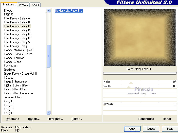 3. Effetti>Plugins>Filters Unlimited 2.0 - Filter Factory Gallery C - Border Noisy Fade III, con i settaggi standard.