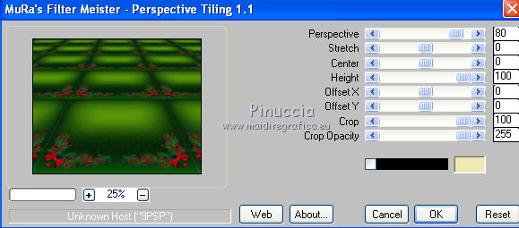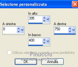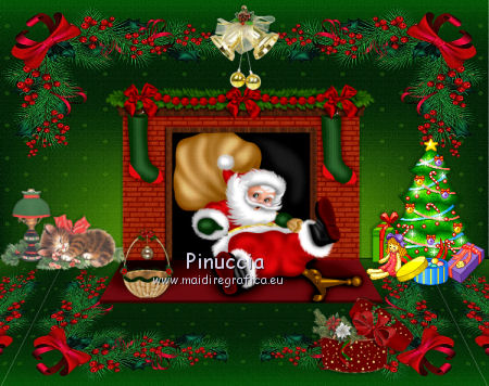 qui puoi trovare qualche risposta ai tuoi dubbi. Se l'argomento che ti interessa non è presente, ti prego di segnalarmelo. Per tradurre questo tutorial ho usato PSP X. Questo tutorial è una creazione di ©Titoune e non può essere copiato su altri siti nè essere offerto per il download. Lo stesso vale per la mia traduzione. Il materiale viene da vari gruppi di condivisione. Il copyright appartiene ai rispettivi autori. Grazie ai creatori dei tubes che mettono a disposizione il loro lavoro in vari gruppi di condivisione. Occorrente: Materiale qui Gli elementi scrap sono una creazione di Sigrid Rispetta il lavoro degli autori, non cambiare il nome del file e non cancellare il watermark. Filtri: consulta, se necessario, la mia sezione filtri qui Mura's Meister - Perspective Tiling qui Penta.com - Jeans qui Graphics Plus - Cross Shadow qui Filters Unlimited 2.0 qui Filter Factory Gallery M - Loom qui I filtri Factory Gallery per essere usati devono prima essere convertiti. Come fare vedi qui Si usano importandoli in Filters Unlimited (come fare vedi qui) ma possono funzionare anche da soli Animation Shop qui ![]() 1. Apri una nuova immagine trasparente 750 x 600 pixels. Selezione>Seleziona tutto. 2. Apri l'immagine "120911" e vai a Modifica>Copia. Torna al tuo lavoro e vai a Modifica>Incolla nella selezione. Selezione>Deseleziona. 3. Livelli>Duplica, e chiudi il livello della copia. Attiva il livello sottostante dell'originale. 4. Effetti>Plugins>Mura's Meister - Perspective Tiling. ![]() 5. Attiva lo strumento Selezione ,clicca sull'icona Selezione personalizzata ![]() e imposta i seguenti settaggi: ![]() Selezione>Inverti. Premi sulla tastiera il tasto CANC. Selezione>Deseleziona. 6. Apri e attiva il livello superiore della copia. Immagine>Capovolgi. 7. Selezione personalizzata ![]() ![]() Selezione>Innalza selezione a livello. 8. Effetti>Effetti 3D>Smusso a incasso. ![]() Selezione>DEseleziona. 9. Attiva il livello copia di Raster 1. Livelli>Disponi>Sposta giù. 10. Apri il tube SantaGoesKerPlunk e vai a Modifica>Copia. Torna al tuo lavoro e vai a Modifica>Incolla come nuovo livello. Livelli>Disponi>Porta in alto. 11. Immagine>Ridimensiona, al 60%, tutti i livelli non selezionato. Posiziona il tube al centro - vedi l'esempio finale.12. Effetti>Effetti 3D>Sfalsa ombra, con il colore #042506. ![]() Ripeti l'Effetto Sfalsa ombra, cambiando verticale e orizzontale con -3. 13. Apri il tube sapin_6 e vai a Modifica>Copia. Torna al tuo lavoro e vai a Modifica>Incolla come nuovo livello. Spostalo in basso a destra.14. Effetti>Effetti 3D>Sfalsa ombra, con i settaggi precedenti. 15. Apri il tube SGS_Freebie4_Korb e vai a Modifica>Copia. Torna al tuo lavoro e vai a Modifica>Incolla come nuovo livello. Spostalo sul caminetto, in basso a sinistra.16. Effetti>Effetti 3D>Sfalsa ombra, con i settaggi precedenti. 17. Apri il tube SGS_Freebie4_Dekor7 e vai a Modifica>Copia. Torna al tuo lavoro e vai a Modifica>Incolla come nuovo livello. Sposta le campanelle sul caminetto.18. Effetti>Effetti 3D>Sfalsa ombra, con i settaggi precedenti. 19. Apri il tube SGS_Freebie4_Geschenkebox e vai a Modifica>Copia. Torna al tuo lavoro e vai a Modifica>Incolla come nuovo livello. Immagine>Rifletti. Spostalo in basso a destra - vedi l'esempio finale.20. Effetti>Effetti 3D>Sfalsa ombra, con i settaggi precedenti. 21. Apri il tube 131_(XMAS)_RiRi-nappingchristmaskitten e vai a Modifica>Copia. Torna al tuo lavoro e vai a Modifica>Incolla come nuovo livello. Spostalo a sinistra.22. Livelli>Duplica, e cambia la modalità di miscelatura di questo livello in Luce diffusa. 23. Attiva il livello sottostante dell'originale. Effetti>Effetti 3D>Sfalsa ombra, con i settaggi precedenti. ![]() Attiva nuovamente il livello della copia. 24. Livelli>Nuovo livello raster. Imposta il colore di primo piano con #e60e14, e riempi il livello con questo colore.25. Selezione>Seleziona tutto. Selezione>Modifica>Contrai - 1 pixel. Premi sulla tastiera il tasto CANC. Selezione>Inverti. Effetti>Plugins>Penta.com - Jeans, con i settaggi standard. ![]() 27. Effetti>Effetti 3D>Sfalsa ombra, con i settaggi precedenti. Selezione>Deseleziona. 28. Attiva il livello inferiore. Selezione>Seleziona tutto. Immagine>Ritaglia la selezione. 29. Immagine>Dimensioni tela. ![]() Livelli>Nuovo livello raster. Livelli>Disponi>Sposta giù. Imposta il colore di sfondo con #2d6207, e riempi il livello con questo colore.30. Selezione>Seleziona tutto. Selezione>Modifica>Contrai - 25 pixels. Selezione>Inverti. Effetti>Plugins>Graphics Plus - Cross Shadow, con i settaggi standard. ![]() 31. Effetti>Plugins>Filters Unlimited 2.0 - Filter Factory Gallery M - Loom, con i settaggi standard. ![]() Selezione>Deseleziona. 32. Livelli>Nuovo livello raster. Livelli>Disponi>Porta in alto. Riempi con il colore di primo piano #e60e14.33. Selezione>Seleziona tutto. Selezione>Modifica>Contrai - 1 pixel. Premi sulla tastiera il tasto CANC. Selezione>Inverti. 34. Effetti>Plugins>Penta.com - Jeans, con i settaggi standard. ![]() 35. Effetti>Effetti 3D>Sfalsa ombra, con i settaggi precedenti. Selezione>Deseleziona. 36. Apri il tube SGS_Christmas_Trennlinie-rot e vai a Modifica>Copia. Torna al tuo lavoro e vai a Modifica>Incolla come nuovo livello. Spostalo in alto al centro.37. Effetti>Effetti 3D>Sfalsa ombra, con i settaggi precedenti. 38. Apri il tube SGS_Freebie4_Dekor5 e vai a Modifica>Copia. Torna al tuo lavoro e vai a Modifica>Incolla come nuovo livello. Spostalo in basso a destra.39. Effetti>Effetti 3D>Sfalsa ombra, con i settaggi precedenti. Livelli>Duplica. Immagine>Rifletti. Firma il tuo lavoro. 40. Modifica>Copia Unione. Apri Animation Shop e vai a Modifica>Incolla>Incolla come nuova animazione. Livelli>Duplica, e ripeti fino ad avere quattro fotogrammi. Clicca sul primo fotogramma per selezionarlo e vai a Modifica>Seleziona tutto. 41. Apri l'immagine cadeaux-noel-016OK22, anche questa composta da 4 fotogrammi. Modifica>Seleziona tutto. Attiva il tuo lavoro e vai a Modifica>Incolla