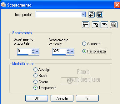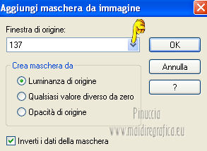 qui puoi trovare qualche risposta ai tuoi dubbi. Se l'argomento che ti interessa non č presente, ti prego di segnalarmelo. Per tradurre questo tutorial ho usato PSP X. Questo tutorial č una creazione di ŠTitoune e non puō essere copiato su altri siti nč essere offerto per il download. Lo stesso vale per la mia traduzione. Grazie ai creatori dei tubes che mettono a disposizione il loro lavoro in vari gruppi di condivisione. Rispetta il lavoro degli autori, non cambiare il nome del file e non cancellare il watermark. Occorrente: Materiale qui Tube ed elementi condivisi sul sito di Zezette 2. ![]() Apri la maschera in PSP e minimizzala con il resto del materiale. 1. Imposta il colore di primo piano con #f0de91, e il colore di sfondo con #0e5300. 2. Apri una nuova immagine trasparente 1280 x 550 pixels. Selezione>Seleziona tutto. Apri l'elemento 233fd57a (sfondo verde) e vai a Modifica>Copia. Torna al tuo lavoro e vai a Modifica>Incolla nella selezione. Selezione>Deseleziona. 3. Apri l'elemento 4d76361d (cornice) e vai a Modifica>Copia. Torna al tuo lavoro e vai a Modifica>Incolla come nuovo livello. Non spostarlo. Effetti>Effetti 3D>Sfalsa ombra, con il colore #0f1808. ![]() 4. Attiva lo strumento Bacchetta magica ![]() e clicca al centro della cornice per selezionarla. Livelli>Nuovo livello raster. 5. Apri l'immagine 8d3450ae (paesaggio) e vai a Modifica>Copia. Torna al tuo lavoro e vai a Modifica>Incolla nella selezione. Selezione>Deseleziona. 6. Apri l'elemento b57f626e (babbo natale) e vai a Modifica>Copia. Torna al tuo lavoro e vai a Modifica>Incolla come nuovo livello. Posiziona l'elemento nel paesaggio.Vedi l'effetto finale. Effetti>Effetti 3D>Sfalsa ombra, con i settaggi precedenti. 7. Apri l'elemento 74522dda (albero) e vai a Modifica>Copia. Torna al tuo lavoro e vai a Modifica>Incolla come nuovo livello. Posiziona l'albero a destra.![]() Effetti>Effetti 3D>Sfalsa ombra, con i settaggi precedenti. 8. Apri l'elemento 4357bf96 (palline rosse) e vai a Modifica>Copia. Torna al tuo lavoro e vai a Modifica>Incolla come nuovo livello. Posiziona le palline in alto a sinistra.![]() Effetti>Effetti 3D>Sfalsa ombra, con i settaggi precedenti. 9. Apri l'elemento wordart e vai a Modifica>Copia. Torna al tuo lavoro e vai a Modifica>Incolla come nuovo livello. Posiziona il testo in alto.![]() Effetti>Effetti 3D>Sfalsa ombra, con i settaggi precedenti. 10. Attiva il livello Raster 1. Selezione>Seleziona tutto. Immagine>Ritaglia la selezione. 11. Immagine>Dimensioni tela - 1280 x 1500 pixels. ![]() 12. Livelli>Nuovo livello raster. Livelli>Disponi>Sposta gių. Riempi con il colore di sfondo #0e5300.13. Apri una nuova immagine trasparente 1280 x 350 pixels, e riempila con il colore di primo piano.14. Livelli>Nuovo livello maschera>Da immagine. Apri il menu sotto la finestra di origine e vedrai la lista dei files aperti. Seleziona la maschera "137", con i seguenti settaggi: ![]() Livelli>Unisci>Unisci gruppo. Modifica>Copia. Torna al tuo top e vai a Modifica>Incolla come nuovo livello. 15. Effetti>Effetti di immagine>Scostamento. ![]() Effetti>Effetti 3D>Sfalsa ombra, con i settaggi precedenti. 16. Firma il tuo lavoro. Livelli>Unisci>Unisci tutto e salva in formato jpg. ![]() Se hai problemi o dubbi, o trovi un link non funzionante, o anche soltanto per un saluto, scrivimi. 14 Dicembre 2012 |