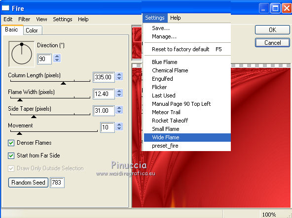 16. Effetti>Plugins>Eye Candy 4000 - Fire, clicca su Random Seed e ok.