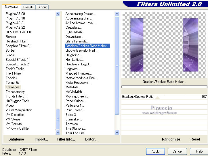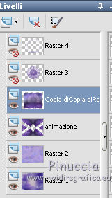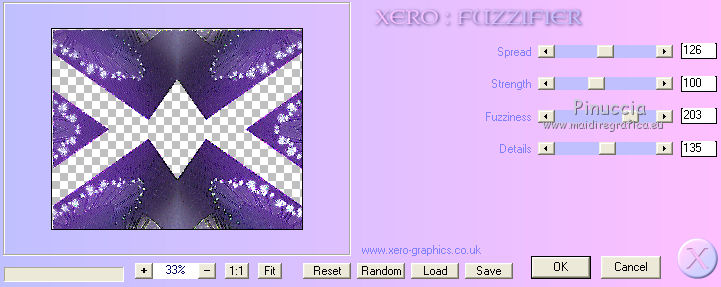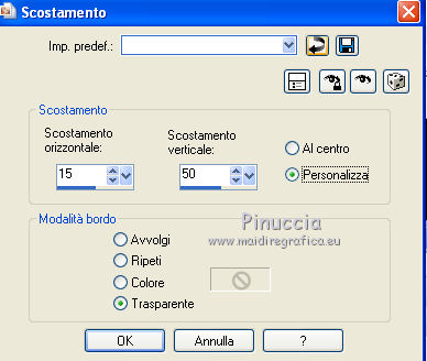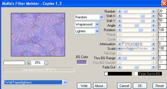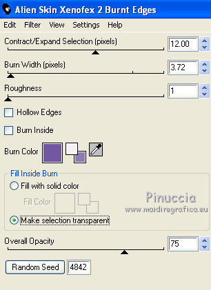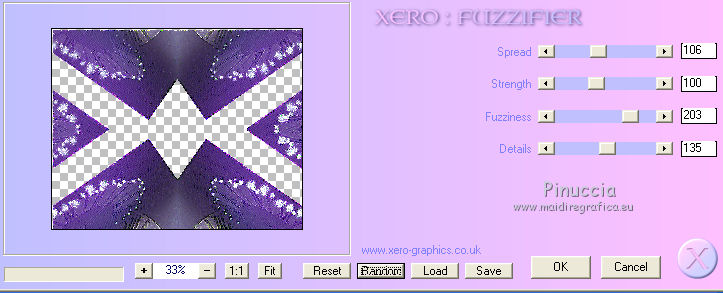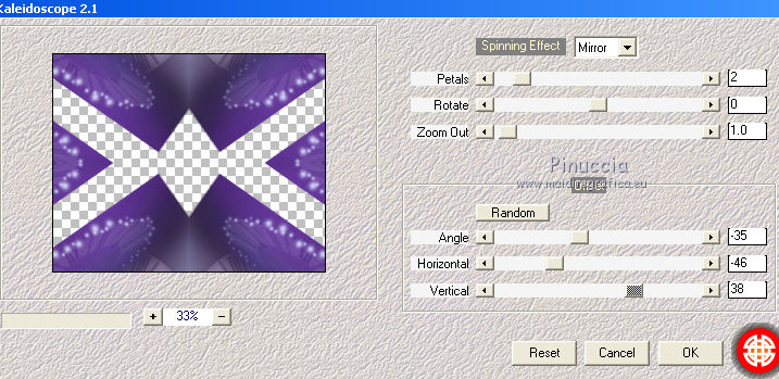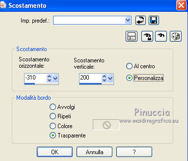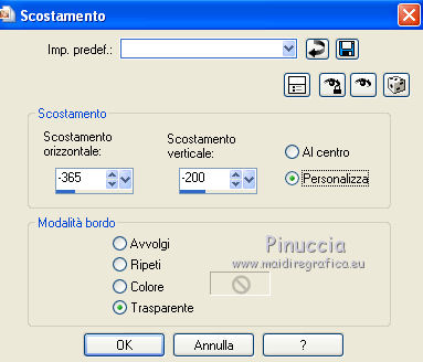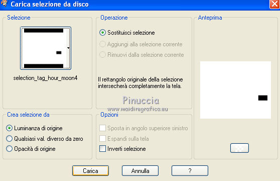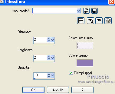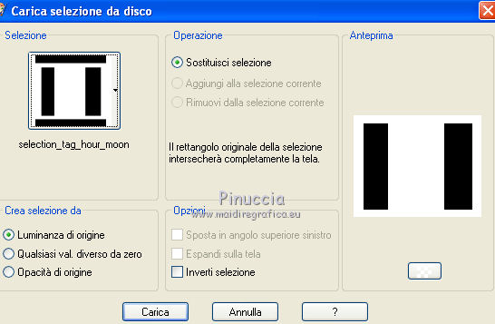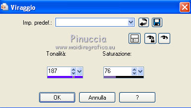 qui puoi trovare qualche risposta ai tuoi dubbi. Se l'argomento che ti interessa non è presente, ti prego di segnalarmelo. Per tradurre questo tutorial ho usato PSP X. Questo tutorial è una creazione di ©Titoune e non può essere copiato su altri siti nè essere offerto per il download. Lo stesso vale per la mia traduzione. Il materiale viene da vari gruppi di condivisione. Il copyright appartiene ai rispettivi autori. Grazie ai creatori dei tubes che mettono a disposizione il loro lavoro in vari gruppi di condivisione. Occorrente: Materiale qui Gli elementi utilizzati sono una creazione di Cindrys Il tube utilizzato "b919a67..." è una creazione di Miss Holly Rispetta il lavoro degli autori, non cambiare il nome del file e non cancellare il watermark. Filtri: consulta, se necessario, la mia sezione filtri qui Filters Unlimited 2.0 qui Mura's Meister - Copies qui Alien Skin Xenofex 2.0 - Burnt Edges qui Tramages - Gradiente Spokes Ratio Maker qui Mehdi - Kaleidoscope 2.1 qui Xero - Fuzzifier qui Animation Shop qui ![]() Metti le selezioni nella cartella Selezioni. 1. Imposta il colore di primo piano con #f5f1f6, e il colore di sfondo con #8f79b5. 2. Apri una nuova immagine trasparente 750 x 600 pixels. Selezione>Seleziona tutto. 3. Apri "moon8" e vai a Modifica>Copia. Torna al tuo lavoro e vai a Modifica>Incolla nella selezione. Mantieni selezionato. 4. Livelli>Nuovo livello raster. Apri "moon2" e vai a Modifica>Copia. Torna al tuo lavoro e vai a Modifica>Incolla nella selezione. Selezione>Deseleziona. 5. Immagine>Ridimensiona, all'85%, tutti i livelli non selezionato. Livelli>Duplica. 6. Chiudi questo livello e attiva il livello sottostante dell'originale. Effetti>Plugins>Mura's Meister - Copies. ![]() ricorda che "Random" significa casuale; per questo motivo il risultato del tuo effetto sarà diverso dal mio Cambia la modalità di miscelatura di questo livello in Luce diffusa. 7. Riapri e attiva il livello superiore. Livelli>Duplica. 8. Attiva il livello sottostante (Copia di Raster 2). Effetti>Plugins>Mehdi - Kaleidoscope 2-1. ![]() Effetti>Effetti di bordo>Aumenta. Rinomina questo livello "animazione". 9. Attiva il livello superiore della seconda copia di Raster 2. Effetti>Effetti di bordo>Aumenta. 10. Apri il tube orologio1 e vai a Modifica>Copia. Torna al tuo lavoro e vai a Modifica>Incolla come nuovo livello. 11. Regola>Tonalità e saturazione>Viraggio. ![]() 12. Effetti>Effetti di immagine>Scostamento. ![]() 13. Effetti>Effetti 3D>Sfalsa ombra con il colore #52486c. ![]() Ripeti l'Effetto Sfalsa ombra, cambiando verticale e orizzontale con -5. 14. Apri il tube cornicero, e vai a Modifica>Copia. Torna al tuo lavoro e vai a Modifica>Incolla come nuovo livello. 15. Effetti>Effetti di immagine>Scostamento. ![]() Attenzione nessun Effetto Sfalsa ombra 16. Chiudi questo livello e quello sottostante dell'orologio. Attiva il livello della seconda copia di Raster 2. ![]() Livelli>Duplica, e rimani su questo livello. 17. Selezione>Carica/Salva selezione>Carica selezione da disco. Cerca e carica la selezione "selection_tag_hour_moon". ![]() Premi sulla tastiera il tasto CANC. Selezione>Deseleziona. 18. Effetti>Plugins>Alien Skin Xenofex 2.0 - Burnt Edges colore #7258A1. ![]() 19. Effetti>Plugins>Filters Unlimited 2.0 - Tramages - Gradient/Spokes Ratio Maker. ![]() Rinomina questo livello "animazione 2". 20. Livelli>Visualizza>Tutto, e attiva il livello superiore. Apri il tube Luna e vai a Modifica>Copia. Torna al tuo lavoro e vai a Modifica>Incolla come nuovo livello. 21. Effetti>Effetti di immagine>Scostamento. ![]() 22. Effetti>Effetti 3D>Sfalsa ombra con i settaggi precedenti. 23. Apri il tube nuvola e vai a Modifica>Copia. Torna al tuo lavoro e vai a Modifica>Incolla come nuovo livello. Immagine>Rifletti. 24. Effetti>Effetti di immagine>Scostamento. ![]() Livelli>Duplica. Immagine>Rifletti. 25. Apri il tube goodnight e vai a Modifica>Copia. Torna al tuo lavoro e vai a Modifica>Incolla come nuovo livello. 26. Regola>Tonalità e saturazione>Viraggio, con i settaggi precedenti. 27. Effetti>Effetti di immagine>Scostamento. ![]() Livelli>Disponi>Sposta giù. 28. Effetti>Effetti 3D>Sfalsa ombra, con i settaggi precedenti. Rinomina questo livello "animazione 3". 29. Attiva il livello superiore. Livelli>Nuovo livello raster. Riempi con il colore di primo piano #f5f1f6.30. Selezione>Seleziona tutto. Selezione>Modifica>Contrai - 2 pixels. Premi sulla tastiera il tasto CANC. Selezione>Deseleziona. 31. Effetti>Effetti di trama>Intessitura, colore intessitura: colore di primo piano; colore spazio: colore di sfondo. ![]() 32. Effetti>Effetti 3D>Sfalsa ombra, con i settaggi precedenti. 33. Attiva il livello Raster 1 e vai a Modifica>Copia. Selezione>Seleziona tutto. Immagine>Ritaglia la selezione. 34. Immagine>Dimensioni tela - 800 x 650 pixels. ![]() 35. Livelli>Nuovo livello raster. Livelli>Disponi>Sposta giù. Selezione>Seleziona tutto. Modifica>Incolla nella selezione. 36. Selezione>Modifica>Contrai - 25 pixels. Selezione>Inverti. 37. Effetti>Effetti di trama>Intessitura, con i settaggi precedenti. 38. Selezione>Seleziona tutto. Livelli>Nuovo livello raster. Livelli>Disponi>Porta in alto. Riempi con il colore di primo piano #f5f1f6.39. Selezione>Modifica>Contrai - 2 pixels. Premi sulla tastiera il tasto CANC. Selezione>Deseleziona. 40. Effetti>Effetti 3D>Intessitura, con i settaggi precedenti. 41. Effetti>Effetti 3D>Sfalsa ombra, con i settaggi precedenti. 42. Apri il tube lampione e vai a Modifica>Copia. Torna al tuo lavoro e vai a Modifica>Incolla come nuovo livello. 43. Regola>Tonalità e saturazione>Viraggio. ![]() 44. Effetti>Effetti di immagine>Scostamento. ![]() 45. Effetti>Effetti 3D>Sfalsa ombra, con i settaggi precedenti. 46. Apri il tube fornito e vai a Modifica>Copia. Torna al tuo lavoro e vai a Modifica>Incolla come nuovo livello. 47. Immagine>Ridimensiona, al 70%, tutti i livelli non selezionato. Spostalo in basso a sinistra.48. Effetti>Effetti 3D>Sfalsa ombra, con i settaggi prec