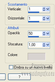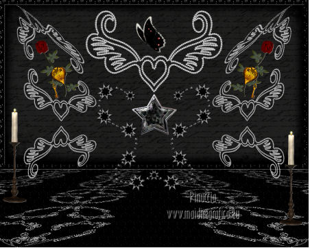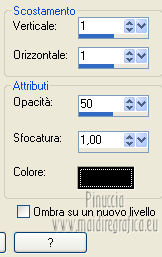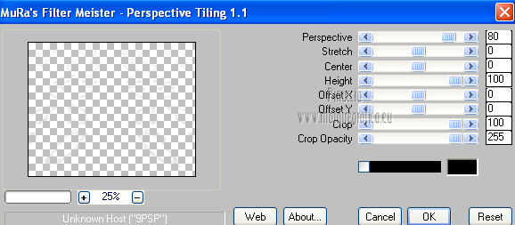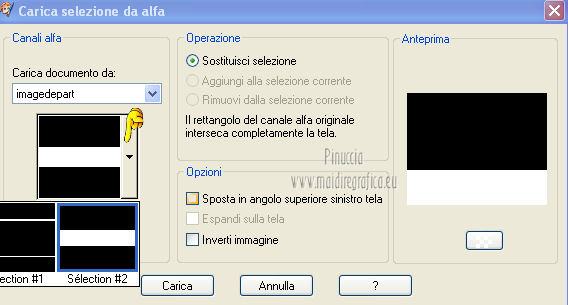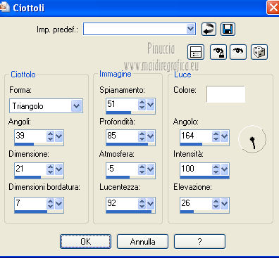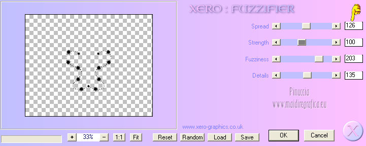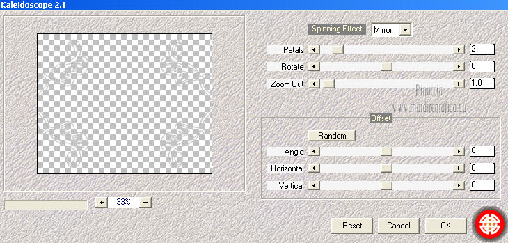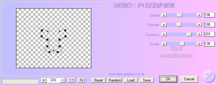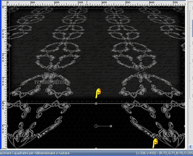 qui puoi trovare qualche risposta ai tuoi dubbi. Se l'argomento che ti interessa non è presente, ti prego di segnalarmelo. Per tradurre questo tutorial ho usato PSP X. Questo tutorial è una creazione di ©Titoune e non può essere copiato su altri siti nè essere offerto per il download. Lo stesso vale per la mia traduzione. Grazie ai creatori dei tubes che mettono a disposizione il loro lavoro in vari gruppi di condivisione. Rispetta il lavoro degli autori, non cambiare il nome del file e non cancellare il watermark. Occorrente: Un tube a scelta. Il resto del materiale qui Il tube utilizzato è di Graça Macêdo Gli elementi scrap sono una creazione CDO Scrap Kit Designers Filtri Simple - Zoom out and Flip qui Simple - Left Right Wrap (bonus) qui Mehdi - Kaleidoscope 2.1 qui Mura's Meister - Perspective Tiling qui Xero - Fuzzifier qui Animation Shop qui ![]() 1. Apri "Image Départ". Questa immagine, che sarà la base del tuo lavoro, non è vuota, ma contiene due selezioni salvate sul canale alfa. Riempi l'immagine con il colore nero.2. Selezione>Carica/Salva selezione>Carica selezione da canale alfa. La selezione "selection#1" è subito disponibile. Devi soltanto cliccare Carica. ![]() Selezione>Innalza selezione a livello. 3. Effetti>Effetti di trama>Ciottoli. ![]() Effetti>Effetti di bordo>Aumenta. 4. Effetti>Effetti 3D>Smusso a incasso. ![]() Selezione>Deseleziona. 5. Effetti>Effetti 3D>Sfalsa ombra, con il colore #d8d3d0. ![]() 6. Attiva il livello Raster 1 (nero). Selezione>Carica/Salva selezione>Carica selezione da canale alfa. Apri il menu delle selezioni e carica "selection#2". ![]() Selezione>Innalza selezione a livello. 7. Effetti>Effetti di trama>Ciottoli, con i settaggi precedenti. Abbassa l'opacità di questo livello al 50%. Selezione>Deseleziona. 8. Attiva il livello Selezione innalzata. Clicca al centro con la bacchetta magica ![]() Selezione>Modifica>Contrai - 10 pixels. Selezione>Modifica>Sfuma - 20 pixels. 9. Livelli>Nuovo livello raster. Livelli>Disponi>Sposta giù. 10. Apri l'elemento p01_YouAreAddOn_Schnegge e vai a Modifica>Copia. Torna al tuo lavoro e vai a Modifica>Incolla nella selezione. Abbassa l'opacità di questo livello al 15%. Selezione>Deseleziona. 11. Attiva il livello superiore. Apri l'elemento swirl_YouAreAddOn_Schnegge e vai a Modifica>Copia. Torna al tuo lavoro e vai a Modifica>Incolla come nuovo livello. 12. Effetti>Effetti di immagine>Scostamento. ![]() 13. Effetti>Plugins>Simple - Left Right Wrap. 14. Effetti>Plugins>Mehdi - Kaleidoscope 2.1. ![]() 15. Effetti>Plugins>Simple - Zoom out and flip. 16. Effetti>Effetti geometrici>Cerchio. ![]() 17. Effetti>Plugins>Simple - Left Right Wrap. Livelli>Duplica e chiudi questo livello. Attiva il livello sottostante dell'originale. 18. Effetti>Plugins>Mura's Meister - Perspective Tiling. ![]() 19. Se non visualizzi i righelli, vai a Visualizza>Righelli. Attiva lo strumento Puntatore ![]() deformazione se stai usando PSP 9,oppure premi sulla tastiera il tasto D (valido per tutte le versioni), in modalità Scala, spingi il nodo centrale superiore verso il basso fino a 410 pixels. Nella barra inferiore puoi controllare la posizione. ![]() ![]() Regola>Messa a fuoco>Metti a fuoco. Premi il tasto M per deselezionare lo strumento. 20. Apri e attiva il livello superiore Copia di Raster 3. 21. Attiva lo strumento Selezione a mano libera , da punto a punto,e seleziona il motivo in basso. ![]() Premi sulla tastiera il tasto CANC. Selezione>Deseleziona. Risultato. ![]() 22. Attiva nuovamente l'elemento swirl_YouAreAddOn_Schnegge e vai a Modifica>Copia. Torna al tuo lavoro e vai a Modifica>Incolla come nuovo livello. 23. Immagine>Ridimensiona, al 75%, tutti i livelli non selezionato. 24. Effetti>Effetti di immagine>Scostamento. ![]() 25. Apri l'elemento flower02_YouAreAddOn_Schnegge e vai a Modifica>Copia. Torna al tuo lavoro e vai a Modifica>Incolla come nuovo livello. 26. Immagine>Ridimensiona, al 35%, tutti i livelli non selezionato. Spostalo a sinistra.![]() 27. Effetti>Effetti di riflesso>Specchio rotante. ![]() 28. Effetti>Effetti 3D>Sfalsa ombra, con i settaggi precedenti. 29. Apri l'elemento candle_YouAreAddOn_Schnegge e vai a Modifica>Copia. Torna al tuo lavoro e vai a Modifica>Incolla come nuovo livello. 30. Immagine>Ridimensiona, al 55%, tutti i livelli non selezionato. Spostalo in basso a sinistra.31. Effetti>Effetti 3D>Sfalsa ombra, con i settaggi precedenti. Livelli>Duplica. Sposta questa candela in basso a destra.Vedi l'esempio finale. 32. Apri l'elemento butterfly_YouAreAddOn_Schnegge e vai a Modifica>Copia. Torna al tuo lavoro e vai a Modifica>Incolla come nuovo livello. 33. Immagine>Ridimensiona, al 35%, tutti i livelli non selezionato. Spostalo in alto, come nel mio esempio.34. Effetti>Effetti 3D>Sfalsa ombra, con i settaggi precedenti. 35. Apri l'elemento star_YouAreAddOn_Schnegge e vai a Modifica>Copia. Torna al tuo lavoro e vai a Modifica>Incolla come nuovo livello. 36. Immagine>Ridimensiona, al 55%, tutti i livelli non selezionato. Posiziona la stella come nell'esempio.![]() 37. Effetti>Effetti 3D>Sfalsa ombra, con i settaggi precedenti. 38. Apri l'elemento titoune_accentsstarchains e vai a Modifica>Copia. Torna al tuo lavoro e vai a Modifica>Incolla come nuovo livello. Spostalo in basso, come nel mio esempio.![]() 39. Effetti>Effetti 3D>Sfalsa ombra, con il colore nero. ![]() Rinomina questo livello "animazione". 40. Apri il tuo tube e vai a Modifica>Copia. Torna al tuo lavoro e vai a Modifica>Incolla come nuovo livello. Immagine>Ridimensiona, se e quanto necessario, tutti i livelli non selezionato. Sposta il tube in basso,vedi il mio esempio. 41. Effetti>Effetti 3D>Sfalsa ombra, con i settaggi precedenti. 42. Livelli>Nuovo livello raster. Riempi con il colore bianco.Selezione>Seleziona tutto. Selezione>Modifica>Contrai - 1 pixel. Premi sulla tastiera il tasto CANC. Selezione>Deseleziona. Firma il tuo lavoro. 43. Attiva il livello "animazione". Livelli>Duplica - 2 volte. Rimani posizionato sul
