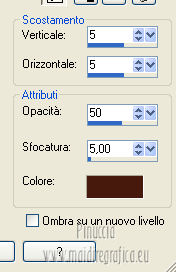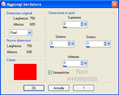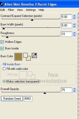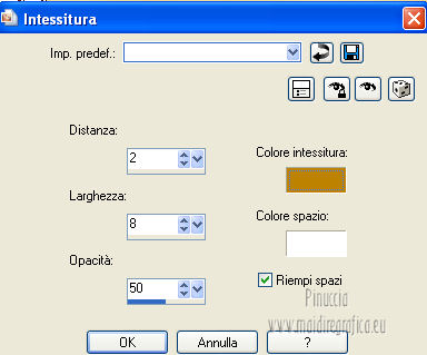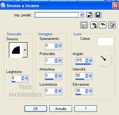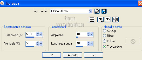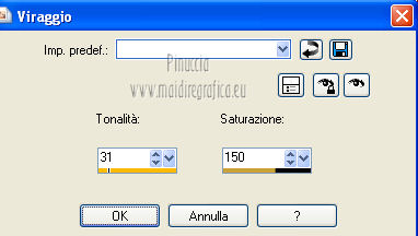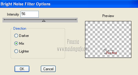 qui puoi trovare qualche risposta ai tuoi dubbi. Se l'argomento che ti interessa non č presente, ti prego di segnalarmelo. Per tradurre questo tutorial ho usato PSP X. Questo tutorial č una creazione di ŠTitoune e non puō essere copiato su altri siti nč essere offerto per il download. Lo stesso vale per la mia traduzione. Grazie ai creatori dei tubes che mettono a disposizione il loro lavoro in vari gruppi di condivisione. Rispetta il lavoro degli autori, non cambiare il nome del file e non cancellare il watermark. Occorrente: Materiale qui Tubes ed elementi di Zezette2 Filtri: Adjust - Variations qui Alien Skin Xenofex 2.0 - Burnt Edges qui DSB Flux - Bright Noise qui Animation Shop qui ![]() Salva il preset per Variations "adjust_je_crois_pere_noel.AVA" in una cartella a tua scelta. Lo importerai da questa cartella quando ti servirā. 1. Imposta il colore di primo piano con #f5e9c7. Apri una nuova immagine trasparente 750 x 600 pixels, e riempila con il colore di primo piano.2. Effetti>Effetti di trama>Intessitura - colore bc8200. colore intessitura #bc8200 - riempi spazi colore bianco. ![]() Selezione>Seleziona tutto. 3. Apri l'elemento e2763d67 e vai a Modifica>Copia. Torna al tuo lavoro e vai a Modifica>Incolla come nuovo livello. 4. Regola>Tonalitā e saturazione>Viraggio. ![]() 5. Effetti>Effetti di immagine>Scostamento. ![]() Rinomina questo livello "Motivo". 6. Selezione>Seleziona tutto. Selezione>Mobile. Selezione>Immobilizza. Selezione>Modifica>Contrai - 75 pixels. Selezione>Modifica>Sfuma - 80 pixels.br> 7. Livelli>Nuovo livello raster. Apri l'elemento e8a80ab8 (il camino) e vai a Modifica>Copia. Torna al tuo lavoro e vai a Modifica>Incolla nella selezione. Selezione>Deseleziona. 8. Attiva nuovamente il livello "motivo". Selezione>Seleziona tutto. Selezione>Mobile. Selezione>Immobilizza. 9. Selezione>Modifica>Seleziona bordature selezione. ![]() 10. Attiva il livello Raster 1. Selezione>Innalza selezione a livello. Livelli>Disponi>Porta in alto. 11. Effetti>Effetti 3D>Smusso a incasso. ![]() 12. Effetti>Plugins>Adjust - Variations. Clicca su Load e cerca nella cartella in cui lo hai salvato il preset adjust_je_crois_pere_noel, Apri. ![]() Nella finestra del filtro ok per confermare. Selezione>Deseleziona. 13. Attiva il livello del camino. Selezione>Seleziona tutto. Selezione>Mobile. Selezione>Immobilizza. Selezione>Inverti. 14. Effetti>Effetti 3D>Sfalsa ombra, con il colore #47190f. ![]() Ripeti l'Effetto Sfalsa ombra, cambiando verticale e orizzontale con -5. 15. Attiva ancora il livello "motivo". Effetti>Effetti 3D>Sfalsa ombra, con i settaggi precedenti. Selezione>Deseleziona. 16. Attiva il livello del camino. Livelli>Duplica. Effetti>Plugins>Alien Skin Xenofex 2.0 - Burnt Edges. Colore #a08240. ![]() 17. Effetti>Effetti di distorsione>Increspa. ![]() 18. Apri l'elemento 86e42439 (babbo natale) e vai a Modifica>Copia. Torna al tuo lavoro e vai a Modifica>Incolla come nuovo livello. Spostalo a sinistra,vedi l'esempio finale. 19. Effetti>Effetti 3D>Sfalsa ombra, con il colore #47190f. ![]() 20. Apri l'elemento 38e7c766 (le due palline dorate) e vai a Modifica>Copia. Torna al tuo lavoro e vai a Modifica>Incolla come nuovo livello. Spostalo in basso a destra.Nessun Effetto Sfalsa ombra. ![]() Livelli>Duplica. Immagine>Rifletti. Posiziona correttamente le palline a sinistra.![]() 21. Apri l'elemento ff9c0194 (3 palline oro) e vai a Modifica>Copia. Torna al tuo lavoro e vai a Modifica>Incolla come nuovo livello. 22. Effetti>Effetti 3D>Sfalsa ombra, con il colore #47190f. ![]() 23. Apri l'elemento 076d45e7 (3 palline) e vai a Modifica>Copia. Torna al tuo lavoro e vai a Modifica>Incolla come nuovo livello. Spostalo in alto a sinistra.![]() Effetti>Effetti 3D>Sfalsa ombra, con i settaggi precedenti. 24. Apri l'elemento a0aa875b (orologio) e vai a Modifica>Copia. Torna al tuo lavoro e vai a Modifica>Incolla come nuovo livello. Spostalo in alto a destra.Vedi l'esempio finale. Effetti>Effetti 3D>Sfalsa ombra, con i settaggi precedenti. 25. Immagine>Aggiungi bordatura, 3 pixels, simmetriche, con un colore contrastante. ![]() Selezione>Seleziona tutto. Selezione>Modifica>Contrai - 3 pixels. Selezione>Inverti. Riempi con il colore di primo piano.Effetti>Effetti di trama>Intessitura, con i settaggi precedenti. Effetti>Effetti 3D>Smusso a incasso, con i settaggi precedenti. Effetti>Plugins>Adjust - Variations, con i settaggi precedenti. Selezione>Deseleziona. 26. Apri il tube wordart, che č composto da due livelli. Attiva il livello "texte" e vai a Modifica>Copia. Torna al tuo lavoro e vai a Modifica>Incolla come nuovo livello. Spostalo in basso,vedi l'esempio finale. Rinomina questo livello "animazione". 27. Attiva nuovamente il tube wordart e copia il livello "Motif". Torna al tuo lavoro e vai a Modifica>Incolla come nuovo livello. Spostalo a destra del testo,vedi l'esempio finale. Firma il tuo lavoro. 28. Animazione. Attiva il livello "animazione". Livelli>Duplica - 2 volte e rimani posizionato sul livello della seconda copia. 29. Effetti>Plugins>Dsb Flux - Bright Noise. ![]() Chiudi questo livello e attiva il livello sottostante della prima copia. 30. Effetti>Plugins>Dsb Flux - Bright Noise, clicca sul pallino di Mix per cambiare l'aspetto del disturbo e ok. Chiudi il livello e attiva il livello "animazione. 31. Effetti>Plugins>Dsb Flux - Bright Noise, clicca sul pallino di Mix per cambiare l'aspetto del disturbo e ok. Lascia il livello visibile. 32. Modifica>Copia Unione. Apri Animation Shop e vai a Modifica>Incolla>Incolla come nuova animazione. 33. Torna in PSP. Chiudi il livello "animazione" e apri il livello della prima copia. Modifica>Copia Unione. Torna in Animation Shop e vai a Modifica>Incolla>Incolla dopo il fotogramma corrente. 34. Di nuovo in PSP. Chiudi il livello della prima copia e apri il livello della seconda copia. Modifica>Copia Unione. In Animation Shop: Modifica>Incolla>Incolla dopo il fotogramma corrente. Ed ecco la tua animazione composta da 3 fotogrammi. C