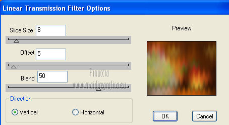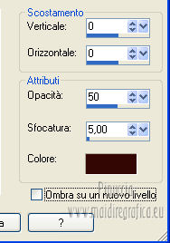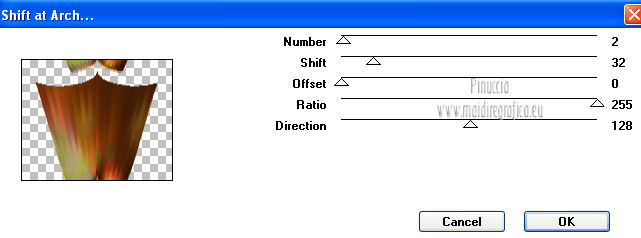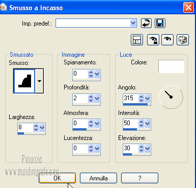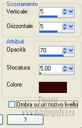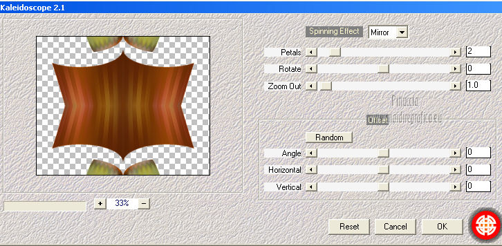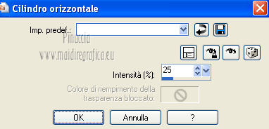 qui puoi trovare qualche risposta ai tuoi dubbi. Se l'argomento che ti interessa non è presente, ti prego di segnalarmelo. Per tradurre questo tutorial ho usato PSP X. Questo tutorial è una creazione di ©Titoune e non può essere copiato su altri siti nè essere offerto per il download. Lo stesso vale per la mia traduzione. Grazie ai creatori dei tubes che mettono a disposizione il loro lavoro in vari gruppi di condivisione. Rispetta il lavoro degli autori, non cambiare il nome del file e non cancellare il watermark. Occorrente: Un tube a scelta. Il resto del materiale qui Il tube utilizzato è di Criss. Tubes ed elementi condivisi sul sito di Zezette 2. Animation Shop qui Filtri DSB Flux - Linear Transmission qui Mura's Seamless - Shift At Arch qui Mehdi - Kaleidoscope 2.1 qui Adjust - Variations qui ![]() 1. Apri una nuova immagine trasparente 750 x 600 pixels. Selezione>Seleziona tutto. Apri l'elemento c41fe3a7 e vai a Modifica>Copia. Torna al tuo lavoro e vai a Modifica>Incolla nella selezione. Selezione>Deseleziona. Selezione>Modifica>Contrai - 35 pixels. 2. Regola>Sfocatura>Sfocatura gaussiana - raggio 25. ![]() 3. Effetti>Plugins>DSB Flux - Linear Transmission. ![]() 4. Selezione>Innalza selezione a livello. Selezione>Deseleziona. 5. Effetti>Effetti geometrici>Prospettiva verticale. ![]() Effetti>Effetti di bordo>Aumenta. 6. Effetti>Effetti geometrici>Cilindro orizzontale. ![]() 7. Effetti>Plugins>Mura's Seamless - Shift At Arch, con i settaggi standard. ![]() 8. Effetti>Plugins>Mehdi - Kaleidoscope 2.1. ![]() 9. Attiva il livello Raster 1. Selezione>Seleziona tutto. Selezione>Modifica>Contrai - 35 pixels. Selezione>Inverti. Selezione>Innalza selezione a livello. Livelli>Disponi>Porta in alto. 10. Effetti>Effetti 3D>Smusso a incasso. ![]() Selezione>Deseleziona. 11. Effetti>Effetti 3D>Sfalsa ombra, con il colore #340706. ![]() Ripeti l'Effetto Sfalsa ombra, cambiando verticale e orizzontale con -5. 12. Attiva il livello sottostante. Effetti>Effetti 3D>Sfalsa ombra, con i settaggi precedenti. 13. Attiva il livello superiore. Apri l'elemento df9483eb_cadre e vai a Modifica>Copia. Torna al tuo lavoro e vai a Modifica>Incolla come nuovo livello. Spostalo un po' più in alto.![]() 14. Attiva lo strumento Bacchetta magica , modalità Aggiungi,e clicca al centro delle due cornici per selezionarle. Selezione>Modifica>Espandi - 5 pixels. Livelli>Nuovo livello raster. Livelli>Disponi>Sposta giù. 15. Attiva nuovamente l'immagine del paesaggio c41fe3a7 e vai a Modifica>Copia. Torna al tuo lavoro e vai a Modifica>Incolla nella selezione. Selezione>Deseleziona. Rinomina questo livello "animazione". 16. Attiva il livello della cornice. Effetti>Effetti 3D>Sfalsa ombra, con i settaggi precedenti. 17. Apri l'elemento f2f747c4 (cappello e pacchetti) e vai a Modifica>Copia. Torna al tuo lavoro e vai a Modifica>Incolla come nuovo livello. Spostalo in basso a sinistra.Vedi il risultato finale. Effetti>Effetti 3D>Sfalsa ombra, con i settaggi precedenti. 18. Apri l'elemento cdcc5a14 (la carta) e vai a Modifica>Copia. Torna al tuo lavoro e vai a Modifica>Incolla come nuovo livello. Spostalo in basso a destra.Vedi il risultato finale. Effetti>Effetti 3D>Sfalsa ombra, con i settaggi precedenti. 19. Apri l'elemento 9bdd1a68 (l'angolo) e vai a Modifica>Copia. Torna al tuo lavoro e vai a Modifica>Incolla come nuovo livello. Spostalo in alto a sinistra.Vedi il risultato finale. 20. Effetti>Effetti di riflesso>Specchio rotante. ![]() Effetti>Effetti 3D>Sfalsa ombra, con i settaggi precedenti. 21. Apri l'elemento 1246f276_boules_rouge_or e vai a Modifica>Copia. Torna al tuo lavoro e vai a Modifica>Incolla come nuovo livello. Spostalo a sinistra, come nel mio esempio.![]() 22. Effetti>Effetti 3D>Sfalsa ombra, con il colore #340706. ![]() 23. Apri il tuo tube e vai a Modifica>Copia. Torna al tuo lavoro e vai a Modifica>Incolla come nuovo livello. Immagine>Ridimensiona, se e quanto necessario, tutti i livelli non selezionato. Posiziona come preferisci,o vedi il mio esempio. 24. Effetti>Effetti 3D>Sfalsa ombra, con il colore #340706. ![]() Ripeti l'Effetto Sfalsa ombra, cambiando verticale e orizzontale con -5. Firma il tuo lavoro. 25. Animazione. Attiva il livello "animazione". Livelli>Duplica - 2 volte. Lascia invariato il livello della seconda copia e chiudilo. Attiva il livello sottostante della prima copia. Effetti>Plugins>Adjust - Variations, un clic su Original, un clic su Lighter e ok. Chiudi il livello e attiva il livello originale "animazione". Effetti>Plugins>Adjust - Variations, un clic su Original, un clic su Lighter e ok. Lasia il livello visibile. Modifica>Copia Unione. Apri Animation Shop e vai a Modifica>Incolla>Incolla come nuova animazione. 26. Torna in Psp. Chiudi il livello "animazione" e apri il livello della prima copia. Modifica>Copia Unione. Torna in Animation Shop e vai a Modifica>Incolla>Incolla dopo il fotogramma corrente. 27. Di nuovo in PSP. Chiudi il livello il livello della prima copia e apri il livello della seconda copia. Modifica>Copia Unione. In Animation Shop: Modifica>Incolla>Incolla dopo il fotogramma corrente. Ed ecco la tua animazione composta da 3 fotogrammi. Clicca sul primo fotogramma per selezionarlo e vai a Modifica>Seleziona tutto. Apri l'immagine "wordart_joyeux_noel", anche questa composta da tre fotogrammi. Modifica>Seleziona tutto. Modifica>Copia. Attiva il tuo lavoro e vai a Modifica>Incolla>Incolla nel fotogramma selezionato. Posiziona il testo sulla carta. Animazione>Proprietà fotogramma e imposta la velocità a 25. ![]() Controlla il risultato cliccando su Visualizza ![]() e salva in formato gif. ![]() Se hai problemi o dubbi, o trovi un link non funzionante, o anche soltanto per un saluto, scrivimi. 2 Dicembre 2012 |
