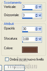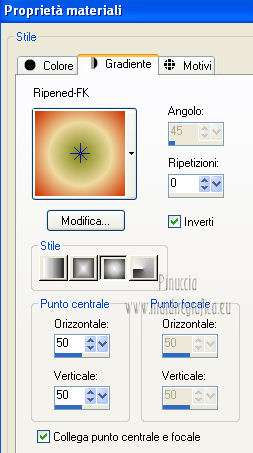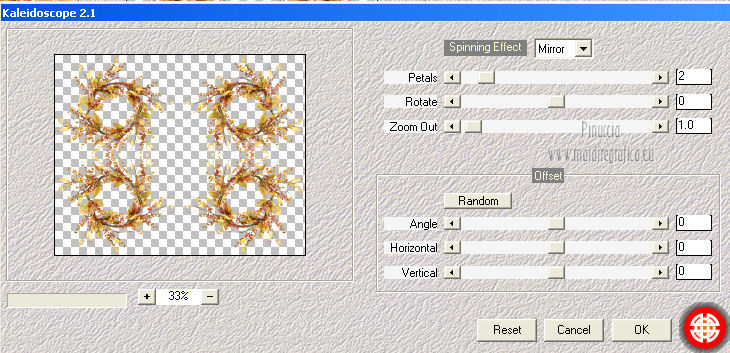 qui puoi trovare qualche risposta ai tuoi dubbi. Se l'argomento che ti interessa non č presente, ti prego di segnalarmelo. Per tradurre questo tutorial ho usato PSP X. Questo tutorial č una creazione di ŠTitoune e non puō essere copiato su altri siti nč essere offerto per il download. Lo stesso vale per la mia traduzione. Grazie ai creatori dei tubes che mettono a disposizione il loro lavoro in vari gruppi di condivisione. Rispetta il lavoro degli autori, non cambiare il nome del file e non cancellare il watermark. Occorrente: Un tube a scelta. Il resto del materiale qui Il tube che ho usato č di Nicky. Filtri: Mehdi - Kaleidoscope 2.1 qui ![]() Metti il gradiente Ripened-FK nella cartella Gradienti. 1. Apri una nuova immagine trasparente 750 x 600 pixels. Passa il colore di primo piano a Gradiente, e seleziona il gradiente Ripened-FK con i seguenti settaggi. ![]() Riempi l'immagine trasparente con il gradiente.2. Apri l'elemento miz11-tsoa-ele15 e vai a Modifica>Copia. Torna al tuo lavoro e vai a Modifica>Incolla come nuovo livello. Spostalo nell'angolo in alto a sinistra.![]() 3. Effetti>Plugins>Mehdi - Kaleidoscope 2.1. ![]() 4. Effetti>Effetti 3D>Sfalsa ombra, con il colore #663f30. ![]() Ripeti l'Effetto Sfalsa ombra, cambiando verticale e orizzontale con -3. Rinomina questo livello "mehdi". 5. Apri l'elemento miz11-tsoa-ele26 e vai a Modifica>Copia. Torna al tuo lavoro e vai a Modifica>Incolla come nuovo livello. Spostalo leggermente pių in alto.Vedi l'esempio finale. 6. Attiva lo strumento Bacchetta magica ![]() e clicca al centro della cornice per selezionarla. Attiva il livello Mehdi. Premi sulla tastiera il tasto CANC. 7. Selezione>Modifica>Espandi - 5 pixels. Livelli>Nuovo livello raster. 8. Apri l'immagine 6sous-bois e vai a Modifica>Copia. Torna al tuo lavoro e vai a Modifica>Incolla nella selezione. Selezione>Deseleziona. 9. Attiva nuovamente il livello della cornice. Effetti>Effetti 3D>Sfalsa ombra, con i settaggi precedenti. 10. Apri l'elemento miz11-tsoa-ele19 e vai a Modifica>Copia. Torna al tuo lavoro e vai a Modifica>Incolla come nuovo livello. Spostalo in basso.Effetti>Effetti 3D>Sfalsa ombra, con i settaggi precedenti. 11. Apri l'elemento miz11-tsoa-ele02 e vai a Modifica>Copia. Torna al tuo lavoro e vai a Modifica>Incolla come nuovo livello. Immagine>Rifletti. Spostalo in basso a sinistra.![]() Effetti>Effetti 3D>Sfalsa ombra, con i settaggi precedenti. 12. Effetti>Effetti di riflesso>Specchio rotante. ![]() Effetti>Effetti 3D>Sfalsa ombra, con i settaggi precedenti. 13. Apri l'elemento miz11-tsoa-ele14 e vai a Modifica>Copia. Torna al tuo lavoro e vai a Modifica>Incolla come nuovo livello. Spostalo in basso a sinistra.Vedi l'esempio finale. Effetti>Effetti 3D>Sfalsa ombra, con i settaggi precedenti. 14. Apri l'elemento miz11-tsoa-ele13 e vai a Modifica>Copia. Torna al tuo lavoro e vai a Modifica>Incolla come nuovo livello. Spostalo in basso a destra.Effetti>Effetti 3D>Sfalsa ombra, con i settaggi precedenti. 15. Apri l'elemento miz11-tsoa-ele24 e vai a Modifica>Copia. Torna al tuo lavoro e vai a Modifica>Incolla come nuovo livello. Spostalo in basso a sinistra.![]() Effetti>Effetti di riflesso>Specchio rotante, con i settaggi precedenti. Effetti>Effetti 3D>Sfalsa ombra, con i settaggi precedenti. 16. Apri l'elemento miz11-tsoa-ele22 e vai a Modifica>Copia. Torna al tuo lavoro e vai a Modifica>Incolla come nuovo livello. Spostalo in alto a sinistra.Vedi l'esempio finale. Effetti>Effetti 3D>Sfalsa ombra, con i settaggi precedenti. 17. Apri l'elemento miz11-tsoa-ele16 e vai a Modifica>Copia. Torna al tuo lavoro e vai a Modifica>Incolla come nuovo livello. Spostalo in alto a destra.Effetti>Effetti 3D>Sfalsa ombra, con i settaggi precedenti. 18. Apri l'elemento miz11-tsoa-ele12 e vai a Modifica>Copia. Torna al tuo lavoro e vai a Modifica>Incolla come nuovo livello. Immagine>Rifletti. Spostalo a sinistra al centro.![]() Effetti>Effetti di riflesso>Specchio rotante, con i settaggi precedenti. Effetti>Effetti 3D>Sfalsa ombra, con i settaggi precedenti. 19. Attiva il livello Raster 1. Apri l'elemento "titoune_bordure_lady_autumn" e vai a Modifica>Copia. Torna al tuo lavoro e vai a Modifica>Incolla come nuovo livello. Effetti>Effetti 3D>Sfalsa ombra, con i settaggi precedenti. 20. Attiva il livello della cornice. Apri il tuo tube e vai a Modifica>Copia. Torna al tuo lavoro e vai a Modifica>Incolla come nuovo livello. Immagine>Ridimensiona, se e quanto necessario, tutti i livelli non selezionato. Spostalo a sinistra, come nel mio esempio.21. Effetti>Effetti 3D>Sfalsa ombra, con il colore #663f30. ![]() Firma il tuo lavoro. Livelli>Unisci>Unisci tutto e salva in formato jpg. ![]() Se hai problemi o dubbi, o trovi un link non funzionante, o anche soltanto per un saluto, scrivimi. 10 Ottobre 2012 |