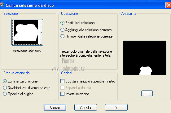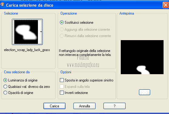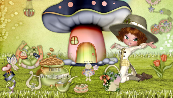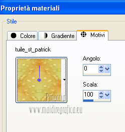 qui puoi trovare qualche risposta ai tuoi dubbi. Se l'argomento che ti interessa non è presente, ti prego di segnalarmelo. Per tradurre questo tutorial ho usato PSP X. Questo tutorial è una creazione di ©Titoune e non può essere copiato su altri siti nè essere offerto per il download. Lo stesso vale per la mia traduzione. Il tutorial è stato creato con PSP X5, ma può essere eseguito anche con le altre versioni di PSP. Per tradurlo, ho usato PSP X. Grazie ai creatori dei tubes che mettono a disposizione il loro lavoro in vari gruppi di condivisione. Rispetta il lavoro degli autori, non cambiare il nome del file e non cancellare il watermark. Occorrente: Un tube a scelta. Il resto del materiale qui Il tube utilizzato è di Medi Gli elementi scrap sono una creazione Digicats(and dogs) Filtri: Simple - Left Right Wrap (bonus) qui Penta.com - Jeans qui Tramages - Tow the line qui ![]() Metti le selezioni nella cartella Selezioni. 1. Apri una nuova immagine trasparente 750 x 600 pixels. Selezione>Seleziona tutto. 2. Apri l'elemento DCD_LaBu_Paper02 e vai a Modifica>Copia. Torna al tuo lavoro e vai a Modifica>Incolla nella selezione. Selezione>Deseleziona. 3. Selezione>Carica/Salva selezione>Carica selezione da disco. Cerca e carica la selezione "selection_scrap_lady_luck_grass". ![]() 4. Livelli>Nuovo livello raster. Apri il tube titoune_grass e vai a Modifica>Copia. Torna al tuo lavoro e vai a Modifica>Incolla nella selezione. Selezione>Deseleziona. Rinomina questo livello "erba". 5. Selezione>Carica/Salva selezione>Carica selezione da disco. Cerca e carica la selezione "selection_scrap_lady_luck_grass2". ![]() per il mio esempio la selezione non corrispondeva correttamente alla mia area di lavoro. Per questo ho usato questa selezione ![]() Selezione>Innalza selezione a livello. 6. Effetti>Effetti di trama>Trama - seleziona la trama Calcestruzzo, con i seguenti settaggi. Colore #e5edb1. se stai usando le versioni più recenti di PSP la trama Calcestruzzo corrisponde alla trama Corel_15_036. ![]() Livelli>Disponi>Sposta giù. Rinomina questo livello "sentiero". Mantieni selezionato. 7. Attiva il livello "erba". Premi sulla tastiera il tasto CANC. 8. Attiva nuovamente il livello "sentiero". Selezione>Carica/Salva selezione>Carica selezione da disco. Cerca e carica la selezione "selection_scrap_lady_luck_grass3". ![]() Selezione>Innalza selezione a livello. Livelli>Disponi>Porta in alto. Selezione>Deseleziona. 9. Effetti>Effetti 3D>Smusso a incasso. ![]() 10. Effetti>Effetti 3D>Sfalsa ombra, con il colore #383e10. ![]() Ripeti l'Effetto Sfalsa ombra, cambiando verticale e orizzontale con -3. 11. Apri l'elemento DCD_LaBu_Mushroom House e vai a Modifica>Copia. Torna al tuo lavoro e vai a Modifica>Incolla come nuovo livello. Spostalo all'inizio del sentiero.Vedi l'esempio finale. Effetti>Effetti 3D>Sfalsa ombra, con i settaggi precedenti. 12. Apri l'elemento titoune_grass2 e vai a Modifica>Copia. Torna al tuo lavoro e vai a Modifica>Incolla come nuovo livello. Spostalo in basso.![]() Effetti>Effetti 3D>Sfalsa ombra, con i settaggi precedenti. Livelli>Duplica. Sposta questo elemento dietro la casa.Nella paletta dei livelli porta questo livello sotto il livello "erba". ![]() 13. Attiva il livello superiore. Apri l'elemento DCD_LaBu_Rainbow e vai a Modifica>Copia. Torna al tuo lavoro e vai a Modifica>Incolla come nuovo livello. Spostalo in alto.Effetti>Effetti 3D>Sfalsa ombra, con i settaggi precedenti. Nella paletta dei livelli porta questo livello sotto il livello della casa. ![]() 14. Apri l'elemento DCD_LaBu_Cloud e vai a Modifica>Copia. Torna al tuo lavoro e vai a Modifica>Incolla come nuovo livello. Livelli>Disponi>Porta in alto. Sposta l'elemento in alto a sinistra.Vedi l'esempio finale. Effetti>Effetti 3D>Sfalsa ombra, con i settaggi precedenti. 15. Apri l'elemento DCD_LaBu_Bunting e vai a Modifica>Copia. Torna al tuo lavoro e vai a Modifica>Incolla come nuovo livello. Spostalo in alto.![]() Effetti>Plugins>Simple - Left Right Wrap. E avrai questo. ![]() Effetti>Effetti 3D>Sfalsa ombra, con i settaggi precedenti. 16. Apri l'elemento DCD_LaBu_Color Swirl e vai a Modifica>Copia. Torna al tuo lavoro e vai a Modifica>Incolla come nuovo livello. Spostalo a destra.Vedi l'esempio finale. Effetti>Effetti 3D>Sfalsa ombra, con i settaggi precedenti. 17. Apri l'elemento DCD_LaBu_Hot Air Balloon e vai a Modifica>Copia. Torna al tuo lavoro e vai a Modifica>Incolla come nuovo livello. Spostalo in alto a sinistra.Vedi l'esempio finale. Effetti>Effetti 3D>Sfalsa ombra, con i settaggi precedenti. Nella paletta dei livelli porta questo livello sotto le bandiere. ![]() 18. Attiva il livello superiore. Apri l'elemento DCD_LaBu_Flower02 e vai a Modifica>Copia. Torna al tuo lavoro e vai a Modifica>Incolla come nuovo livello. Spostalo in basso a destra.Vedi l'esempio finale. Effetti>Effetti 3D>Sfalsa ombra, con i settaggi precedenti. 19. Apri l'elemento DCD_LaBu_Pot of Gold e vai a Modifica>Copia. Torna al tuo lavoro e vai a Modifica>Incolla come nuovo livello. Spostalo in basso.Vedi l'esempio finale. Effetti>Effetti 3D>Sfalsa ombra, con i settaggi precedenti. 20. Apri l'elemento DCD_LaBu_Pipe e vai a Modifica>Copia. Torna al tuo lavoro e vai a Modifica>Incolla come nuovo livello. Spostalo in basso.Vedi l'esempio finale. Effetti>Effetti 3D>Sfalsa ombra, con i settaggi precedenti. 21. Apri l'elemento DCD_LaBu_Harp e vai a Modifica>Copia. Torna al tuo lavoro e vai a Modifica>Incolla come nuovo livello. Sposta anche questo elemento in basso.![]() Effetti>Effetti 3D>Sfalsa ombra, con i settaggi precedenti. 22. Apri l'elemento DCD_LaBu_Love Flower e vai a Modifica>Copia. Torna al tuo lavoro e vai a Modifica>Incolla come nuovo livello. Spostalo in basso a sinistra.Vedi l'esempio finale. Effetti>Effetti 3D>Sfalsa ombra, con i settaggi precedenti. 23. Apri l'elemento DCD_LaBu_Leprechaun in Horseshoe e vai a Modifica>Copia. Torna al tuo lavoro e vai a Modifica>Incolla come nuovo livello. Spostalo a sinistra.![]() Effe