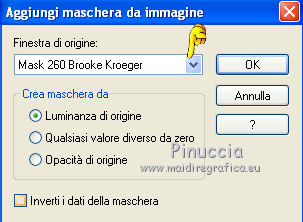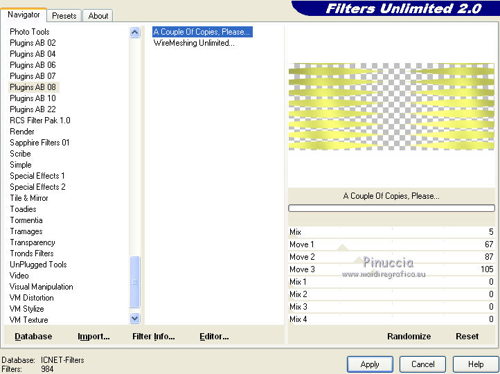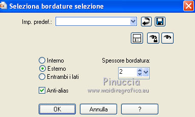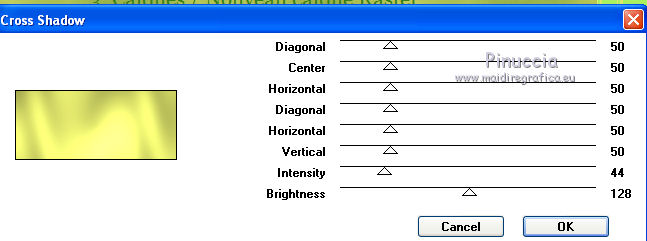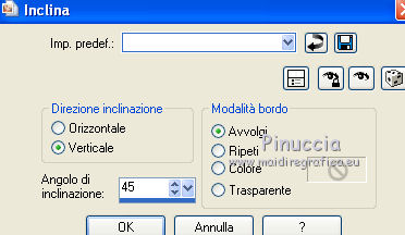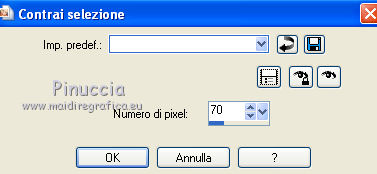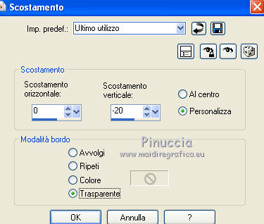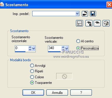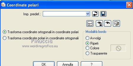qui puoi trovare qualche risposta ai tuoi dubbi. Se l'argomento che ti interessa non è presente, ti prego di segnalarmelo. Per tradurre questo tutorial ho usato PSP X. Questo tutorial è una creazione di ©Titoune e non può essere copiato su altri siti nè essere offerto per il download. Lo stesso vale per la mia traduzione. Il materiale viene da vari gruppi di condivisione. Il copyright appartiene ai rispettivi autori. Grazie ai creatori dei tubes che mettono a disposizione il loro lavoro in vari gruppi di condivisione. Occorrente: Materiale qui Il tube usato è di Karine Dreams Rispetta il lavoro degli autori, non cambiare il nome del file e non cancellare il watermark. Filtri: consulta, se necessario, la mia sezione filtri qui Graphics Plus - Cross Shadow qui Andromeda Perspective qui Filters Unlimited 2.0 qui AB Plugins AB08 - A couple of Copies,Please qui ![]() Apri la maschera in PSP e minimizzala con il resto del materiale. 1. Imposta il colore di primo piano con #dadf69, e il colore di sfondo con #7fa140. 2. Apri una nuova immagine trasparente 1280 x 550 pixels, e riempila con il colore di sfondo.3. Livelli>Nuovo livello raster. Riempi con il colore di primo piano.4. Effetti>Plugins>Graphics Plus - Cross Shadow. ![]() 5. Effetti>Plugins>Filters Unlimited 2.0 - Plugin AB 08 - A Couple of Copies,Please. ![]() Risultato. ![]() 6. Selezione>Seleziona tutto. Selezione>Modifica>Contrai - 70 pixels. ![]() Premi sulla tastiera il tasto CANC. Selezione>Inverti. 7. Effetti>Effetti 3D>Smusso a incasso. ![]() Selezione>Seleziona tutto. 8. Livelli>Duplica. Immagine>Ridimensiona, all'85%, tutti i livelli non selezionato. 9. Effetti>Plugins>Andromeda - Perspective. Clicca sull'icona Presets ![]() e imposta i seguenti settaggi. ![]() Risultato. ![]() 10. Effetti>Effetti di riflesso>Specchio rotante. ![]() 11. Effetti>Effetti geometrici>Inclina. ![]() 12. Di nuovo Effetti>Effetti di riflesso>Specchio rotante con i settaggi precedenti. Risultato. ![]() 13. Effetti>Effetti di distorsione>Coordinate polari. ![]() 14. Effetti>Effetti di immagine>Scostamento. ![]() 15. Selezione>Seleziona tutto. Selezione>Modifica>Contrai - 70 pixels. Selezione>Inverti. Premi sulla tastiera il tasto CANC. Selezione>Deseleziona. 16. Effetti>Effetti di immagine>Scostamento. ![]() 17. Attiva il livello inferiore. Selezione>Seleziona tutto. Selezione>Modifica>Contrai - 70 pixels. 18. Livelli>Nuovo livello raster. Apri il tube lizztish_citadel-reflections1 e vai a Modifica>Copia. Torna al tuo lavoro e vai a Modifica>Incolla nella selezione. Cambia la modalità di miscelatura di questo livello in Filtra. 19. Livelli>Duplica. Cambia la modalità di miscelatura di questo livello in Moltiplica. Mantieni selezionato. 20. Attiva il livello superiore. 21. Selezione>Modifica>Seleziona bordature selezione. ![]() 22. Livelli>Nuovo livello raster. Riempi con il colore di sfondo.23. Effetti>Plugins>Graphics Plus - Cross Shadow, con i settaggi precedenti. 24. Effetti>Effetti 3D>Smusso a incasso, con i settaggi precedenti. Selezione>Deseleziona. 25. Effetti>Effetti 3D>Sfalsa ombra. ![]() 26. Apri il tube k@rine_ dreams _Lady_Steampunk_1785_Juin,_2011 e vai a Modifica>Copia. torna al tuo lavoro e vai a Modifica>Incolla come nuovo livello. 27. Immagine>Ridimensiona, al 75%, tutti i livelli non selezionato. Sposta il tube a sinistra.28. Livelli>Disponi>Sposta giù. Livelli>Duplica. Livelli>Disponi>Porta in alto. 29. Attiva il livello originale. Effetti>Effetti 3D>Sfalsa ombra, con i settaggi precedenti. ![]() 30. Attiva il livello inferiore. Selezione>Seleziona tutto. Immagine>Ritaglia la selezione. 31. Immagine>Dimensioni tela - 1280 x 1500 pixels: ![]() 32. Livelli>Nuovo livello raster. Livelli>Disponi>Sposta giù. Riempi con il colore di sfondo.33. Apri una nuova immagine trasparente 1280 x 350 pixels, e riempila con il colore di primo piano.34. Livelli>Nuovo livello maschera>Da immagine. Apri il menu sotto la finestra di origine e vedrai la lista dei files aperti. Seleziona la maschera "Mask 260 Brook Kroeger". ![]() Livelli>unisci>Unisci gruppo. Modifica>Copia. Torna al tuo top e vai a Modifica>Incolla come nuovo livello. 35. Effetti>Effetti di immagine>Scostamento. ![]() 36. Effetti>Effetti 3D>Sfalsa ombra, con i settaggi precedenti. 37. Firma il tuo lavoro. Livelli>Unisci>Unisci tutto e salva in formato jpg. ![]() Se hai problemi o dubbi, o trovi un link non funzionante, o anche soltanto per un saluto, scrivimi. 7 Settembre 2011 |