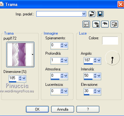 3. Effetti>Effetti di trama>Trama - seleziona la trama "purpl172" con i seguenti settaggi.