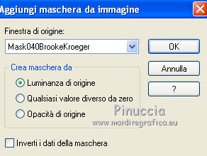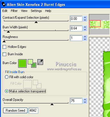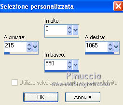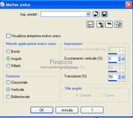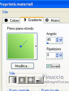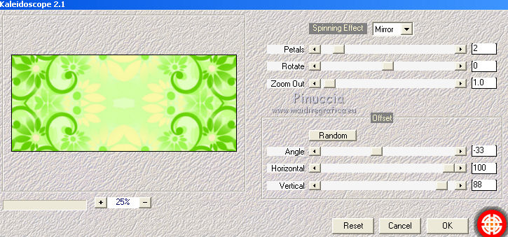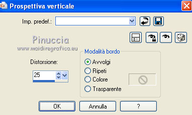 qui puoi trovare qualche risposta ai tuoi dubbi. Se l'argomento che ti interessa non è presente, ti prego di segnalarmelo. Per tradurre questo tutorial ho usato PSP X. Questo tutorial è una creazione di ©Titoune e non può essere copiato su altri siti nè essere offerto per il download. Lo stesso vale per la mia traduzione. Il materiale viene da vari gruppi di condivisione. Il copyright appartiene ai rispettivi autori. Grazie ai creatori dei tubes che mettono a disposizione il loro lavoro in vari gruppi di condivisione. Occorrente: Un tube a scelta. Il resto del materiale qui Il tube che ho usato è di Lori Rhae. Rispetta il lavoro degli autori, non cambiare il nome del file e non cancellare il watermark. Filtri: se hai problemi, ricorda di consultare la mia sezione filtri qui Mehdi - Kaleidoscope 2.1 qui Alien Skin Xenofex 2.0 - Burnt Edges qui ![]() Apri la maschera "Mask040_Brooke Kroeger" in PSP e minimizzala con il resto del materiale. 1. Imposta il colore di primo piano con #c8ff8a, e il colore di sfondo con #62b043. 2. Apri l'immagine FLORNAMBG_06. Duplicala usando la combinazione di tasti maiuscola+D e chiudi l'originale. La copia sarà la base del tuo lavoro. Livelli>Innalza livello di sfondo. 3. Effetti>Effetti di immagine>Motivo unico. ![]() 4. Immagine>Dimensioni tela - 1280 x 550 pixels. ![]() 5. Livelli>Duplica. Immagine>Rifletti. Livelli>Unisci>Unisci giù. Duplica questa immagine (maiuscola+D) e minimizza la copia che userai più tardi. 6. Effetti>Plugins>Mehdi - Kaleidoscope 2.1. ![]() 7. Selezione>Seleziona tutto. Selezione>Modifica>Contrai - 45 pixels. Selezione>Innalza selezione a livello. Selezione>Deseleziona. 8. Effetti>Plugins>Alien Skin Xenofex 2.0 - Burnt Edges - colore #66d203. ![]() 9. Effetti>Effetti geometrici>Prospettiva verticale. ![]() 10. Attiva lo strumento Selezione ,clicca sull'icona Selezione personalizzata ![]() e imposta i seguenti settaggi: ![]() 11. Livelli>Nuovo livello raster. Apri l'immagine Summer glade (2) e vai a Modifica>Copia. Torna al tuo lavoro e vai a Modifica>Incolla nella selezione. Selezione>Deseleziona. 12. Effetti>Plugins>Alien Skin Xenofex 2.0 - Constellation, con i settaggi precedenti. 13. Effetti>Effetti geometrici>Cilindro verticale. ![]() 14. Effetti>Effetti geometrici>Prospettiva verticale, con i settaggi precedenti. 15. Effetti>Effetti 3D>Sfalsa ombra, con il colore #294a0e. ![]() Ripeti l'Effetto Sfalsa ombra, cambiando verticale e orizzontale con -3. 16. Apri il tube "titoune_summer_green_corner" e vai a Modifica>Copia. Torna al tuo lavoro e vai a Modifica>Incolla come nuovo livello. 17. Attiva il livello Raster 1. Selezione>Seleziona tutto. Immagine>Ritaglia la selezione. 18. Immagine>Dimensioni tela - 1280 x 1500 pixels. ![]() 19. Livelli>Nuovo livello raster. Livelli>Disponi>Sposta giù. 20. Passa il colore di primo piano a Gradiente. ![]() Riempi il livello con il gradiente.21. Apri una nuova immagine trasparente 1280 x 350 pixels. Selezione>Seleziona tutto. 22. Attiva l'immagine che hai minimizzato prima e vai a Modifica>Copia. Torna alla seconda immagine (1280x350) e vai a Modifica>Incolla nella selezione. Selezione>Deseleziona. 23. Livelli>Nuovo livello maschera>Da immagine. Apri il menu sotto la finestra di origine e vedrai la lista dei files aperti. Seleziona la maschera Mask040BrookeKroeger. ![]() Livelli>Unisci>Unisci gruppo. Modifica>Copia. 24. Attiva il tuo top. Assicurati di essere posizionato sul livello inferiore. Modifica>Incolla come nuovo livello. 25. Effetti>Effetti di immagine>Scostamento. ![]() 26. Effetti>Effetti 3D>Sfalsa ombra, con i settaggi precedenti. Attiva il livello superiore. 27. Apri il tuo tube e vai a Modifica>Copia. Torna al tuo lavoro e vai a Modifica>Incolla come nuovo livello. 28. Immagine>Ridimensiona, se e quanto necessario. Posiziona correttamente il tube.29. Effetti>Effetti 3D>Sfalsa ombra, con i settaggi precedenti. 30. Apri il tube "titoune_bordure_fleurs" e vai a Modifica>Copia. Torna al tuo lavoro e vai a Modifica>Incolla come nuovo livello. Spostalo in basso come nel mio esempio.31. Effetti>Effetti 3D>Sfalsa ombra, con i settaggi precedenti. 32. Apri il tube SparklieButterflies_PMS, che è composto da diversi livelli. Attiva il livello Layer 4 e vai a Modifica>Copia. Torna al tuo lavoro e vai a Modifica>Incolla come nuovo livello. Immagine>Ridimensiona, al 90%, tutti i livelli non selezionato. Se necessario, colorizza. Spostalo a sinistra, o dove preferisci.33. Effetti>Effetti 3D>Sfalsa ombra, con i settaggi precedenti. Firma il tuo top. 34. Livelli>Unisci>Unisci visibile e salva in formato jpg. ![]() ![]() Se hai problemi o dubbi, o trovi un link non funzionante, o anche soltanto per un saluto, scrivimi. 19 Giugno 2011 |