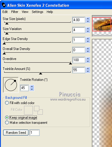 Effetti>Plugins>Alien Skin Xenofex 2.0 - Constellation, con gli stessi settaggi, ma clicca su Random Seed.