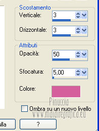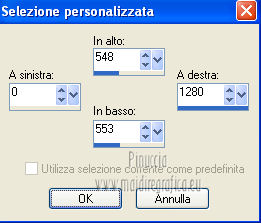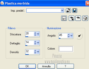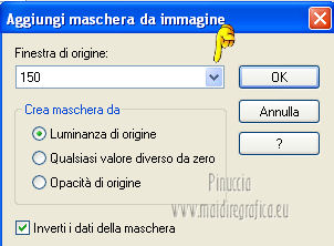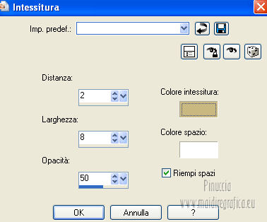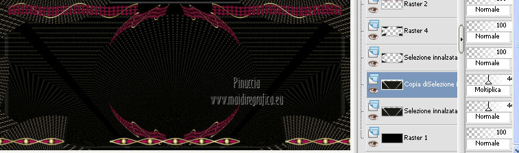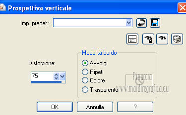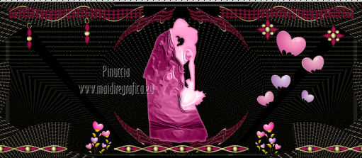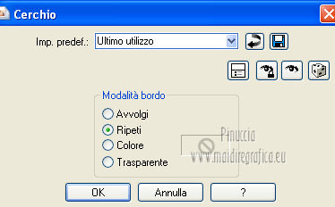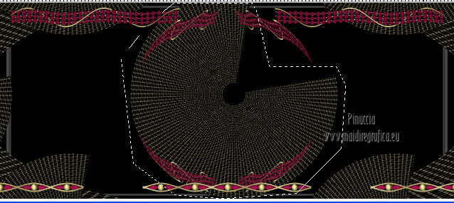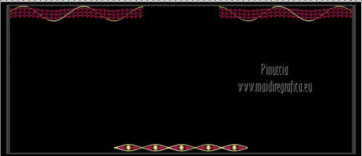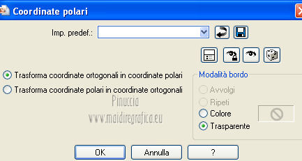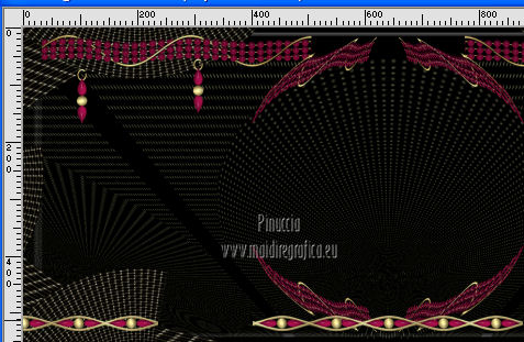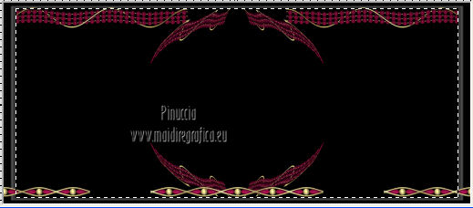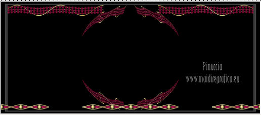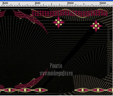 qui puoi trovare qualche risposta ai tuoi dubbi. Se l'argomento che ti interessa non è presente, ti prego di segnalarmelo. Per tradurre questo tutorial ho usato PSP X. Questo tutorial è una creazione di ©Titoune e non può essere copiato su altri siti nè essere offerto per il download. Lo stesso vale per la mia traduzione. Questo tutorial è stato creato con PSP X5. Secondo la versione utilizzata (anteriore a PSP X, si possono ottenere risultati differenti. Per tradurre questo tutorial ho usato PSP X. Grazie ai creatori dei tubes che mettono a disposizione il loro lavoro in vari gruppi di condivisione. Rispetta il lavoro degli autori, non cambiare il nome del file e non cancellare il watermark. Occorrente: Un tube a scelta. Il resto del materiale qui Il tube utilizzato è di Yvonne. Filtri: Simple - Left Right Wrap (bonus) qui Simple - Diamonds qui i filtri Simple si possono usare da soli o importati in Filters Unlimited. ![]() Apri la maschera in PSP e minimizzala con il resto del materiale. 1. Imposta il colore di primo piano con #d55e9d, e il colore di sfondo con il colore nero. 2. Apri l'immagine top_ALPKit Traedrops, che è composta da vari livelli. Attiva il livello Raster 1 e vai a Modifica>Copia. 3. Apri una nuova immagine trasparente 1280 x 550 pixels. Selezione>Seleziona tutto. Modifica>Incolla nella selezione. Selezione>Deseleziona. 4. Attiva nuovamente l'immagine top_ALPKit Traedrops. Attiva il livello "bordure1" e vai a Modifica>Copia. Torna al tuo lavoro e vai a Modifica>Incolla come nuovo livello. Sposta il bordo in alto a sinistra.![]() 5. Effetti>Effetti di riflesso>Specchio rotante. ![]() 6. Attiva ancora l'immagine top_ALPKit Traedrops. Attiva il livello "bordure" e vai a Modifica>Copia. Torna al tuo lavoro e vai a Modifica>Incolla come nuovo livello. Sposta il bordo in basso.![]() Livelli>Duplica. Attiva il livello sottostante dell'originale. Effetti>Plugins>Simple - Left Right Wrap. Dovresti avere questo. ![]() 7. Attiva il livello sottostante (bordure1). ![]() Livelli>Duplica. 8. Effetti>Effetti geometrici>Cerchio. ![]() Livelli>Duplica. Immagine>Capovolgi. Dovresti avere questo. ![]() 9. Attiva il livello inferiore. Attiva lo strumento Bacchetta magica ![]() ![]() Clicca al centro ![]() Selezione>Innalza selezione a livello. 10. Effetti>Effetti di trama>Intessitura - colore #c9b880. ![]() Selezione>Deseleziona. 11. Immagine>Ridimensiona, all'85%, tutti i livelli non selezionato. 12. Effetti>Effetti di distorsione>Coordinate polari. ![]() 13. Attiva lo strumento Selezione a mano libera ![]() e seleziona il motivo centrale ![]() Modifica>Taglia (questo comando, oltre a tagliare, tiene anche in memoria). Selezione>Deseleziona. Modifica>Incolla come nuovo livello. Effetti>Plugins>Simple - Diamonds. 14. Attiva nuovamente lo strumento Selezione a mano libera ![]() e seleziona il motivo centrale. ![]() Premi sulla tastiera il tasto CANC. Selezione>Deseleziona. 15. Effetti>Effetti di riflesso>Specchio rotante con i settaggi precedenti. 16. Attiva il livello inferiore. 17. Attiva lo strumento Bacchetta magica ![]() e clicca al centro. ![]() Selezione>Innalza selezione a livello. 18. Imposta il colore di primo piano con #ffffcc. A destra seleziona Trama. Cerca e imposta la trama Griglia con i seguenti settaggi. se stai usando versioni più recenti di PSP la trama corrisponde a Corel_15_006 ![]() Riempi la selezione con il colore+trama.19. Effetti>Effetti di distorsione>Coordinate polari. ![]() Selezione>Deseleziona. 20. Effetti>Effetti geometrici>Prospettiva verticale. ![]() Abbassa l'opacità di questo livello al 44%. 21. Livelli>Duplica. Cambia la modalità di miscelatura di questo livello in Moltiplica. ![]() 22. Attiva il livello superiore. Attiva nuovamente l'immagine top_ALPKit Traedrops. Attiva il livello "deco1" e vai a Modifica>Copia. Torna al tuo lavoro e vai a Modifica>Incolla come nuovo livello. Spostalo in alto a sinistra.Vedi l'esempio finale. Livelli>Duplica. Posiziona il duplicato come nell'esempio.![]() 23. Attiva ancora l'immagine top_ALPKit Traedrops. Attiva il livello "deco3" e vai a Modifica>Copia. Torna al tuo lavoro e vai a Modifica>Incolla come nuovo livello. Spostalo in alto a destra.Vedi l'esempio finale. Livelli>Duplica. Posiziona il duplicato come nell'esempio.![]() 24. Apri l'elemento 28c52426 (coppia) e vai a Modifica>Copia. Torna al tuo lavoro e vai a Modifica>Incolla come nuovo livello. Spostalo al centro.Vedi l'esempio finale. Selezione>Seleziona tutto. Selezione>Mobile. Selezione>Immobilizza. Livelli>Nuovo livello raster. Riempi con il colore di primo piano #d55e9d.Selezione>Modifica>Contrai - 2 pixels. 25. Livelli>Nuovo livello raster. Apri l'immagine 2531188525_1 e vai a Modifica>Copia. Torna al tuo lavoro e vai a Modifica>Incolla nella selezione. Cambia la modalità di miscelatura di questo livello in Luminanza (esistente). 26. Effetti>Effetti di trama>Plastica morbida. ![]() Selezione>Deseleziona. 27. Apri l'elemento 0_57de9_dbb55d6f_XL e vai a Modifica>Copia. Torna al tuo lavoro e vai a Modifica>Incolla come nuovo livello. Spostalo a destra.Vedi l'esempio finale. 28. Apri l'elemento 0_57de8_4514f14f_XL e vai a Modifica>Copia. Torna al tuo lavoro e vai a Modifica>Incolla come nuovo livello. Spostalo in basso a sinistra.Vedi l'esempio finale. Livelli>Duplica. Immagine>Rifletti. Posiziona correttamente il duplicato in basso a destra.![]() 29. Apri il tuo tube e vai a Modifica>Copia. Torna al tuo lavoro e vai a Modifica>Incolla come nuovo livello. Immagine>Ridimensiona, se e quanto necessario, tutti i livelli non selezionato. Spostalo dove preferisci, o vedi il mio esempio.30. Effetti>Effetti 3D>Sfalsa ombra, con il colore #d55e9d. ![]() 31. Attiva il livello inferiore. Selezione>Seleziona tutto. Immagine>Ritaglia la selezione. 32. Immagine>Dimensioni tela. ![]() 33. Livelli>Nuovo livello raster. Livelli>Disponi>Sposta giù. Riempi con il colore nero.34. Apri una nuova immagine trasparente 1280 x 350 pixels e riempila con il colore nero