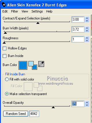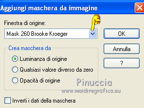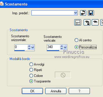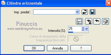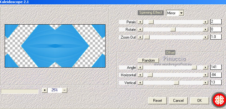 qui puoi trovare qualche risposta ai tuoi dubbi. Se l'argomento che ti interessa non č presente, ti prego di segnalarmelo. Per tradurre questo tutorial ho usato PSP X. Questo tutorial č una creazione di ŠTitoune e non puō essere copiato su altri siti nč essere offerto per il download. Lo stesso vale per la mia traduzione. Il materiale viene da vari gruppi di condivisione. Il copyright appartiene ai rispettivi autori. Grazie ai creatori dei tubes che mettono a disposizione il loro lavoro in vari gruppi di condivisione. Occorrente: Un tube a scelta. Il resto del materiale qui Il tube utilizzato č di ©Adam Burne Rispetta il lavoro degli autori, non cambiare il nome del file e non cancellare il watermark. Filtri: consulta, se necessario, la mia sezione filtri qui Alien Skin Xenofex 2.0 - Burnt Edges qui Mehdi - Kaleidoscope 2.1 qui Filters Unlimited 2.0 qui Plugins AB07 - Bits Over the Place qui ![]() Apri la maschera Mask_260_Brooke_Kroeger in PSP e minimizzala con il resto del materiale. 1. Imposta il colore di primo piano con #a6e2fa, e il colore di sfondo con #0085da. Passa il colore di primo piano a Gradiente, con i seguenti settaggi. ![]() 2. Apri una nuova immagine trasparente 1280 x 550 pixels, e riempila con il gradiente.3. Effetti>Plugins>Filters Unlimited 2.0 - Plugin AB07 - Bits Over The Place. ![]() 4. Effetti>Effetti di riflesso>Specchio rotante. ![]() Livelli>Duplica. 5. Immagine>Ridimensiona, all'85%, tutti i livelli non selezionato. Effetti>Effetti di bordo>Aumenta. 6. Effetti>Plugins>Mehdi - Kaleidoscope 2.1. ![]() 7. Attiva il livello inferiore. Livelli>Nuovo livello raster. Selezione>Seleziona tutto. 8. Apri l'immagine Beach3 e vai a Modifica>Copia. Torna al tuo lavoro e vai a Modifica>Incolla nella selezione. Mantieni selezionato. 9. Attiva il livello superiore. Selezione>Mobile. Selezione>Immobilizza. Selezione>Modifica>Contrai - 2 pixels. 10. Livelli>Nuovo livello raster. Apri l'immagine Beach5 e vai a Modifica>Copia. Torna al tuo lavoro e vai a Modifica>Incolla nella selezione. Selezione>Deseleziona. Livelli>Duplica. 11. Effetti>Plugins>Alien Skin Xenofex 2.0 - Burnt Edges. colore #0085da. ![]() Livelli>Unisci>Unisci gių - 2 volte. 12. Effetti>Effetti geometrici>Cilindro orizzontale. ![]() 13. Effetti>Effetti geometrici>Cilindro verticale. ![]() 14. Effetti>Effetti 3D>sfalsa ombra, con il colore #254f91. ![]() Ripeti l'Effetto Sfalsa ombra, cambiando verticale e orizzontale con -3. 15. Apri il tube G081209_klq, che č composto da vari elementi. E' stato creato volontariamente un livello per ogni elemento. Seleziona gli elementi scelti e vai a Modifica>Copia. Torna al tuo lavoro e vai a Modifica>Incolla come nuovo livello. Disponi gli elementi come preferisci.Gli elementi del mio esempio sono stati cosė ridimensionati: "soleil", "planche", all'85%. "etoile_de_mer" al 45%. "chaise_parasol_seau" al 110%. "tongs", "ballon" al 50%. 16. Su ciascun livello: Effetti>Effetti 3D>Sfalsa ombra, con i settaggi precedenti. 17. Apri il tuo tube e vai a Modifica>Copia. Torna al tuo lavoro e vai a Modifica>Incolla come nuovo livello. 18. Immagine>Ridimensiona, se e quanto necessario. Posiziona correttamente il tube.19. Effetti>Effetti 3D>sfalsa ombra, con i settaggi precedenti. 20. Attiva il livello Raster 1. Selezione>Seleziona tutto. Immagine>Ritaglia la selezione. 21. Immagine>Dimensioni tela - 1280 x 1500 pixels. ![]() 22. Livelli>Nuovo livello raster. Livelli>Disponi>Porta sotto. Riempi con il colore di primo piano.23. Apri una nuova immagine trasparente 1280 x 350 pixels. Selezione>Seleziona tutto. 24. Apri l'immagine Beach3 e vai a Modifica>Copia. Torna all'immagine 1280x350 e vai a Modifica>Incolla nella selezione. Selezione>Deseleziona. 25. Livelli>Nuovo livello maschera>Da immagine. Apri il menu sotto la finestra di origine e vedrai la lista dei files aperti. Tra questi la maschera. Seleziona la maschera Mask260_Brooke Kroeger, con i seguenti settaggi: ![]() Livelli>Unisci>Unisci gruppo. Modifica>Copia. Attiva il tuo top e vai a Modifica>Incolla come nuovo livello. 26. Effetti>Effetti di immagine>Scostamento. ![]() 27 Effetti>Effetti 3D>Sfalsa ombra, con il colore #254f91. ![]() Ripeti l'Effetto Sfalsa ombra, cambiando verticale e orizzontale con -1. Firma il tuo lavoro. 28. Livelli>Unisci>Unisci tutto e salva in formato jpg. ![]() ![]() Se hai problemi o dubbi, o trovi un link non funzionante, o anche soltanto per un saluto, scrivimi. 18 Agosto 2011 |