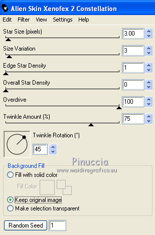 Effetti>Plugins>Alien Skin Xenofex 2.0 - Constellation, con i settaggi precedenti e con gli stessi settaggi e cliccando su Random Seed.