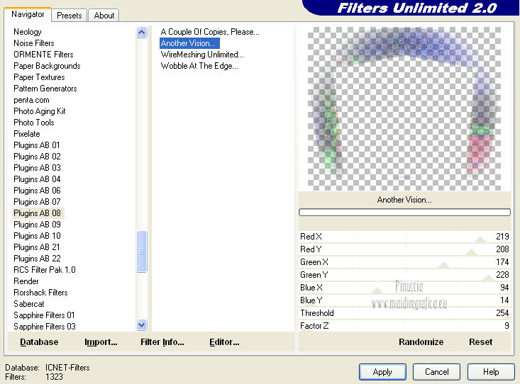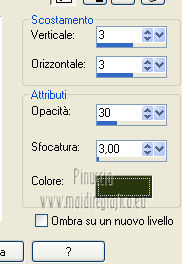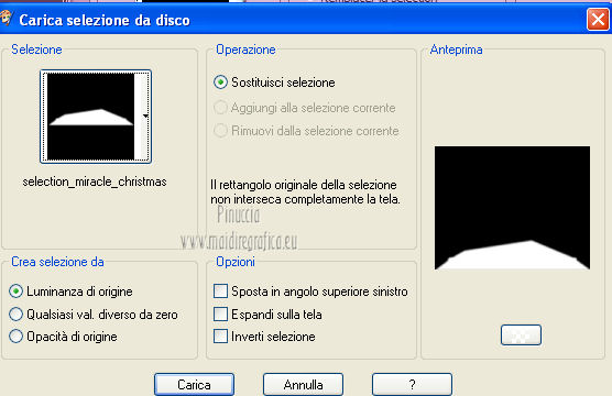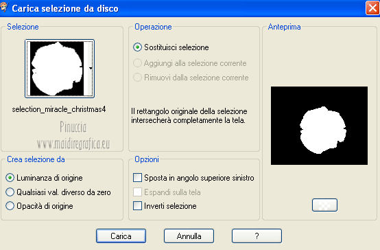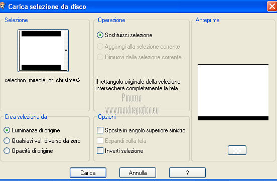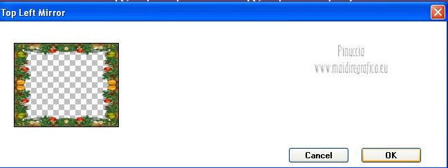 qui puoi trovare qualche risposta ai tuoi dubbi. Se l'argomento che ti interessa non è presente, ti prego di segnalarmelo. Per tradurre questo tutorial ho usato PSP X. Questo tutorial è una creazione di ©Titoune e non può essere copiato su altri siti nè essere offerto per il download. Lo stesso vale per la mia traduzione. Grazie ai creatori dei tubes che mettono a disposizione il loro lavoro in vari gruppi di condivisione. Rispetta il lavoro degli autori, non cambiare il nome del file e non cancellare il watermark. Occorrente: Un tube a scelta. Il resto del materiale qui Gli elementi scrap utilizzati sono una creazione http://cullenarydelights.blogspot.com/ Cullenary Delights Filtri Filters Unlimited 2.0 qui Penta.com - Jeans qui Plugins AB08 - Another vision qui Simple - Top Left Mirror qui Animation Shop qui ![]() Metti le selezioni nella cartella Selezioni. 1. Apri una nuova immagine trasparente 750 x 600 pixels. Selezione>Seleziona tutto. 2. Apri l'elemento cob2ee28 e vai a Modifica>Copia. Torna al tuo lavoro e vai a Modifica>Incolla nella selezione. Selezione>Deseleziona. 3. Immagine>Ridimensiona, al 75%, tutti i livelli non selezionato. 4. Effetti>Effetti di immagine>Scostamento. ![]() 5. Effetti>Plugins>Simple - Top Left Mirror. ![]() 6. Selezione>Carica/Salva selezione>Carica selezione da disco. Cerca e carica la selezione "selection_miracle_christmas". ![]() Premi tre volte sulla tastiera il tasto CANC. Selezione>Deseleziona. 7. Apri l'elemento titouneneige e vai a Modifica>Copia. Torna al tuo lavoro e vai a Modifica>Incolla come nuovo livello. Spostalo sul bordo inferiore.Livelli>Disponi>Sposta giù. 8. Attiva il livello superiore. Selezione>Carica/Salva selezione>Carica selezione da disco. Cerca e carica la selezione "selection_miracle_christmas2". ![]() 9. Livelli>Nuovo livello raster. Apri l'immagine del paesaggio N44 e vai a Modifica>Copia. Torna al tuo lavoro e vai a Modifica>Incolla nella selezione. Selezione>Disponi>Sposta giù. 10. Selezione>Carica/Salva selezione>Carica selezione da disco. Cerca e carica la selezione "selection_miracle_christmas3". ![]() Selezione>Innalza selezione a livello. 11. Regola>Sfocatura>Sfocatura gaussiana - raggio 25. ![]() 12. Effetti>Plugins>Filters Unlimited 2.0 - Plugins AB08 - Another Vision, con i settaggi standard. ![]() Selezione>Deseleziona. Effetti>Effetti di bordo>Aumenta. 13. Attiva il livello superiore. Apri l'elemento 118a4ac6 e vai a Modifica>Copia. Torna al tuo lavoro e vai a Modifica>Incolla come nuovo livello. Posiziona il tube come nel mio esempio.14. Effetti>Effetti 3D>Sfalsa ombra, con il colore #29380f. ![]() Ripeti l'Effetto Sfalsa ombra, cambiando verticale e orizzontale con -3. 15. Apri l'elemento DBS_Lights e vai a Modifica>Copia. Torna al tuo lavoro e vai a Modifica>Incolla come nuovo livello. Spostalo in alto a sinistra.![]() 16. Effetti>Effetti di riflesso>Specchio rotante. ![]() Effetti>Effetti 3D>Sfalsa ombra, con i settaggi precedenti. 17. Apri l'elemento DBS_Tree_n_Gifts e vai a Modifica>Copia. Torna al tuo lavoro e vai a Modifica>Incolla come nuovo livello. Spostalo in basso a destra.Vedi l'esempio finale. Effetti>Effetti 3D>Sfalsa ombra, con i settaggi precedenti. 18. Apri l'elemento DBS_Gifts04 e vai a Modifica>Copia. Torna al tuo lavoro e vai a Modifica>Incolla come nuovo livello. Spostalo in basso.![]() Effetti>Effetti 3D>Sfalsa ombra, con i settaggi precedenti. 19. Apri l'elemento word_christmas e vai a Modifica>Copia. Torna al tuo lavoro e vai a Modifica>Incolla come nuovo livello. Spostalo in alto a destra.Vedi l'esempio finale. Effetti>Effetti 3D>Sfalsa ombra, con i settaggi precedenti. 20. Apri il tuo tube e vai a Modifica>Copia. Torna al tuo lavoro e vai a Modifica>Incolla come nuovo livello. Immagine>Ridimensiona, se e quanto necessario, tutti i livelli non selezionato. Spostalo dove preferisci,o vedi l'esempio finale. Effetti>Effetti 3D>Sfalsa ombra, con i settaggi precedenti. Decora lo scrap a tuo piacimento. 21. Assicurati di essere posizionato sul livello superiore. Selezione>Seleziona tutto. Apri l'elemento DBS_Paper14 e vai a Modifica>Copia. Torna al tuo lavoro e vai a Modifica>Incolla nella selezione. 22. Selezione>Modifica>Contrai - 2 pixels. Premi sulla tastiera il tasto CANC. Selezione>Inverti. Effetti>Plugins>Penta.com - Jeans, con i settaggi standard. ![]() 23. Effetti>Effetti 3D>Smusso a incasso. ![]() 24. Attiva il livello inferiore. Selezione>Seleziona tutto. Immagine>Ritaglia la selezione. 25. Immagine>Dimensioni tela - 800 x 650 pixels. ![]() 26. Livelli>Nuovo livello raster. Livelli>Disponi>Sposta giù. Selezione>Seleziona tutto. 27. Attiva nuovamente l'immagine del paesaggio N44. Attiva lo strumento Selezione , rettangolo,e seleziona una parte dell'immagine (che ti servirà da trama). Modifica>Copia (puoi chiudere l'immagine senza salvare le modifiche). Torna al tuo lavoro e vai a Modifica>Incolla nella selezione. è naturale che non avendo selezionato la mia stessa porzione dell'immagine, il risultato della cornice non potrà essere uguale al mio esempio 28. Effetti>Effetti di immagine>Motivo unico, con i settaggi standard. ![]() 29. Effetti>Effetti di trama>Veneziana. ![]() 30. Effetti>Effetti di distorsione>Coordinate polari. ![]() 31. Attiva nuovamente il livello superiore. Selezione>Seleziona tutto. 32. Apri l'elemento DBS_Paper14 e vai a Modifica>Copia. Torna al tuo lavoro e vai a Modifica>Incolla nella selezione. Selezione>Modifica>Contrai - 2 pixels. Premi sulla tastiera il tasto CANC. Selezione>Inverti. 33. Effetti>Plugins>Penta.com - Jeans, con i settaggi standard. ![]() 34. Effetti>Effetti 3D>Smusso a incasso, con i settaggi precedenti. Selezione>Deseleziona. 35. Apri l'elemento titoune_coins_miracle_christmas e vai a Modifica>Copia. Torna al tuo lavoro e vai a Modifica>Incolla come nuovo livello. Firma il tuo lavoro. 36. Animazione. Attiva il livello della cornice. Selezione>Carica/Salva selezione>Carica selezione da disco. Cerca e carica la selezione "selection