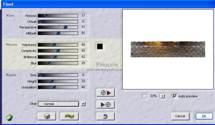 Effetti>Plugins>Flaming Pear - Flood - clicca sull'icona dell'onda e ok.