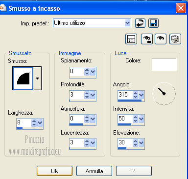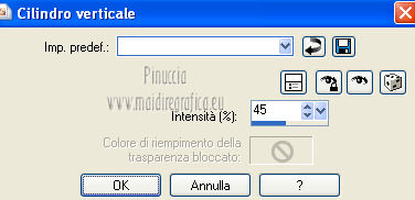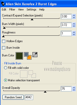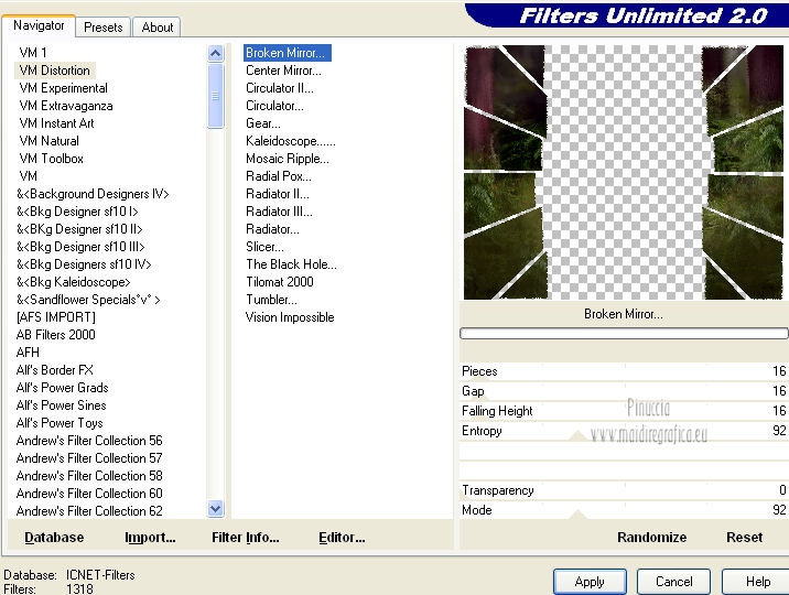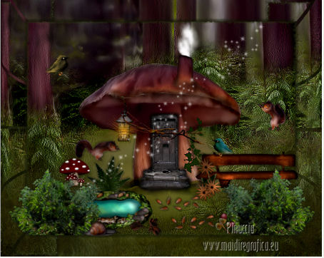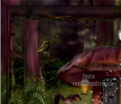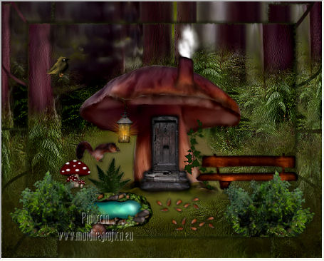qui puoi trovare qualche risposta ai tuoi dubbi. Se l'argomento che ti interessa non è presente, ti prego di segnalarmelo. Per tradurre questo tutorial ho usato PSP X. Questo tutorial è una creazione di ©Titoune e non può essere copiato su altri siti nè essere offerto per il download. Lo stesso vale per la mia traduzione. Grazie ai creatori dei tubes che mettono a disposizione il loro lavoro in vari gruppi di condivisione. Rispetta il lavoro degli autori, non cambiare il nome del file e non cancellare il watermark. Occorrente: Un tube a scelta. Il resto del materiale qui Gli elementi scrap utilizzati sono una creazione http://elves-of-rosegarden.blogspot.ch/ Sternenmaus Scrapkit Filtri Filters Unlimited 2.0 qui VM Distortion qui Alien Skin Xenofex 2.0 - Burn Edges qui ![]() Metti la selezione "selection_scrap_mysterious_forest" nella cartella Selezioni. 1. Apri una nuova immagine trasparente 750 x 600 pixels. Selezione>Seleziona tutto. 2. Apri paper4a e vai a Modifica>Copia. Torna al tuo lavoro e vai a Modifica>Incolla nella selezione. Selezione>Deseleziona. 3. Livelli>Duplica. Chiudi il livello della copia, e attiva il livello sottostante dell'originale. 4. Selezìone>Carica/Salva selezione>Carica selezione da disco. Cerca e carica la selezione "selection_scrap_mysterious_forest". ![]() Selezione>innalza selezione a livello. Effetti>Effetti di bordo>Aumenta. Selezione>Deseleziona. 5. Effetti>Plugins>Alien Skin Xenofex 2.0 - Burnt Edges - colore #2d3811. ![]() 6. Effetti>Plugins>Filters Unlimited 2.0 - VM Distortion - Broken Mirror, con i settaggi standard. ![]() 7. Effetti>Effetti geometrici>Cilindro verticale. ![]() 8. Effetti>Effetti 3D>Sfalsa ombra - colore #111306. ![]() Ripeti l'Effetto Sfalsa ombra, cambiando verticale e orizzontale con -5. 9. Apri e attiva il livello della copia. Immagine>Ridimensiona, all'85%, tutti i livelli non selezionato. Effetti>Effetti di bordo>Aumenta. 10. Effetti>Plugins>Alien Skin Xenofex 2.0 - Burnt Edges, con i settaggi precedenti. Effetti>Effetti 3D>Sfalsa ombra, con i settaggi precedenti. 11. Apri l'elemento pilzhaus e vai a Modifica>Copia. Torna al tuo lavoro e vai a Modifica>Incolla come nuovo livello. Spostalo un po' più in alto.Attiva lo strumento Gomma ![]() e cancella la base del tube in modo da fonderla con il paesaggio. Dovresti avere questo. ![]() 12. Effetti>Effetti 3D>Sfalsa ombra, colore #111306. ![]() Ripeti l'Effetto Sfalsa ombra, cambiando verticale e orizzontale con -3. 13. Apri l'elemento busch e vai a Modifica>Copia. Torna al tuo lavoro e vai a Modifica>Incolla come nuovo livello. Spostalo in basso a sinistra,vedi il risultato finale. 14. Effetti>Effetti di riflesso>Specchio rotante. ![]() Effetti>Effetti 3D>Sfalsa ombra, con i settaggi precedenti. 15. Apri l'elemento teich, e vai a Modifica>Copia. Torna al tuo lavoro e vai a Modifica>Incolla come nuovo livello. Spostalo in basso a sinistra,vedi l'esempio finale. Effetti>Effetti 3D>Sfalsa ombra, con i settaggi precedenti. Livelli>Disponi>Sposta giù. 16. Apri l'elemento bank e vai a Modifica>Copia. Torna al tuo lavoro e vai a Modifica>Incolla come nuovo livello. Spostalo in basso a destra.Vedi l'esempio finale. Effetti>Effetti 3D>Sfalsa ombra, con i settaggi precedenti. Livelli>Disponi>Sposta giù. 17. Attiva il livello superiore. Apri l'elemento pilz3, e vai a Modifica>Copia. Torna al tuo lavoro e vai a Modifica>Incolla come nuovo livello. Spostalo a sinistra.Vedi l'esempio finale. Effetti>Effetti 3D>Sfalsa ombra, con i settaggi precedenti. Livelli>Disponi>Sposta giù. 18. Apri l'elemento farn1, e vai a Modifica>Copia. Torna al tuo lavoro e vai a Modifica>Incolla come nuovo livello. Spostalo a sinistra.Vedi l'esempio finale. Effetti>Effetti 3D>Sfalsa ombra, con i settaggi precedenti. 19. Apri l'elemento eichhoernchen1 e vai a Modifica>Copia. Torna al tuo lavoro e vai a Modifica>Incolla come nuovo livello. Spostalo a sinistra.Vedi l'esempio finale. Effetti>Effetti 3D>Sfalsa ombra, con i settaggi precedenti. 20. Apri l'elemento vogel1 e vai a Modifica>Copia. Torna al tuo lavoro e vai a Modifica>Incolla come nuovo livello. Spostalo a sinistra.Vedi l'esempio finale. Livelli>Disponi>Sposta giù. Effetti>Effetti 3D>Sfalsa ombra, con i settaggi precedenti. 21. Apri l'elemento schnecke e vai a Modifica>Copia. Torna al tuo lavoro e vai a Modifica>Incolla come nuovo livello. Spostalo in basso a sinistra.Vedi l'esempio finale. Effetti>Effetti 3D>Sfalsa ombra, con i settaggi precedenti. 22. Attiva il livello superiore. Apri l'elemento bucheckern e vai a Modifica>Copia. Torna al tuo lavoro e vai a Modifica>Incolla come nuovo livello. Spostalo a sinistra.Vedi l'esempio finale. Effetti>Effetti 3D>Sfalsa ombra, con i settaggi precedenti. Livelli>Duplica, e posiziona il duplicato come nell'esempio.![]() 23. Apri l'elemento deko1 e vai a Modifica>Copia. Torna al tuo lavoro e vai a Modifica>Incolla come nuovo livello. Spostalo in basso.Vedi l'esempio finale. Effetti>Effetti 3D>Sfalsa ombra, con i settaggi precedenti. 24. Apri l'elemento eicheln e vai a Modifica>Copia. Torna al tuo lavoro e vai a Modifica>Incolla come nuovo livello. Spostalo in basso a destra.Vedi l'esempio finale. Effetti>Effetti 3D>Sfalsa ombra, con i settaggi precedenti. 25. Apri l'elemento blume4 e vai a Modifica>Copia. Torna al tuo lavoro e vai a Modifica>Incolla come nuovo livello. Spostalo sulla panchina.Vedi l'esempio finale. Effetti>Effetti 3D>Sfalsa ombra, con i settaggi precedenti. 26. Apri l'elemento blume3 e vai a Modifica>Copia. Torna al tuo lavoro e vai a Modifica>Incolla come nuovo livello. Sposta l'elemento ai piedi della panchina.![]() Effetti>Effetti 3D>Sfalsa ombra, con i settaggi precedenti. 27. Apri l'elemento vogel2 e vai a Modifica>Copia. Torna al tuo lavoro e vai a Modifica>Incolla come nuovo livello. Spostalo sullo steccato.Vedi l'esempio finale. Effetti>Effetti 3D>Sfalsa ombra, con i settaggi precedenti. 28. Apri l'elemento eichhoernchen2 e vai a Modifica>Copia. Torna al tuo lavoro e vai a Modifica>In