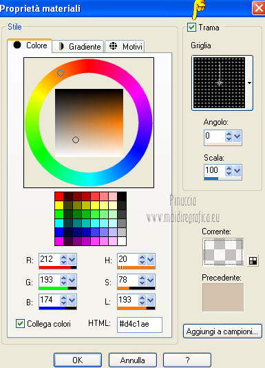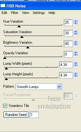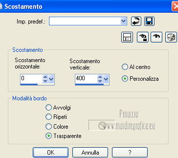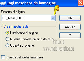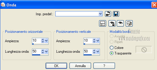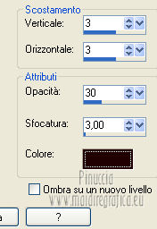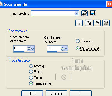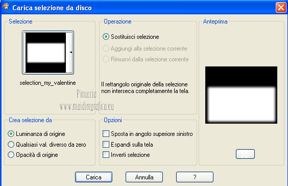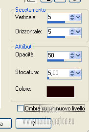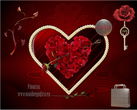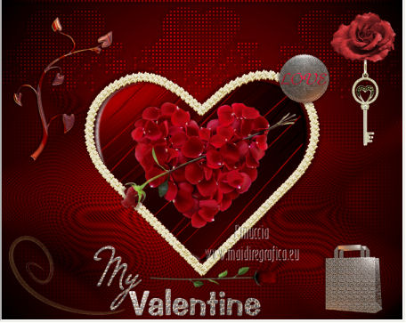 qui puoi trovare qualche risposta ai tuoi dubbi. Se l'argomento che ti interessa non è presente, ti prego di segnalarmelo. Per tradurre questo tutorial ho usato PSP X. Questo tutorial è una creazione di ©Titoune e non può essere copiato su altri siti nè essere offerto per il download. Lo stesso vale per la mia traduzione. Grazie ai creatori dei tubes che mettono a disposizione il loro lavoro in vari gruppi di condivisione. Rispetta il lavoro degli autori, non cambiare il nome del file e non cancellare il watermark. Occorrente: Un tube a scelta. Il resto del materiale qui I tubes utilizzati sono di Jer. Gli elementi scrap sono una creazione http://lindalousscrapspot.blogspot.ch/ Lindalou Creations Filtri: Penta.com - Dot and Cross qui Eye Candy 4000 - HSB Noise qui Animation Shop qui ![]() La trama Corel_15_006 è standard nelle versioni più recenti di PSP, e corrisponde alla trama standard Griglia delle versioni precedenti. Se non la trovi nel tuo PSP, metti quella fornita nella cartella Trame. Metti la selezione nella cartella selezioni. Apri la maschera in PSP e minimizzala con il resto del materiale. 1. Imposta il colore di primo piano con #a30000, e il colore di sfondo con il colore nero. Passa il colore di primo piano a Gradiente, stile Sprazzo di luce. ![]() 2. Apri una nuova immagine trasparente 750 x 600 pixels e riempila con il gradiente.3. Selezione>Carica/Salva selezione>Carica selezione da disco. Cerca e carica la selezione "selection_my_valentine". ![]() Selezione>Innalza selezione a livello. 4. Effetti>Effetti di trama>Trama - seleziona la trama Griglia (Corel_15_006), con i seguenti settaggi. ![]() 5. Effetti>Effetti di distorsione>Onda. ![]() Selezione>Deseleziona. 6. Livelli>Nuovo livello raster. Imposta il colore di primo piano con #d4c1ae e seleziona Trama. Imposta la trama Griglia (Corel_15_006) con i seguenti settaggi. ![]() Riempi il livello con il colore+trama.7. Livelli>Nuovo livello maschera>Da immagine. Apri il menu sotto la finestra di origine e vedrai la lista dei files aperti. Seleziona la maschera DL_Mask_0018, con i seguenti settaggi. ![]() Livelli>Unisci>Unisci gruppo. 8. Effetti>Effetti di immagine>Scostamento. ![]() Cambia la modalità di miscelatura di questo livello in Sovrapponi. 9. Livelli>Duplica. Livelli>Unisci>Unisci giù. Di nuovo Livelli>Duplica. 10. Attiva il livello originale della maschera. Effetti>Effetti 3D>Sfalsa ombra, con il colore #210000. ![]() Ripeti l'Effetto Sfalsa ombra, cambiando verticale e orizzontale con -5. 11. Apri l'elemento v6 e vai a Modifica>Copia. Torna al tuo lavoro e vai a Modifica>Incolla come nuovo livello. 12. Effetti>Effetti di immagine>Scostamento. ![]() 13. Attiva lo strumento Bacchetta magica ![]() e clicca al centro del cuore per selezionarlo. Livelli>Nuovo livello raster. Livelli>Disponi>Sposta giù. 14. Apri l'elemento v8 e vai a Modifica>Copia. Torna al tuo lavoro e vai a Modifica>Incolla nella selezione. Selezione>Deseleziona. 15. Attiva il livello del cuore. Effetti>Effetti 3D>Sfalsa ombra, con i settaggi precedenti. 16. Attiva il livello superiore. Apri il tube bfdcdfcd e vai a Modifica>Copia. Torna al tuo lavoro e vai a Modifica>Incolla come nuovo livello. Spostalo al centro del cuore.Vedi l'esempio finale. 17. Effetti>Effetti 3D>Sfalsa ombra, con il colore #210000. ![]() Ripeti l'Effetto Sfalsa ombra, cambiando verticale e orizzontale con -3. 18. Apri l'elemento V16 e vai a Modifica>Copia. Torna al tuo lavoro e vai a Modifica>Incolla come nuovo livello. Spostalo in alto a sinistra.Vedi l'esempio finale. Effetti>Effetti 3D>Sfalsa ombra, con i settaggi precedenti. 19. Apri l'elemento V19 e vai a Modifica>Copia. Torna al tuo lavoro e vai a Modifica>Incolla come nuovo livello. Spostalo in alto a destra.Vedi l'esempio finale. Effetti>Effetti 3D>Sfalsa ombra, con i settaggi precedenti. 20. Apri l'elemento V3 e vai a Modifica>Copia. Torna al tuo lavoro e vai a Modifica>Incolla come nuovo livello. Spostalo in alto a destra.Vedi l'esempio finale. Effetti>Effetti 3D>Sfalsa ombra, con i settaggi precedenti. 21. Apri l'elemento V7 e vai a Modifica>Copia. Torna al tuo lavoro e vai a Modifica>Incolla come nuovo livello. Spostalo nella parte superiore destra del cuore.Vedi l'esempio finale. Effetti>Effetti 3D>Sfalsa ombra, con i settaggi precedenti. 22. Apri l'elemento V10 e vai a Modifica>Copia. Torna al tuo lavoro e vai a Modifica>Incolla come nuovo livello. Spostalo in basso a destra.Vedi l'esempio finale. Effetti>Effetti 3D>Sfalsa ombra, con i settaggi precedenti. 23. Apri l'elemento V5 e vai a Modifica>Copia. Torna al tuo lavoro e vai a Modifica>Incolla come nuovo livello. Spostalo sotto il cuore.Vedi l'esempio finale. Effetti>Effetti 3D>Sfalsa ombra, con i settaggi precedenti. ![]() 24. Apri l'elemento V15 e vai a Modifica>Copia. Torna al tuo lavoro e vai a Modifica>Incolla come nuovo livello. Spostalo in basso.Vedi l'esempio finale. Effetti>Effetti 3D>Sfalsa ombra, con i settaggi precedenti. 25. Apri l'elemento V13 e vai a Modifica>Copia. Torna al tuo lavoro e vai a Modifica>Incolla come nuovo livello. Spostalo in basso a sinistra.Vedi l'esempio finale. ![]() Effetti>Effetti 3D>Sfalsa ombra, con i settaggi precedenti. 26. Apri il tuo tube e vai a Modifica>Copia. Torna al tuo lavoro e vai a Modifica>Incolla come nuovo livello. Immagine>Ridimensiona, se e quanto necessario, tutti i livelli non selezionato. Spostalo dove preferisci o vedi il mio esempio.Effetti>Effetti 3D>Sfalsa ombra, con il colore con i settaggi precedenti. 27. Controlla che tutti gli elementi siano correttamente posizionati. Attiva il livello superiore. Livelli>Nuovo livello raster. Riempi con il colore #e60101.28. Selezione>Seleziona tutto. Selezione>Modifica>Contrai - 2 pixels. Premi sulla tastiera il tasto CANC. Selezione>Inverti. Effetti>Plugins>Penta.com - Dot and Cross, con i settaggi standard. ![]() Effetti>Effetti di bordo>Aumenta. 29. Attiva il livello Raster 1. Modifica>Copia. Selezione>Seleziona tutto. Immagine>Ritaglia la sele