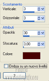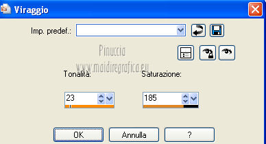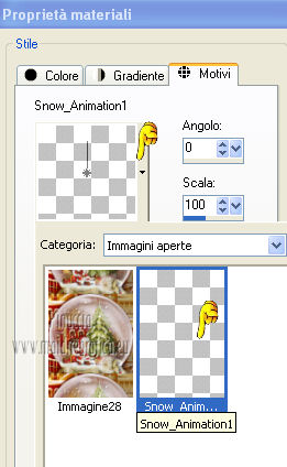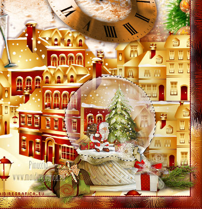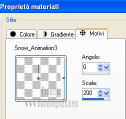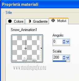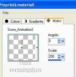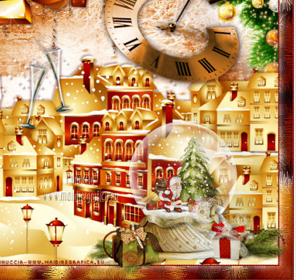 qui puoi trovare qualche risposta ai tuoi dubbi. Se l'argomento che ti interessa non è presente, ti prego di segnalarmelo. Per tradurre questo tutorial ho usato PSP X. Questo tutorial è una creazione di ©Titoune e non può essere copiato su altri siti nè essere offerto per il download. Lo stesso vale per la mia traduzione. Grazie ai creatori dei tubes che mettono a disposizione il loro lavoro in vari gruppi di condivisione. Rispetta il lavoro degli autori, non cambiare il nome del file e non cancellare il watermark. Occorrente: Un tube a scelta. Il resto del materiale qui Tubes ed elementi di Zezette2 Filtri: Adjust - Variations qui Penta.com - Jeans qui Animation Shop qui ![]() 1. Apri una nuova immagine trasparente 750 x 600 pixels. 2. Apri l'elemento 26b0faef (Village) e vai a Modifica>Copia. Torna al tuo lavoro e vai a Modifica>Incolla come nuovo livello. Spostalo in basso.Vedi l'esempio finale. 3. Attiva lo strumento Selezione , rettangolo,e traccia una selezione come nell'esempio. ![]() 4. Attiva il livello inferiore. Apri l'immagine 0471c8cc e vai a Modifica>Copia. Torna al tuo lavoro e vai a Modifica>Incolla nella selezione. Selezione>Deseleziona. Regola>Tonalità e saturazione>Viraggio. ![]() 5. Per tonificare l'immagine: Effetti>Plugins>Adjust - Variations, un clic su Original per annullare eventuali precedenti settaggi memorizzati dal filtro, due clic su Darker e ok. 6. Attiva il livello del villaggio. Livelli>Duplica. Cambia la modalità di miscelatura di questo livello in Luce diffusa. Attiva il livello dell'originale. 7. Effetti>Effetti 3D>Sfalsa ombra, con il colore #480001. ![]() Ripeti l'Effetto Sfalsa ombra, cambiando verticale e orizzontale con -3. 8. Apri l'elemento 0_3f8eb_48b5056a_L (palline sull'albero) e vai a Modifica>Copia. Torna al tuo lavoro e vai a Modifica>Incolla come nuovo livello. Spostalo in alto a destra.Effetti>Effetti 3D>Sfalsa ombra, con i settaggi precedenti. Nella paletta dei livelli porta questo livello sopra il livello Raster 1. ![]() 9. Attiva il livello superiore. Apri l'elemento d94b6d3f (orologio) e vai a Modifica>Copia. Torna al tuo lavoro e vai a Modifica>Incolla come nuovo livello. Spostalo in alto a destra.Vedi l'esempio finale. Effetti>Effetti 3D>Sfalsa ombra, con i settaggi precedenti. 10. Apri l'elemento 224c8e17 (palloncini) e vai a Modifica>Copia. Torna al tuo lavoro e vai a Modifica>Incolla come nuovo livello. Regola>Tonalità e saturazione>Viraggio, con i settaggi precedenti. Effetti>Plugins>Adjust - Variations, con i settaggi precedenti. Spostalo in alto, contro il bordo.Vedi l'esempio finale. Effetti>Effetti 3D>Sfalsa ombra, con i settaggi precedenti. Nella paletta dei livelli porta questo livello sotto il livello dell'orologio. 11. Attiva nuovamene il livello superiore. Apri l'elemento 36e24657 (2013) e vai a Modifica>Copia. Torna al tuo lavoro e vai a Modifica>Incolla come nuovo livello. Spostalo in alto, sopra i palloncini.![]() Effetti>Effetti 3D>Sfalsa ombra, con i settaggi precedenti. 12. Apri l'elemento7df78645_flutes_champagne e vai a Modifica>Copia. Torna al tuo lavoro e vai a Modifica>Incolla come nuovo livello. Spostalo dove preferisci o vedi il mio esempio.![]() Effetti>Effetti 3D>Sfalsa ombra, con i settaggi precedenti. 13. Apri l'elemento 4fbc23d0 (palline dorate) e vai a Modifica>Copia. Torna al tuo lavoro e vai a Modifica>Incolla come nuovo livello. Spostalo in alto a sinistra.Vedi l'esempio finale. Regola>Tonalità e saturazione>viraggio, con i settaggi precedenti. Effetti>Effetti 3D>Sfalsa ombra, con i settaggi precedenti. Copia. Torna al tuo lavoro e vai a Modifica>Incolla come nuovo livello. Immagine>Ridimensiona, se e quanto necessario, tutti i livelli non selezionato. Spostalo dove preferisci o vedi il mio esempio.Effetti>Effetti 3D>Sfalsa ombra, con i settaggi precedenti. 15. Livelli>Nuovo livello raster. Riempi con un colore chiaro.Per l'esempio #7f0300. Selezione>Seleziona tutto. Selezione>Modifica>Contrai - 2 pixels. Premi sulla tastiera il tasto CANC. 16. Selezione>Inverti. Effetti>Plugins>Penta.com - Jeans, con i settaggi standard. ![]() Effetti>Effetti 3D>Smusso a incasso. ![]() Selezione>Deseleziona. 17. ATtiva il livello Raster 1. Selezione>Seleziona tutto. Immagine>Ritaglia la selezione. 18. Immagine>Dimensioni tela - 800 x 650 pixels. ![]() 19. Apri il tube titoune_cadre_new_year_land_2013 e vai a Modifica>Copia. Torna al tuo lavoro e vai a Modifica>Incolla come nuovo livello. 20. Attiva il livello superiore. Livelli>Nuovo livello raster. Riempi con il colore chiaro.Selezione>Seleziona tutto. Selezione>Modifica>Contrai - 2 pixels. Premi sulla tastiera il tasto CANC. Selezione>Inverti. Effetti>Plugins>Penta.com - Jeans, con i settaggi standard. 21. Effetti>Effetti 3D>Smusso a incasso, con i settaggi precedenti. ![]() Selezione>Deseleziona. 22. Apri l'elemento 21c7eeca (boccia) e vai a Modifica>Copia. Torna al tuo lavoro e vai a Modifica>Incolla come nuovo livello. Spostalo sul bordo in basso a destra.![]() Effetti>Effetti 3D>Sfalsa ombra, con i settaggi precedenti. Rinomina questo livello "animazione". Firma il tuo lavoro. 23. Animazione. Attiva il livello "animazione". 24. Attiva lo strumento Selezione a mano libera ![]() e traccia una selezione intorno alla sfera. ![]() Livelli>Duplica - 2 volte. 25. Attiva il livello "animazione". Apri l'immagine Snow_Animation1 e minimizzala. Passa il colore di primo piano a Motivi e cerca l'immagine nella lista dei motivi disponibili, sotto la categoria Immagini Aperte. ![]() Seleziona il motivo con i seguenti settaggi. ![]() 26. Livelli>Nuovo livello raster. Riempi la selezione con questo motivo.Livelli>Unisci>Unisci giù. Lascia il livello visibile e mantieni selezionato. 27. Attiva il livello della prima copia. Apri l'immagine Snow_Animation2 e minimizzala. Cerca e seleziona l'immagine nella lista dei motivi disponibili, con i settaggi precedenti. ![]() Livelli>Nuovo livello raster. Riempi con il motivo.Livelli>Unisci>Unisci giù. Chiudi questo livello.