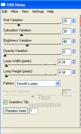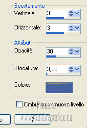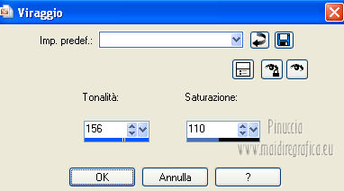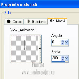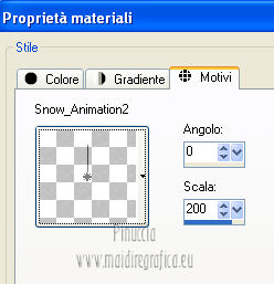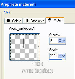 qui puoi trovare qualche risposta ai tuoi dubbi. Se l'argomento che ti interessa non è presente, ti prego di segnalarmelo. Per tradurre questo tutorial ho usato PSP X. Questo tutorial è una creazione di ©Titoune e non può essere copiato su altri siti nè essere offerto per il download. Lo stesso vale per la mia traduzione. Grazie ai creatori dei tubes che mettono a disposizione il loro lavoro in vari gruppi di condivisione. Rispetta il lavoro degli autori, non cambiare il nome del file e non cancellare il watermark. Occorrente: Un tube a scelta. Il resto del materiale qui Tubes ed elementi di Zezette 2 Filtri: Penta.com - Jeans qui Eye Candy 4000 - HSB Noise qui Animation Shop qui ![]() 1. Apri una nuova immagine trasparente 750 x 600 pixels. Selezione>Seleziona tutto. 2. Apri l'elemento pp011. Regola>Tonalità e saturazione>Viraggio. ![]() Modifica>Copia. Torna al tuo lavoro e vai a Modifica>Incolla nella selezione. Selezione>Modifica>Contrai - 85 pixels. Selezione>Modifica>Sfuma - 40 pixels. 3. Apri l'elemento pp3. Regola>Tonalità e saturazione>Viraggio, con i settaggi precedenti. Modifica>Copia. Torna al tuo lavoro e vai a Modifica>Incolla nella selezione. Selezione>Deseleziona. 4. Apri l'elemento 18 e vai a Modifica>Copia. Torna al tuo lavoro e vai a Modifica>Incolla come nuovo livello. 5. Effetti>Effetti di immagine>Scostamento. ![]() 6. Effetti>Effetti 3D>Sfalsa ombra, con il colore #45629e. ![]() Ripeti l'Effetto Sfalsa ombra, cambiando verticale e orizzontale con -3. 7. Attiva lo strumento Selezione , rettangolo,e traccia una selezione intorno alla finestra. ![]() 8. Livelli>Nuovo livello raster. Livelli>Disponi>Sposta giù. Apri l'immagine del paesaggio "fc9c9148" e vai a Modifica>Copia. Torna al tuo lavoro e vai a Modifica>Incolla nella selezione. Selezione>Deseleziona. Rinomina questo livello "animazione 2". 9. Apri l'elemento 0_961be_8b240654_L. Regola>Tonalità e saturazione>Viraggio, con i settaggi precedenti. Modifica>Copia. Torna al tuo lavoro e vai a Modifica>Incolla come nuovo livello. Spostalo sotto la finestra.Vedi l'esempio finale. Effetti>Effetti 3D>Sfalsa ombra, con i settaggi precedenti. 10. Livelli>Duplica. Immagine>Capovolgi. Posiziona correttamente l'elemento.Nella paletta dei livelli porta questi livelli sotto quello della finestra. Dovresti avere questo. ![]() 11. Attiva il livello superiore. Apri l'elemento 55064bd5 (3 palline) e vai a Modifica>Copia. Torna al tuo lavoro e vai a Modifica>Incolla come nuovo livello. Spostalo in alto a sinistra.Nessun Effetto Sfalsa ombra. 12. Apri l'elemento 149d86e7 (pallina blu) e vai a Modifica>Copia. Torna al tuo lavoro e vai a Modifica>Incolla come nuovo livello. Spostalo in alto a destra.![]() Effetti>Effetti 3D>Sfalsa ombra, con i settaggi precedenti. 13. Apri l'elemento 1dded5d5 (albero) e vai a Modifica>Copia. Torna al tuo lavoro e vai a Modifica>Incolla come nuovo livello. Spostalo in basso a destra.![]() Effetti>Effetti 3D>Sfalsa ombra, con i settaggi precedenti. 14. Apri l'elemento 7abf7187 (regali) e vai a Modifica>Copia. Torna al tuo lavoro e vai a Modifica>Incolla come nuovo livello. Spostalo ai piedi dell'albero.![]() Effetti>Effetti 3D>Sfalsa ombra, con i settaggi precedenti. 15. Apri il tube Joyeux Noel # 3 - CR = KingThings & MaYDesigns e vai a Modifica>Copia. Torna al tuo lavoro e vai a Modifica>Incolla come nuovo livello. Spostalo sotto la finestra.![]() Effetti>Effetti 3D>Sfalsa ombra, con i settaggi precedenti. 16. Apri il tuo tube e vai a Modifica>Copia. Torna al tuo lavoro e vai a Modifica>Incolla come nuovo livello. Immagine>Ridimensiona, se e quanto necessario, tutti i livelli non selezionato. Spostalo dove preferisci,o vedi il mio esempio. Effetti>Effetti 3D>Sfalsa ombra, con i settaggi precedenti. 17. Livelli>Nuovo livello raster. Imposta il colore di primo piano con il colore chiaro #4364a8. Riempi il livello con il colore chiaro.18. Selezione>Seleziona tutto. Selezione>Modifica>Contrai - 2 pixels. Premi sulla tastiera il tasto CANC. Selezione>Inverti. Effetti>Plugins>Penta.com - Jeans, con i settaggi standard. ![]() 19. Effetti>Effetti 3D>Smusso a incasso. ![]() Selezione>Deseleziona. 20. Attiva il livello Raster 1. Selezione>Seleziona tutto. Immagine>Ritaglia la selezione. 21. Immagine>Dimensioni tela - 800 x 650 pixels. ![]() 22. Attiva il livello superiore. Apri il tube titoune_frame_noel_fenetre e vai a Modifica>Copia. Torna al tuo lavoro e vai a Modifica>Incolla come nuovo livello. 23. Selezione>Carica/Salva selezione>Carica selezione da disco. Cerca e carica la selezione "selection_scrap_noel_fenetre". ![]() Selezione>Innalza selezione a livello. Imposta il colore di primo piano con #9fa8d8. Riempi la selezione con questo colore.Effetti>Effetti 3D>Smusso a incasso, con i settaggi precedenti. Selezione>Deseleziona. Rinomina questo livello "animazione". Firma il tuo lavoro. 24. Animazione. Attiva il livello "animazione". Livelli>Duplica - 2 volte e rimani posizionato sul livello della seconda copia. Effetti>Plugins>Eye Candy 4000 - HSB Noise. ![]() Chiudi questo livello e attiva il livello della prima copia. 25. Effetti>Plugins>Eye Candy 4000 - HSB Noise, clicca su Random Seed e ok. Effetti>Effetti di bordo>Aumenta. Chiudi questo livello e attiva il livello "animazione". 26. Effetti>Plugins>Eye Candy 4000 - HSB Noise, clicca su Random Seed e ok. Effetti>Effetti di bordo>Aumenta. Lascia il livello visibile. 27. Attiva il livello "animazione 2". Attiva lo strumento Selezione , rettangolo,e traccia una selezione intorno alla finestra. Livelli>Duplica - 2 volte. Attiva il livello "animazione 2". Apri Snow_Animation1 e minimizzalo. Passa il colore di primo piano a Motivi, nella lista dei motivi sotto la categoria Immagini Aperte cerca e seleziona l'immagine, con i seguenti settaggi. ![]() Riempi il livello con questo motivo.28. Attiva il livello della prima copia. Apri "Snow_Animation2" e minimizzalo. Cambia il motivo con questa immagine e gli stessi settaggi. ![]() Riempi il livello con que