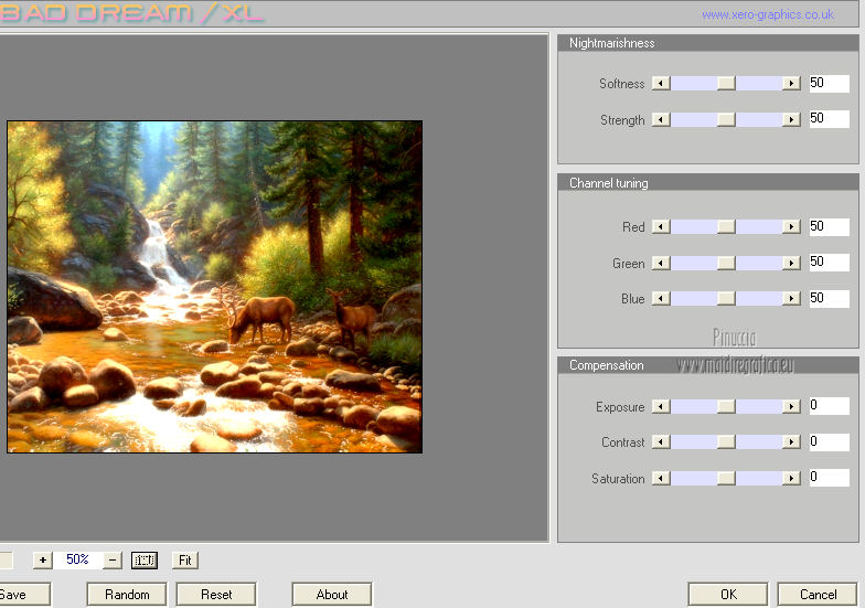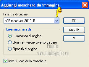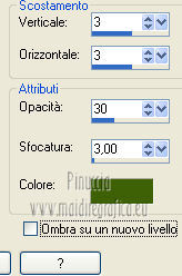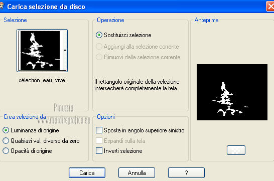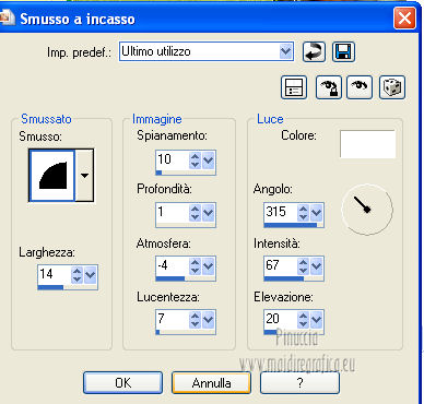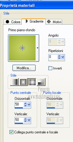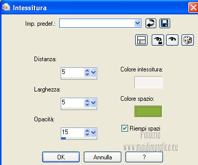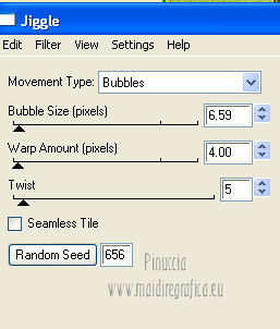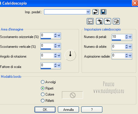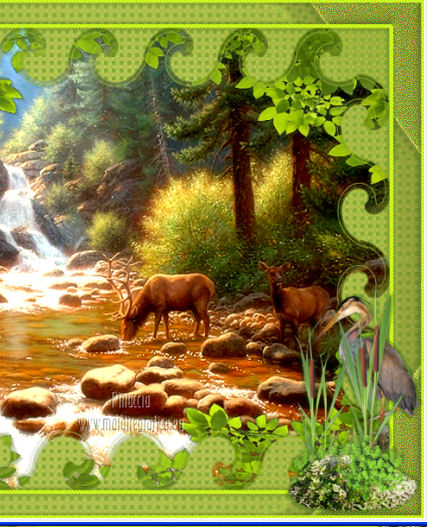 qui puoi trovare qualche risposta ai tuoi dubbi. Se l'argomento che ti interessa non è presente, ti prego di segnalarmelo. Per tradurre questo tutorial ho usato PSP X. Questo tutorial è una creazione di ©Titoune e non può essere copiato su altri siti nè essere offerto per il download. Lo stesso vale per la mia traduzione. Il tutorial è stato creato con PSP X5, ma può essere eseguito anche con le altre versioni di PSP. Per tradurlo, ho usato PSP X. Grazie ai creatori dei tubes che mettono a disposizione il loro lavoro in vari gruppi di condivisione. Rispetta il lavoro degli autori, non cambiare il nome del file e non cancellare il watermark. Occorrente: Un tube a scelta. Il resto del materiale qui Il tube utilizzato è di TReagen Filtri: Penta.com - Jeans qui Xero XL - Bad Dream qui Eye Candy 4000 - Jiggle qui qui Animation Shop qui ![]() Metti la selezione "selection_eau_vive" nella cartella Selezioni. Apri la maschera in PSP e minimizzala con il resto del materiale. 1. Imposta il colore di primo piano con #cad669, e il colore di sfondo con #9cb033. Passa il colore di primo piano a Gradiente, stile Sprazzo di luce. ![]() 2. Apri una nuova immagine trasparente 750 x 600 pixels, e riempila con il gradiente.3. Effetti>Effetti di trama>Intessitura. colore intessitura: #f5f3f0 riempi spazi: #56ae37. ![]() 4. Livelli>Duplica. Chiudi il livello originale, e rimani posizionato sul livello della copia. 5. Livelli>Nuovo livello maschera>Da immagine. Apri il menu sotto la finestra di origine e vedrai la lista dei files aperti. Seleziona la maschera "c25 masques 2012 5". ![]() Livelli>Unisci>Unisci gruppo. 6. Effetti>Effetti 3D>Sfalsa ombra, con il colore #406108. ![]() Ripeti l'Effetto Sfalsa ombra, cambiando verticale e orizzontale con -3. 7. Livelli>Nuovo livello raster. Livelli>Disponi>Sposta giù. Selezione>Seleziona tutto. 8. Apri l'immagine "graceful-pair-elk-002" e vai a Modifica>Copia. Torna al tuo lavoro e vai a Modifica>Incolla nella selezione. 9. Effetti>Plugins>Xero XL - Bad Dream. ![]() 10. Livelli>Nuovo livello raster. Apri il tube greenleaves_overlay e vai a Modifica>Copia. Torna al tuo lavoro e vai a Modifica>Incolla nella selezione. Selezione>Deseleziona. Effetti>Effetti 3D>Sfalsa ombra, con i settaggi precedenti. 11. Livelli>Unisci>Unisci visibile (il livello inferiore è sempre chiuso). 12. Immagine>Ridimensiona, al 90%, tutti i livelli non selezionato. Regola>Messa a fuoco>Metti a fuoco. Rinomina questo livello "animazione". 13. Riapri il livello originale dell'intessitura, e rimani posizionato sul livello "animazione". Selezione>Seleziona tutto. Selezione>Mobile. 14. Selezione>Modifica>Seleziona bordature selezione. ![]() Livelli>Nuovo livello raster. Imposta il colore di sfondo con #adef00. Riempi il livello con questo colore.15. Effetti>Plugins>Penta.com - Jeans, con i settaggi standard. ![]() Mantieni selezionato. 16. Effetti>Effetti 3D>Sfalsa ombra, con i settaggi precedenti. 17. Attiva il livello "animazione". Selezione>Seleziona tutto. Selezione>Mobile. Selezione>Inverti. 18. Attiva il livello inferiore (l'intessitura originale). Selezione>Innalza selezione a livello. Effetti>Effetti 3D>Smusso a incasso. ![]() 19. Effetti>Effetti di riflesso>Caleidoscopio. ![]() Selezione>Deseleziona. 20. Attiva lo strumento Bacchetta magica ![]() e clicca nei quattro angoli per selezionarli (se necessario imposta la tolleranza a 5-10 pixels). Selezione>Innalza selezione a livello. Riporta il colore di sfondo al colore iniziale #9cb033, e riavrai il gradiente con i colori iniziali. ![]() Riempi la selezione con il gradiente.21. Regola>Aggiungi/Rimuovi disturbo>Aggiungi disturbo. ![]() 22. Effetti>Effetti 3D>Smusso a incasso, con i settaggi precedenti. Selezione>Deseleziona. Effetti>Effetti di bordo>Aumenta. 23. Attiva il livello superiore. Livelli>Nuovo livello raster. Imposta nuovamente il colore di sfondo con il colore #adef00, e riempi il livello con questo colore.24. Selezione>Seleziona tutto. Selezione>Modifica>Contrai - 3 pixels. Premi sulla tastiera il tasto CANC. Selezione>Inverti. 25. Effetti>Plugins>Penta.com - Jeans, con i settaggi precedenti. Effetti>Effetti 3D>Sfals aombra, con i settaggi precedenti. Selezione>Deseleziona. 26. Apri il tube 0_70c0f_b1500732_L e vai a Modifica>Copia. Torna al tuo lavoro e vai a Modifica>Incolla come nuovo livello. Sposta il tube in basso a destra.27. Apri il tube 0_70c0e_6fd49c61_L e vai a Modifica>Copia. Torna al tuo lavoro e vai a Modifica>Incolla come nuovo livello. Sposta il tube dove preferisci,o vedi il mio esempio. ![]() 28. Apri il tuo tube e vai a Modifica>Copia. Torna al tuo lavoro e vai a Modifica>Incolla come nuovo livello. 29. Immagine>Ridimensiona, se e quanto necessario, tutti i livelli non selezionato. Per il mio esempio ho ridimensionato al 35%. Regola>Messa a fuoco>Metti a fuoco. Spostalo in basso a sinistra.30. Effetti>Effetti 3D>Sfalsa ombra, con i settaggi precedenti. Firma il tuo lavoro. 31. Animazione. Attiva il livello "animazione". Livelli>Duplica - 2 volte e rimani posizionato sul livello della seconda copia. Selezione>Carica/Salva selezione>Carica selezione da disco. Cerca e carica la selezione "selection_eau_vive". ![]() 32. Effetti>Plugins>Eye Candy 4000 - Jiggle. ![]() Chiudi questo livello e attiva il livello della prima copia. 33. Effetti>Plugins>Eye Candy 4000 - Jiggle, clicca su Random Seed e ok. Chiudi questo livello e attiva il livello "animazione. 34. Effetti>Plugins>Eye Candy 4000 - Jiggle, clicca su Random Seed e ok. Lascia il livello visibile. Selezione>Deseleziona. 35. Modifica>Copia Unione. Apri Animation Shop e vai a Modifica>Incolla>Incolla come nuova animazione. 36. Torna in PSP. Chiudi il livello "animazione" e apri il livello della prima copia. Modifica>Copia Unione. Torna in Animation Shop e vai a Modifica>Incolla>Incolla dopo il fotogramma corrente. 37. Di nuovo in PSP. Chiudi il livello della prima copia e apri il livello della seconda copia. Modifica>Copia Unione. In Animation Shop: Modi