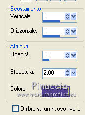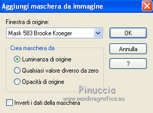 qui puoi trovare qualche risposta ai tuoi dubbi. Se l'argomento che ti interessa non è presente, ti prego di segnalarmelo. Per tradurre questo tutorial ho usato PSP X. Questo tutorial è una creazione di ©Titoune e non può essere copiato su altri siti nè essere offerto per il download. Lo stesso vale per la mia traduzione. Il materiale viene da vari gruppi di condivisione. Il copyright appartiene ai rispettivi autori. Grazie ai creatori dei tubes che mettono a disposizione il loro lavoro in vari gruppi di condivisione. Occorrente: Materiale qui Rispetta il lavoro degli autori, non cambiare il nome del file e non cancellare il watermark. ![]() Apri la maschera "Mask583_Brooke Kroeger" in PSP e minimizzala con il resto del materiale. 1. Apri una nuova immagine trasparente 1280 x 550 pixels. Selezione>Seleziona tutto. 2. Apri l'immagine happy_land_wallpaper_3384a e vai a Modifica>Copia. non chiuderla, perchè ti servirà ancora Torna al tuo lavoro e vai a Modifica>Incolla nella selezione. Selezione>Deseleziona. 3. Apri il tube kTs_Jhui63_copie. Attiva lo strumento Selezione a mano libera , da punto a punto,e seleziona l'elemento a sinistra, come nell'esempio. ![]() Modifica>Copia, e minimizza il tube senza deselezionare. Torna al tuo lavoro e vai a Modifica>Incolla come nuovo livello. 4. Immagine>Ridimensiona, al 90%, tutti i livelli non selezionato. 5. Effetti>Effetti di immagine>Scostamento. ![]() 6. Attiva nuovamente il tube kTs_Jhu163_copie con la selezione attiva. Selezione>Inverti (così è selezionato l'elemento a destra). Modifica>Copia (e puoi chiudere il tube senza salvare). Torna al tuo lavoro e vai a Modifica>Incolla come nuovo livello. 7. Immagine>Ridimensiona, al 90%, tutti i livelli non selezionato. 8. Effetti>Effetti di immagine>Scostamento. ![]() Livelli>Unisci>Unisci giù. 9. Effetti>Effetti 3D>Sfalsa ombra, con il colore #2c431b. ![]() Ripeti l'Effetto Sfalsa ombra, cambiando verticale e orizzontale con -1. 10. Attiva lo strumento Gomma , dimensione 30,e cancella gli elementi sotto le tabelle. ![]() 11. Apri il tube sunny-lh e vai a Modifica>Copia. Torna al tuo lavoro e vai a Modifica>Incolla come nuovo livello. 12. Effetti>Effetti di immagine>Scostamento. ![]() 13. Selezione>Seleziona tutto. Selezione>Mobile. Selezione>Immobilizza. Selezione>Modifica>Contrai - 3 pixels. Selezione>Inverti. Premi sulla tastiera il tasto CANC. Selezione>Deseleziona. 14. Effetti>Effetti 3D>Sfalsa ombra, con il colore #52428c. ![]() Ripeti l'Effetto Sfalsa ombra, cambiando verticale e orizzontale con -2. 15. Attiva il livello Raster 1. Apri il tube "texte" e vai a Modifica>Copia. Torna al tuo lavoro e vai a Modifica>Incolla come nuovo livello. Spostalo sui cartelli a destra.16. Effetti>Effetti 3>Sfalsa ombra, con i settaggi precedenti. 17. Attiva nuovamente il livello Raster 1. Selezione>Seleziona tutto. Immagine>Ritaglia la selezione. 18. Immagine>Dimensioni tela - 1280 x 1500 pixels. ![]() 19. Livelli>Nuovo livello raster. Livelli>Disponi>Porta sotto. Riempi con un colore scelto dal paesaggio.Per l'esempio #cdec6f. 20. Apri una nuova immagine trasparente 1280 x 350 pixels. Selezione>Seleziona tutto. 21. Attiva nuovamente l'immagine happy_land_wallpaper_3384a e vai a Modifica>Copia. Torna al tuo lavoro e vai a Modifica>Incolla nella selezione. Selezione>Deseleziona. 22. Livelli>Nuovo livello maschera>Da immagine. Apri il menu sotto la finestra di origine e vedrai la lista dei files aperti. Seleziona la maschera Mask_583_Brooke_Kroeger, con i seguenti settaggi: ![]() Livelli>Unisci>Unisci gruppo. Modifica>Copia. Torna al tuo top e vai a Modifica>Incolla come nuovo livello. 23. Effetti>Effetti di immagine>Scostamento. ![]() 24. Effetti>Effetti 3D>Sfalsa ombra, con i settaggi precedenti. Regola>Messa a fuoco>Metti a fuoco. 25. Apri il tube kidsand e vai a Modifica>Copia. Torna al tuo lavoro e vai a Modifica>Incolla come nuovo livello. 26. Posiziona il tube al centro del top.27. Effetti>Effetti 3D>Sfalsa ombra, con i settaggi precedenti. Firma il tuo lavoro. Livelli>Unisci>Unisci tutto e salva in formato jpg. ![]() ![]() Se hai problemi o dubbi, o trovi un link non funzionante, o anche soltanto per un saluto, scrivimi. 6 Giugno 2011 |