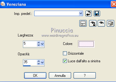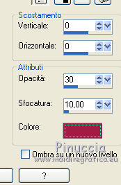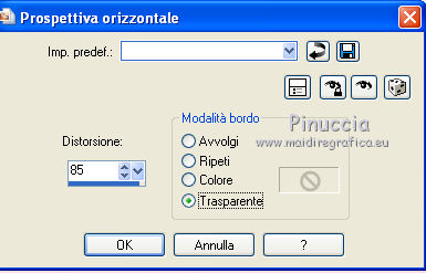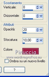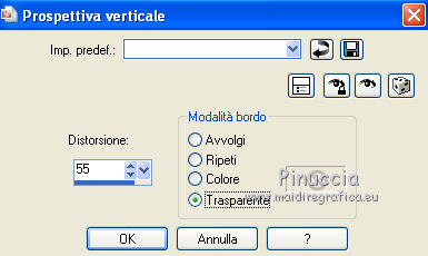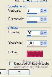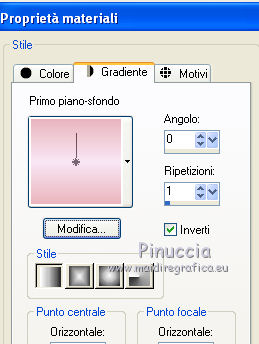 qui puoi trovare qualche risposta ai tuoi dubbi. Se l'argomento che ti interessa non č presente, ti prego di segnalarmelo. Per tradurre questo tutorial ho usato PSP X. Questo tutorial č una creazione di ©Titoune e non puņ essere copiato su altri siti nč essere offerto per il download. Lo stesso vale per la mia traduzione. Grazie ai creatori dei tubes che mettono a disposizione il loro lavoro in vari gruppi di condivisione. Rispetta il lavoro degli autori, non cambiare il nome del file e non cancellare il watermark. Occorrente: Materiale qui Il tube č di JoyceR. ![]() 1. Imposta il colore di primo piano con #f8e7f4, e il colore di sfondo con #e9b5be. 2. Passa il colore di primo piano a Gradiente, stile Lineare, con i seguenti settaggi. ![]() 3. Apri una nuova immagine trasparente 750 x 600 pixels, e riempila con il gradiente.4. Effetti>Effetti di trama>Veneziana, con il colore #faeff9. ![]() Effetti>Effetti di bordo>Aumenta. Livelli>Duplica. 5. Effetti>Effetti geometrici>Prospettiva verticale. ![]() 6. Effetti>Effetti 3D>Sfalsa ombra, con il colore #a51c44. ![]() Ripeti l'Effetto Sfalsa ombra, cambiando verticale e orizzontale con -2. Livelli>Duplica. Immagine>Capovolgi. Chiudi il livello della copia. 7. Attiva il livello originale. Effetti>Effetti geometrici>Prospettiva orizzontale. ![]() 8. Effetti>Effetti di riflesso>Specchio rotante. ![]() Livelli>Duplica. Immagine>Capovolgi. 9. Apri e attiva il livello soprastante della copia. 10. Effetti>Effetti di distorsione>Coordinate polari. ![]() 11. Immagine>Ridimensiona, all'85%, tutti i livelli non selezionato. Regola>Messa a fuoco>Metti a fuoco. Effetti>Effetti 3D>Sfalsa ombra, con i settaggi precedenti. 12. Apri l'elemento 0_748be_4268b635_XL e vai a Modifica>Copia. Torna al tuo lavoro e vai a Modifica>Incolla come nuovo livello. Spostalo in alto.Effetti>Effetti 3D>Sfalsa ombra, con i settaggi precedenti. 13. Apri il tube JER_A. Laurent DROP BULLES, che č composto da 2 livelli. Attiva il livello "bubbles" e vai a Modifica>Copia. Torna al tuo lavoro e vai a Modifica>Incolla come nuovo livello. 14. Immagine>Ridimensiona, al 55%, tutti i livelli non selezionato. Regola>Messa a fuoco>Metti a fuoco. Sposta le bolle in basso a destra.![]() Effetti>Effetti 3D>Sfalsa ombra, con i settaggi precedenti. 15. Livelli>Duplica. Di nuovo Immagine>Ridimensione, al 55%, tutti i livelli non selezionato. 16. Immagine>Ruota per gradi - 90 gradi a sinistra. ![]() Regola>Messa a fuoco>Metti a fuoco. Sposta le bolle in alto a destra.Livelli>Duplica. Immagine>Rifletti. 17. Apri il tube titoune_coins_scrap_pretty_bubbles e vai a Modifica>Copia. Torna al tuo lavoro e vai a Modifica>Incolla come nuovo livello. 18. Effetti>Effetti 3D>Sfalsa ombra, con il colore #a51c44. ![]() 19. Apri il tube sussieM Christmas by the Sea BirdieRainbow e vai a Modifica>Copia. Torna al tuo lavoro e vai a Modifica>Incolla come nuovo livello. Immagine>Ridimensiona, al 40%, tutti i livelli non selezionato. Regola>Messa a fuoco>Metti a fuoco. Spostalo al centro del cuore.![]() 20. Effetti>Effetti 3D>Sfalsa ombra, con il colore #a51c44. ![]() Ripeti l'Effetto Sfalsa ombra, cambiando verticale e orizzontale con -2. 21. Attiva nuovamente il tube JER_A. Laurent DROP BULLES, e copia il livello della donna "woman". Torna al tuo lavoro e vai a Modifica>Incolla come nuovo livello. Immagine>Ridimensiona, all'80%, tutti i livelli non selezionato. Regola>Messa a fuoco>Metti a fuoco. Spostalo in basso a sinistra.Effetti>Effetti 3D>Sfalsa ombra, con il colore #a51c44. ![]() 23. Attiva il livello inferiore. Livelli>Duplica. Livelli>Disponi>Porta in alto. 24. Selezione>Seleziona tutto. Selezione>Modifica>Contrai - 5 pixels. Premi sulla tastiera il tasto CANC. Selezione>Inverti. 25. Effetti>Effetti 3D>Smusso a rilievo. ![]() Selezione>Deseleziona. 26. Effetti>Effetti 3D>Sfalsa ombra, con il colore #a51c44. ![]() Ripeti l'Effetto Sfalsa ombra, cambiando verticale e orizzontale con -2. Firma il tuo lavoro. Livelli>Unisci>Unisci tutto e salva in formato jpg. ![]() Se hai problemi o dubbi, o trovi un link non funzionante, o anche soltanto per un saluto, scrivimi. 23 Settembre 2012 |