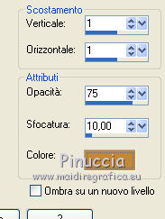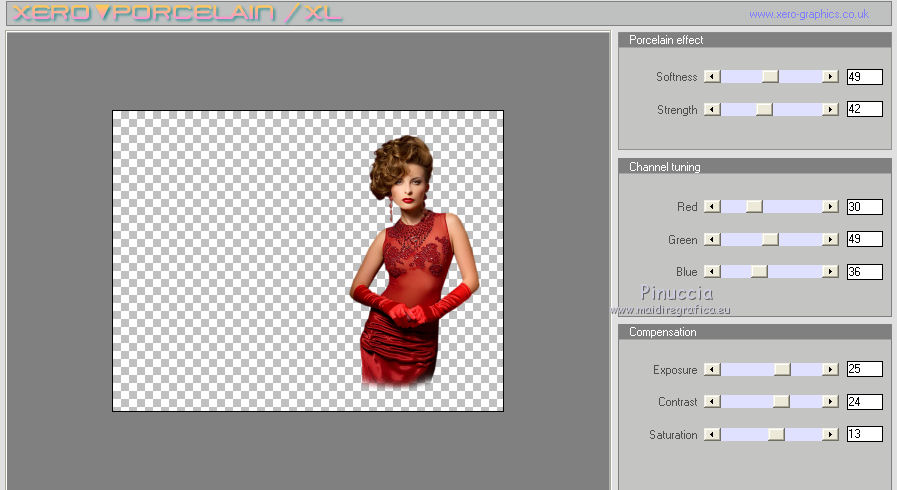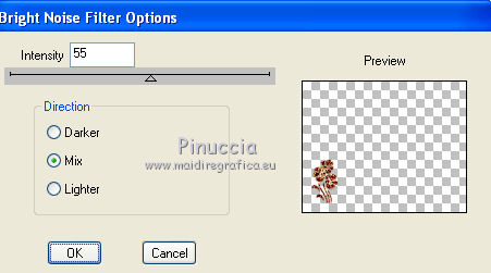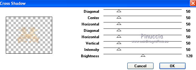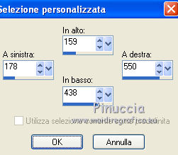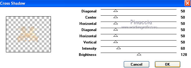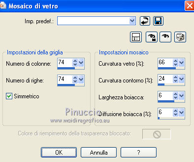 qui puoi trovare qualche risposta ai tuoi dubbi. Se l'argomento che ti interessa non è presente, ti prego di segnalarmelo. Per tradurre questo tutorial ho usato PSP X. Questo tutorial è una creazione di ©Titoune e non può essere copiato su altri siti nè essere offerto per il download. Lo stesso vale per la mia traduzione. Il materiale viene da vari gruppi di condivisione. Il copyright appartiene ai rispettivi autori. Grazie ai creatori dei tubes che mettono a disposizione il loro lavoro in vari gruppi di condivisione. Rispetta il lavoro degli autori, non cambiare il nome del file e non cancellare il watermark. Occorrente: Materiale qui Il tube utilizzato è di Guismo Filtri: consulta, se necessario, la mia sezione filtri qui DSB Flux - Bright Noise qui Graphics Plus - Cross Shadow qui Xero - Porcelain XL qui Animation Shop qui ![]() 1. Imposta il colore di primo piano con il colore nero. 2. Apri una nuova immagine trasparente 750 x 600 pixels, e riempila con il colore nero.3. Livelli>Nuovo livello raster. Selezione>Seleziona tutto. 4. Apri il tube r211009 e vai a Modifica>Copia. Torna al tuo lavoro e vai a Modifica>Incolla nella selezione. Selezione>Deseleziona. Cambia la modalità di miscelatura di questo livello in Luce netta. 5. Effetti>Effetti 3D>Sfalsa ombra, con il colore #c28737. ![]() Effetti>Effetti di bordo>Aumenta. 6. Effetti>Effetti di immagine>Scostamento. ![]() 7. Livelli>Nuovo livello raster. Selezione>Seleziona tutto. 8. Apri la trama achter01 e v ai a Modifica>Copia. Torna al tuo lavoro e vai a Modifica>Incolla nella selezione. 9. Selezione>Modifica>Contrai - 5 pixels. Premi sulla tastiera il tasto CANC. 10. Selezione>Modifica>Contrai - 10 pixels. Modifica>Incolla nella selezione. 11. Selezione>Modifica>Contrai - 5 pixels. Premi sulla tastiera il tasto CANC. Selezione>Deseleziona. 12. Livelli>Duplica, e attiva il livello sottostante dell'originale. 13. Effetti>Effetti di trama>Mosaico di vetro. ![]() Selezione>Seleziona tutto. Selezione>Modifica>Contrai - 35 pixels. Premi sulla tastiera il tasto CANC. 14. Selezione>Seleziona tutto. Selezione>Modifica>Contrai - 20 pixels. Selezione>Inverti. Premi sulla tastiera il tasto CANC. Selezione>Deseleziona. Rinomina questo livello "mosaico di vetro". 15. Livelli>Nuovo livello raster. Attiva lo strumento Selezione ,clicca sull'icona Selezione personalizzata ![]() e imposta i seguenti settaggi: ![]() 16. Apri il tube n231009_2 e vai a Modifica>Copia. Torna al tuo lavoro e vai a Modifica>Incolla nella selezione. Selezione>Deseleziona. Cambia la modalità di miscelatura di questo livello in Luce netta. Regola>Messa a fuoco>Metti a fuoco. Livelli>Disponi>Sposta giù. Rinomina questo livello "animazione 1". 17. Apri il tube cal-guis-3-elegance-2102008 e vai a Modifica>Copia. Torna al tuo lavoro e vai a Modifica>Incolla come nuovo livello. 18. Immagine>Ridimensiona, al 75%, tutti i livelli non selezionato. Regola>Messa a fuoco>Metti a fuoco. Spostalo in basso a destra - vedi l'esempio finale.Nella paletta dei livelli posiziona questo livello sotto il livello "mosaico di vetro". 19. Livelli>Duplica. Livelli>Disponi>Porta in alto. 20. Attiva lo strumento Gomma ![]() e cancella la parte del vestito che supera l'effetto Mosaico di vetro. ![]() 21. Effetti>Plugins>Xero - Porcelain XL. ![]() Attiva il livello originale del tube. 22. Effetti>Effetti 3D>Sfalsa ombra, con il colore #c28737. ![]() Ripeti l'Effetto SFalsa ombra, cambiando verticale e orizzontale con -1. 23. Apri il tube donnaK_accents3046 e vai a Modifica>Copia. Torna al tuo lavoro e vai a Modifica>Incolla come nuovo livello. Immagine>Rifletti. 24. Immagine>Ridimensiona, al 75%, tutti i livelli non selezionato. Regola>Messa a fuoco>Metti a fuoco. Livelli>Disponi>Porta in alto. Sposta il tube in basso a sinistra.Rinomina questo livello "animazione 2". 25. Apri il tube "texte" e vai a Modifica>Copia. Torna al tuo lavoro e vai a Modifica>Incolla come nuovo livello. Spostalo in alto a sinistra.Firma il tuo lavoro. 26. Animazione. Attiva il livello "animazione 2". Effetti>Plugins>DSB Flux - Bright Noise. ![]() Modifica>Copia Unione. Apri Animation Shop e vai a Modifica>Incolla>Incolla come nuova animazione. 27. Torna in PSP. Modifica>Annulla azione Bright Noise. Effetti>Plugins>DSB Flux - Bright Noise, cambia Intensity con 65 e ok. Attiva il livello "animazione 1". Effetti>Plugins>Graphics Plus - Cross Shadow. ![]() Modifica>Copia Unione. Torna in Animation Shop e vai a Modifica>Incolla>Incolla dopo il fotogramma corrente. 28 . Di nuovo in PSP. Modifica>Annulla azione Cross Shadow. Modifica>Annulla azione Selezione livello. Modifica>Annulla azione Bright Noise. Effetti>Plugins>DSB Flux - Bright Noise, Intensity 75 e ok. Attiva il livello "animazione 1". Effetti>Plugins>Graphics Plus - Cross Shadow. ![]() Modifica>Copia Unione. Torna in Animation Shop e vai a Modifica>Incolla>Incolla dopo il fotogramma corrente. Modifica>Seleziona tutto. Animazione>Proprietà fotogramma e imposta la velocità a 45. ![]() Controlla il risultato cliccando su Visualizza e salva in formato gif.![]() Se hai problemi o dubbi, o trovi un link non funzionante, o anche soltanto per un saluto, scrivimi. 25 Gennaio 2012 |