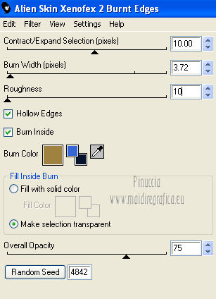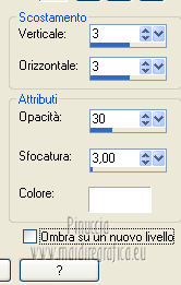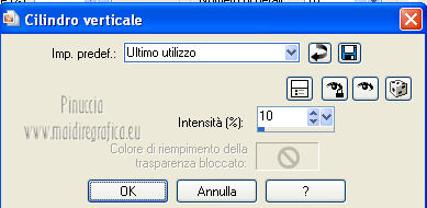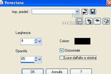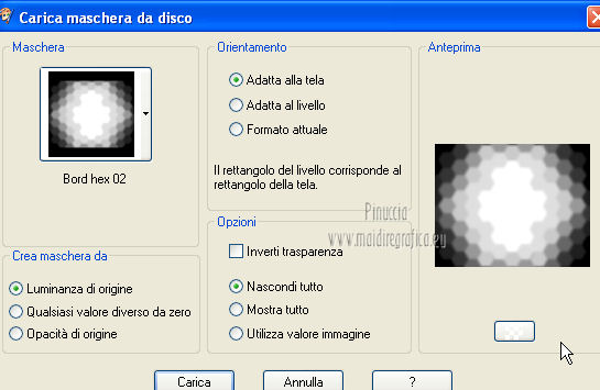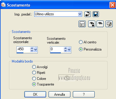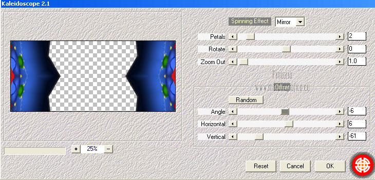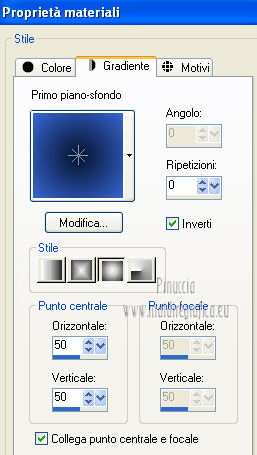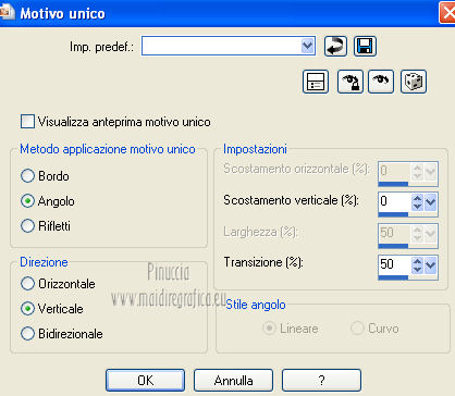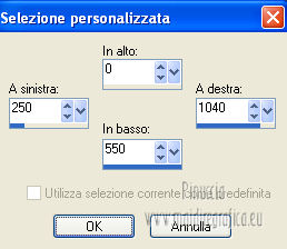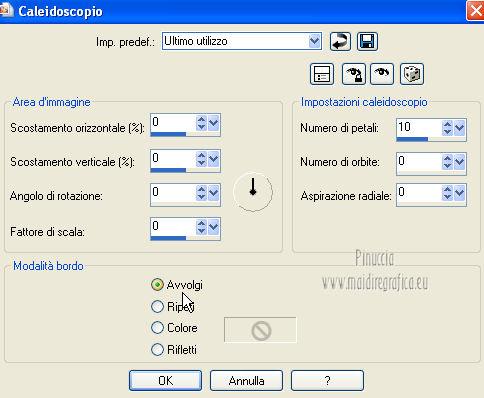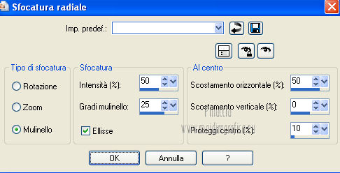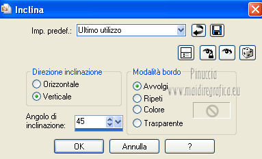 qui puoi trovare qualche risposta ai tuoi dubbi. Se l'argomento che ti interessa non è presente, ti prego di segnalarmelo. Per tradurre questo tutorial ho usato PSP X. Questo tutorial è una creazione di ©Titoune e non può essere copiato su altri siti nè essere offerto per il download. Lo stesso vale per la mia traduzione. Grazie ai creatori dei tubes che mettono a disposizione il loro lavoro in vari gruppi di condivisione. Rispetta il lavoro degli autori, non cambiare il nome del file e non cancellare il watermark. Occorrente: Materiale qui Filtri: Alien Skin Xenofex 2.0 - Burnt Edges qui VDL Adrenaline - Snowscape qui Mehdi - Kaleidoscope 2.1 qui ![]() Metti la maschera "bord hex 02" nella cartella Maschere. Metti la selezione "selection_santa_house" nella cartella Selezioni. 1. Imposta il colore di primo piano con #3666d5, e il colore di sfondo con #07132d. 2. Apri una nuova immagine trasparente 1280 x 550 pixels. Selezione>Seleziona tutto. Apri l'immagine 69 e vai a Modifica>Copia. Torna al tuo lavoro e vai a Modifica>Incolla nella selezione. Selezione>Deseleziona. 3. Effetti>Effetti di immagine>Motivo unico. ![]() 4. Regola>Sfocatura>Sfocatura radiale. ![]() 5. Apri una nuova immagine trasparente 375 x 550 pixels. Selezione>Seleziona tutto. Modifica>Incolla nella selezione (l'immagine 69 è ancora in memoria). Selezione>Deseleziona. Modifica>Copia. Torna al tuo top e vai a Modifica>Incolla come nuovo livello. 6. Effetti>Effetti di immagine>Scostamento. ![]() 7. Effetti>Effetti di riflesso>Specchio rotante. ![]() 8. Effetti>Effetti geometrici>Inclina. ![]() Livelli>Duplica. 9. Effetti>Plugins>Alien Skin Xenofex 2.0 - Burnt Edges. ![]() 10. Effetti>Plugins>VDL Adrenaline - Snowscape. ![]() Livelli>Unisci>Unisci giù. 11. Effetti>Effetti geometrici>Cilindro verticale. ![]() 12. Effetti>Effetti di riflesso>Caleidoscopio. ![]() 13. Effetti>Plugins>Mehdi - Kaleidoscope 2.1. ![]() 14 Effetti>Effetti 3D>Sfalsa ombra, con il colore bianco. ![]() Ripeti l'Effetto Sfalsa ombra, cambiando verticale e orizzontale con -3. 15. Effetti>Effetti di trama>Veneziana. ![]() 16. Effetti>Effetti geometrici>Cilindro verticale, con i settaggi precedenti. 17. Attiva nuovamente l'immagine "69". Livelli>Carica/Salva maschera>Carica maschera da disco. Cerca e carica la maschera Bord hex 02. ![]() Livelli>Unisci>Unisci gruppo. Modifica>Copia. Torna al tuo top e vai a Modifica>Incolla come nuovo livello. 18. Immagine>Ridimensiona, al 60%, tutti i livelli non selezionato. 19. Effetti>Effetti di immagine>Scostamento. ![]() Selezione>Seleziona tutto. Selezione>Mobile. Selezione>Modifica>Contrai - 10 pixels. Selezione>Modifica>Sfuma - 20 pixels. Selezione>Inverti. Premi sulla tastiera il tasto CANC. Selezione>Deseleziona. 20. Effetti>Effetti di riflesso>Specchio rotante, con i settaggi precedenti. 21. Effetti>Effetti di immagine>Motivo unico. ![]() 22. Attiva il livello inferiore. Attiva lo strumento Selezione ![]() clicca sull'icona Selezione personalizzata ![]() e imposta i seguenti settaggi. ![]() 23. Livelli>Nuovo livello raster. Apri l'immagine 2-big e vai a Modifica>Copia. Torna al tuo lavoro e vai a Modifica>Incolla nella selezione. Selezione>Deseleziona. 24. Attiva il livello Raster 1. Selezione>Seleziona tutto. Immagine>Ritaglia la selezione. 25. Immagine>Dimensioni tela. ![]() 26. Livelli>Nuovo livello rasater. Livelli>Disponi>Sposta giù. Riempi con il gradiente di partenza.Selezione>Carica/Salva selezione>Carica selezione da disco. Cerca e carica la selezione "selection_santa_house". ![]() 28. Livelli>Nuovo livello raster. Riempi con il colore di sfondo.29. Selezione>Modifica>Contrai - 3 pixels. Cambia i settaggi del gradiente, selezionando Inverti. ![]() Riempi con il gradiente.Selezione>Deseleziona. 30. Effetti>Effetti 3D>Sfalsa ombra, con il colore #0a1838. ![]() Ripeti l'Effetto Sfalsa ombra, cambiando verticale e orizzontale con -3. 31. Attiva il livello superiore. Apri l'elemento clarey_christmascharm_tree e vai a Modifica>Copia. Torna al tuo lavoro e vai a Modifica>Incolla come nuovo livello. Spostalo a destra della maschera.Effetti>Effetti 3D>Sfalsa ombra, con i settaggi precedenti. 32. Apri il tube present-box. Copia e incolla sul tuo lavoro entrambi i livelli di cui è composto il tube. Sposta gli elementi ai piedi dell'albero.Effetti>Effetti 3D>Sfalsa ombra, con i settaggi precedenti. 33. Apri il tube box4 vai a Modifica>Copia. Torna al tuo lavoro e vai a Modifica>Incolla come nuovo livello. Spostalo ai piedi dell'albero.Effetti>Effetti 3D>Sfalsa ombra, con i settaggi precedenti. 34. Apri il tube sleigh vai a Modifica>Copia. Torna al tuo lavoro e vai a Modifica>Incolla come nuovo livello. Spostalo come nel mio esempio.Effetti>Effetti 3D>Sfalsa ombra, con i settaggi precedenti. 35. Apri il tube word_christmas vai a Modifica>Copia. Torna al tuo lavoro e vai a Modifica>Incolla come nuovo livello. Spostalo dove preferisci,o vedi il mio esempio. Effetti>Effetti 3D>Sfalsa ombra, con i settaggi precedenti. 36. Apri il tube adventtubes18 vai a Modifica>Copia. Torna al tuo lavoro e vai a Modifica>Incolla come nuovo livello. Immagine>Ridimensiona, 2 volte al 60%, tutti i livelli non selezionato. Regola>Messa a fuoco>Metti a fuoco. Spostalo a sinistra.Livelli>Duplica. Cambia la modalità di miscelatura di questo livello in Luce diffusa. Attiva il livello sottostante dell'originale. Effetti>Effetti 3D>Sfalsa ombra, con i settaggi precedenti. Firma il tuo lavoro. 37. Livelli>Unisci>Unisci tutto e salva in formato jpg. ![]() Se hai problemi o dubbi, o trovi un link non funzionante, o anche soltanto per un saluto, scrivimi 2 Dicembre 2012 |