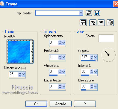 7. Effetti>Effetti di trama>Trama - seleziona la trama blue007, con i seguenti settaggi.