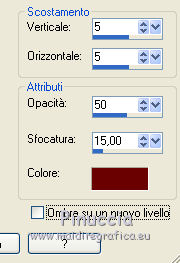 qui puoi trovare qualche risposta ai tuoi dubbi. Se l'argomento che ti interessa non č presente, ti prego di segnalarmelo. Per tradurre questo tutorial ho usato PSP X. Questo tutorial č una creazione di ŠTitoune e non puō essere copiato su altri siti nč essere offerto per il download. Lo stesso vale per la mia traduzione. Grazie ai creatori dei tubes che mettono a disposizione il loro lavoro in vari gruppi di condivisione. Rispetta il lavoro degli autori, non cambiare il nome del file e non cancellare il watermark. Occorrente: Un tube a scelta. Il resto del materiale qui Gli elementi scrap sono una creazione http://sweetcravingsscraps.blogspot.ch/ Sweet Craving Il tube usato č di Lori Rhae. Filtri Penta.com - Jeans qui ![]() 1. Apri una nuova immagine trasparente 750 x 600 pixels. Selezione>Seleziona tutto. 2. Apri l'elemento "titoune_motif_scrap_soleil_automne" e vai a Modifica>Copia. Torna al tuo lavoro e vai a Modifica>Incolla nella selezione. Selezione>Deseleziona. 3. Attiva lo strumento Bacchetta magica ![]() e clicca al centro dell'elemento per selezionarlo. Selezione>Modifica>Espandi - 2 pixels. Livelli>Nuovo livello raster. Livelli>Disponi>Sposta gių. 4. Apri l'immagine "automne" e vai a Modifica>Copia. Torna al tuo lavoro e vai a Modifica>Incolla nella selezione. Selezione>Deseleziona. 5. Attiva il livello superiore. Effetti>Effetti 3D>Sfalsa ombra, con il colore #6a0000. ![]() 6. Apri l'elemento SCS_HOM_Tree e vai a Modifica>Copia. Torna al tuo lavoro e vai a Modifica>Incolla come nuovo livello. Spostalo a sinistra.Effetti>Effetti 3D>Sfalsa ombra, con i settaggi precedenti. 7. Attiva lo strumento Gomma ![]() e cancella leggermente la base del tronco. ![]() 8. Apri l'elemento SCS_HOM_Sun e vai a Modifica>Copia. Torna al tuo lavoro e vai a Modifica>Incolla come nuovo livello. Spostalo in alto a destra.Effetti>Effetti 3D>Sfalsa ombra, con i settaggi precedenti. 9. Apri l'elemento SCS_HOM_Cloud1 e vai a Modifica>Copia. Torna al tuo lavoro e vai a Modifica>Incolla come nuovo livello. Spostalo anche questo elemento in alto a destra.![]() Effetti>Effetti 3D>Sfalsa ombra, con i settaggi precedenti. 10. Apri l'elemento SCS_HOM_HeartString1 e vai a Modifica>Copia. Torna al tuo lavoro e vai a Modifica>Incolla come nuovo livello. Sposta anche questo elemento a destra.![]() Effetti>Effetti 3D>Sfalsa ombra, con i settaggi precedenti. 11. Apri l'elemento SCS_HOM_Leaf e vai a Modifica>Copia. Torna al tuo lavoro e vai a Modifica>Incolla come nuovo livello. Sposta la foglia in alto a sinistra.![]() 12. Effetti>Effetti di riflesso>Specchio rotante. ![]() Effetti>Effetti 3D>Sfalsa ombra, con i settaggi precedenti. 13. Apri l'elemento SCS_HOM_Grass e vai a Modifica>Copia. Torna al tuo lavoro e vai a Modifica>Incolla come nuovo livello. Spostalo in basso.Effetti>Effetti 3D>Sfalsa ombra, con i settaggi precedenti. Livelli>Duplica. Immagine>Rifletti. 14. Apri l'elemento SCS_HOM_Flower2 e vai a Modifica>Copia. Torna al tuo lavoro e vai a Modifica>Incolla come nuovo livello. Spostalo in basso a destra.Vedi l'esempio finale. Effetti>Effetti 3D>Sfalsa ombra, con i settaggi precedenti. Livelli>Duplica. Immagine>Rifletti. 15. Apri l'elemento SCS_HOM_Flower4 e vai a Modifica>Copia. Torna al tuo lavoro e vai a Modifica>Incolla come nuovo livello. Spostalo in basso a destra.Nella paletta dei livelli porta questo livello sotto il livello dell'erba. Effetti>Effetti 3D>Sfalsa ombra, con i settaggi precedenti. 16. Rimani su questo livello. Apri l'elemento SCS_HOM_Flower5 e vai a Modifica>Copia. Torna al tuo lavoro e vai a Modifica>Incolla come nuovo livello. Spostalo in basso a sinistra.![]() Effetti>Effetti 3D>Sfalsa ombra, con i settaggi precedenti. 17. Attiva il livello superiore. Apri il tube Image6Tempted_LR-05-13-09 e vai a Modifica>Copia. Torna al tuo lavoro e vai a Modifica>Incolla come nuovo livello. Immagine>Ridimensiona, al 55%, tutti i livelli non selezionato. Posiziona il tube come preferisci, o vedi il mio esempio.Effetti>Effetti 3D>Sfalsa ombra, con i settaggi precedenti. 18. Attiva il livello Raster 1. ![]() Livelli>Unisci>Unisci gių. Modifica>Copia. Selezione>Seleziona tutto. Immagine>Ritaglia la selezione. Livelli>Nuovo livello raster. Livelli>Disponi>Porta in alto. Selezione>Seleziona tutto. Modifica>Incolla nella selezione. Selezione>Modifica>Contrai - 3 pixels. Premi sulla tastiera il tasto CANC. Selezione>Inverti. Effetti>Plugins>Penta.com - Jeans, con i settaggi standard. ![]() Selezione>Deseleziona. Effetti>Effetti 3D>Sfalsa ombra, con i settaggi precedenti. Firma il tuo lavoro. Decora a tuo piacimento. Livelli>Unisci>Unisci tutto e salva in formato jpg. ![]() Se hai problemi o dubbi, o trovi un link non funzionante, o anche soltanto per un saluto, scrivimi. 23 Settembre 2012 |