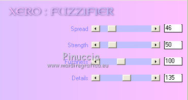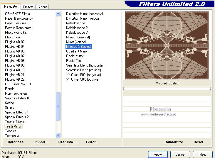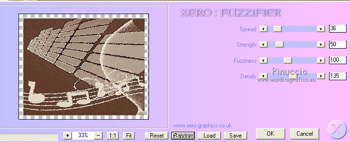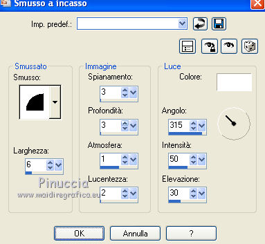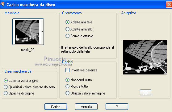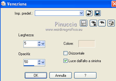 qui puoi trovare qualche risposta ai tuoi dubbi. Se l'argomento che ti interessa non č presente, ti prego di segnalarmelo. Per tradurre questo tutorial ho usato PSP X. Questo tutorial č una creazione di ŠTitoune e non puō essere copiato su altri siti nč essere offerto per il download. Lo stesso vale per la mia traduzione. Il materiale viene da vari gruppi di condivisione. Il copyright appartiene ai rispettivi autori. Grazie ai creatori dei tubes che mettono a disposizione il loro lavoro in vari gruppi di condivisione. Occorrente: Un tube a scelta. Il resto del materiale qui Il tube che ho usato per il mio esempio č di ClaudiaViza. Rispetta il lavoro degli autori, non cambiare il nome del file e non cancellare il watermark. Filtri: consulta, se necessario, la mia sezione filtri qui Penta.com - Color dot qui Andromeda - Perspective qui Filters Unlimited qui Xero - Bad Dream qui Xero - Fuzzifier qui Animation Shop qui ![]() Metti la maschera "mask20" nella cartella Maschere. 1. Imposta il colore di primo piano con #f0e6d3, e il colore di sfondo con #5f3c2b. 2. Apri una nuova immagine trasparente 750 x 600 pixels, e riempila con il colore di sfondo.3. Livelli>Nuovo livello raster. Riempi con il colore di primo piano.4. Livelli>Carica/Salva maschera>Carica maschera da disco. Cerca e carica la maschera mask_20. ![]() Livelli>Unisci>Unisci gruppo. Livelli>Unisci>Unisci gių. Rinomina questo livello "animazione 1". 5. Apri il tube 5.8.11pianoframe e vai a Modifica>Copia. Torna al tuo lavoro e vai a Modifica>Incolla come nuovo livello. 6. Immagine>Ridimensiona, all'85%, tutti i livelli non selezionato. 7. Effetti>Plugins>Andromeda - Perspective; clicca su Presets ![]() e imposta i seguenti settaggi. ![]() Sposta la cornice in alto a sinistra,come nell'esempio. ![]() 8. Attiva lo strumento Selezione , rettangolo,e seleziona la barra in basso a destra. ![]() Modifica>Taglia. Selezione>Deseleziona. Modifica>Incolla come nuovo livello. 9. Immagine>Ridimensiona, al 55%, tutti i livelli non selezionato. Sposta la barra in basso a destra.![]() 10. Effetti>Effetti 3D>Sfalsa ombra, con il colore #5f3c2b. ![]() Ripeti l'Effetto Sfalsa ombra, cambiando verticale e orizzontale con -3. 11. Attiva il livello della cornice. Immagine>Ridimensiona, al 90%, tutti i livelli non selezionato. Sposta la cornice a destra - vedi l'esempio al punto 12.12. Attiva lo strumento Selezione a mano libera , da punto a punto,e traccia una selezione intorno alla cornice. ![]() 13. Livelli>Nuovo livello raster. Livelli>Disponi>Sposta gių. Riempi con il colore di sfondo.14. Apri il tube VPC_SunsetOcean e vai a Modifica>Copia. Torna al tuo lavoro e vai a Modifica>Incolla nella selezione. Selezione>Deseleziona. 15. Effetti>Plugins>Xero - Bad Dream XL, con i settaggi standard. ![]() Rinomina questo livello "animazione 2". 16. Attiva nuovamente il livello della cornice. Effetti>Effetti 3D>Sfalsa ombra, con i settaggi precedenti. 17. Apri il tuo tube e vai a Modifica>Copia. Torna al tuo lavoro e vai a Modifica>Incolla come nuovo livello. 18. Immagine>Ridimensiona, se e quanto necessario. Sposta il tube in basso a destra.19. Effetti>Effetti 3D>Sfalsa ombra, con i settaggi precedenti. 20. Attiva il livello superiore. Livelli>Nuovo livello raster. Riempi con il colore di primo piano.21. Selezione>Seleziona tutto. Selezione>Modifica>Contrai - 2 pixels. Premi sulla tastiera il tasto CANC. Selezione>Inverti. 22. Effetti>Plugins>Penta.com - Color dot, con i settaggi standard. ![]() Effetti>Effetti di bordo>Aumenta. Selezione>Deseleziona. 23. Effetti>Effetti 3D>Sfalsa ombra, con i settaggi precedenti. 24. Attiva il livello "animazione 1" e vai a Modifica>Copia. Selezione>Seleziona tutto. Immagine>Ritaglia la selezione. 25. Immagine>Dimensioni tela - 800 x 650 pixels. ![]() 26. Livelli>Nuovo livello raster. Livelli>Disponi>Sposta gių. Selezione>Seleziona tutto. Modifica>Incolla nella selezione. 27. Selezione>Modifica>Contrai - 25 pixels. Selezione>Inverti. 28. Effetti>Effetti di trama>Veneziana, con il colore di primo piano. ![]() 29. Effetti>Plugins>Filters Unlimited 2.0 - Tile & Mirror - Mirrored & Scaled. ![]() 30. Effetti>Effetti 3D>Smusso a incasso. ![]() 31. Selezione>Seleziona tutto. Livelli>Nuovo livello raster. Livelli>Disponi>Porta in alto. Riempi con il colore di primo piano.32. Selezione>Modifica>Contrai - 2 pixels. Premi sulla tastiera il tasto CANC. Selezione>Inverti. 33. Effetti>Plugins>Penta.com - Color dot, con i settaggi standard. ![]() Effetti>Effetti di bordo>Aumenta. Selezione>Deseleziona. 34. Effetti>Effetti 3D>Sfalsa ombra, con i settaggi precedenti. 35. Apri il tube titoune_coins_song_of_my_heart e vai a Modifica>Copia. Torna al tuo lavoro e vai a Modifica>Incolla come nuovo livello. 36. Effetti>Effetti 3D>Sfalsa ombra, con il colore #5f3c2b. ![]() Ripeti l'Effetto Sfalsa ombra, cambiando verticale e orizzontale con -6. Firma il tuo lavoro. 37. Animazione. Attiva il livello "animazione 1". Effetti>Plugins>Xero - Fuzzifier. ![]() 38. Attiva il livello "animazione 2". Effetti>Plugins>Xero - Fuzzifier, con gli stessi settaggi. Modifica>Copia Unione. Apri Animation Shop e vai a Modifica>Incolla>Incolla come nuova animazione. 39. Torna in Psp. Modifica>Annulla gli ultimi quattro passaggi, e sarai nuovamente sul livello "animazione 1". Effetti>Plugins>Xero - Fuzzifier - cambia Spread con 46 e ok. ![]() Attiva il livello "animazione 2". Ripeti l'Effetto Fuzzifier con gli stessi settaggi. Modifica>Copia Unione. Torna in Animation Shop e vai a Modifica>Incolla>Incolla dopo il fotogramma corrente. 30. Di nuovo in PSP. Modifica>Annulla gli ultimi quattro passaggi, e sarai nuovamente sul livello "animazione 1". Effetti>Plugins>Xero - Fuzzifier - cambia Spread con 56 e ok. Attiva il livello "animazione 2". Ripeti l'Effetto Fuzzifier con gli stessi settaggi. Modifica>Copia Unione. Torna in Animation Shop e vai a Modifica>Incolla>Incolla dopo il fotogramma corrente. Controlla il risultato cliccando su Visualizza e salva in forma