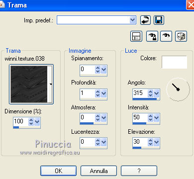 29. Effetti>Effetti di trama>Trama - seleziona la trama winni.texture.038 con i seguenti settaggi.