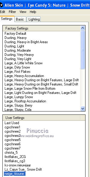 Metti il preset "neige_titoune" nella cartella del filtro Alien Skin Eye Candy 5 Nature>Settings>Snow Drift. Se preferisci puoi importarlo, quando ti servirà, dalla cartella in cui hai scompattato il materiale.