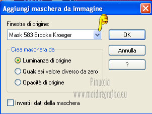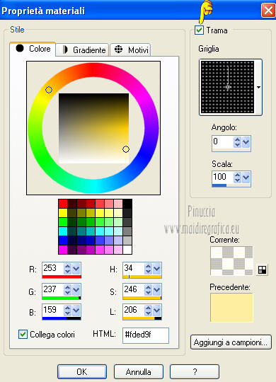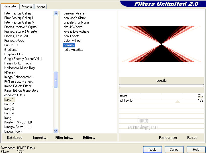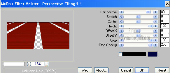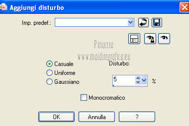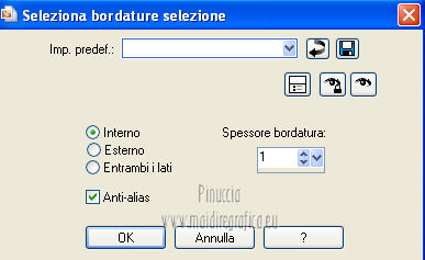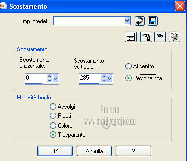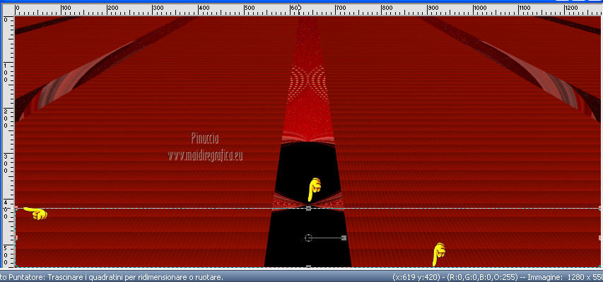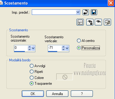 qui puoi trovare qualche risposta ai tuoi dubbi. Se l'argomento che ti interessa non è presente, ti prego di segnalarmelo. Per tradurre questo tutorial ho usato PSP X. Questo tutorial è una creazione di ©Titoune e non può essere copiato su altri siti nè essere offerto per il download. Lo stesso vale per la mia traduzione. Grazie ai creatori dei tubes che mettono a disposizione il loro lavoro in vari gruppi di condivisione. Rispetta il lavoro degli autori, non cambiare il nome del file e non cancellare il watermark. Occorrente: Un tube a scelta. Il resto del materiale qui Tubes ed elementi di Zezette2. Filtri: Mura's Meister - Perspective Tiling qui Filters Unlimited qui Kang 1 - Penzilla qui Penta.com - Jeans qui Simple - Left right Wrap (bonus) qui Transparency - Eliminate White qui Adjust - Variations qui I filtri Kang, Simple e Transparency si possono usare da soli o importati in Filters Unlimited ![]() Apri la maschera in PSP e minimizzala con il resto del materiale. 1. Imposta il colore di primo piano con #d50811, e il colore di sfondo con #490b05. Passa il colore di primo piano a Gradiente, stile Sprazzo di luce. ![]() 2. Apri una nuova immagine trasparente 1280 x 550 pixels, e riempila con il gradiente.Effetti>Plugins>Filters Unlimited 2.0 - Kang 1 - Penzilla, con i settaggi standard. ![]() Effetti>Plugins>Filters Unlimited 2.0 - Transparency - Eliminate White. 3. Effetti>Effetti di distorsione>Coordinate polari. ![]() 4. Effetti>Effetti 3D>Sfalsa ombra, con il colore nero. ![]() 5. Livelli>Nuovo livello raster. Livelli>Disponi>Sposta giù. Riempi con il gradiente.6. Effetti>Plugins>Adjust - Variations. Un clic su Original per annullare eventuali precedenti settaggi memorizzati dal filtro. Due clic su Darker e ok. 7. Regola>Aggiungi/Rimuovi disturbo>Aggiungi disturbo. ![]() 8. Livelli>Nuovo livello raster. Imposta il colore di primo piano con un colore contrastante - per l'esempio #fded9f. Seleziona Trama e imposta Griglia con i seguenti settaggi. ![]() Riempi il livello con questo colore+trama.9. Effetti>Effetti di distorsione>Coordinate polari, con i settaggi precedenti. Modifica>Ripeti Coordinate polari. Effetti>Effetti 3D>Sfalsa ombra, con i settaggi precedenti. 10. Attiva il livello superiore. Apri l'elemento 315a169a e lavora su questa immagine. Attiva lo strumento Gomma ![]() e cancella il motivo in alto a sinistra. Attiva lo strumento Selezione ![]() clicca sull'icona Selezione personalizzata , e imposta i seguenti settaggi. ![]() Modifica>Copia, e minimizza l'immagine che ti servirà ancora. Torna al tuo top e vai a Modifica>Incolla come nuovo livello. Effetti>Plugins>Simple - Left Right Wrap. 11. Effetti>Effetti di immagine>Scostamento. ![]() 12. Effetti>Plugins>Mura's Meister - Perspective Tiling, con i settaggi standard. ![]() 13. Se non visualizzi i righelli, vai a Visualizza>Righelli. Attiva lo strumento Puntatore ![]() se stai usando PSP 9 lo strumento Deformazione ![]() in modalità Scala spingi in basso il nodo centrale superiore, fino a 420 pixels. Puoi controllare la posiziona nella barra inferiore degli strumenti. ![]() Effetti>Effetti 3D>Sfalsa ombra, con i settaggi precedenti. 14. Attiva nuovamente l'elemento 315a169a che ha ancora la selezione attiva. Selezione>Innalza selezione a livello. Selezione>Deseleziona. Attiva il livello raster 1. 15. Immagine>Dimensioni tela - 1280 x 468 pixels. ![]() 16. Attiva il livello Selezione innalzata. Livelli>Disponi>Sposta giù. Effetti>Plugins>Simple - Left Right Wrap. Attiva il livello superiore. Livelli>Unisci>Unisci giù. 17. Selezione>Seleziona tutto. Selezione>Mobile. Selezione>Immobilizza. 18. Selezione>Modifica>Seleziona bordature selezione. ![]() 19. Livelli>Nuovo livello raster. Riempi con il colore contrastante,dopo aver deselezionato la trama. Selezione>Deseleziona. Effetti>Plugins>Penta.com - Jeans, con i settaggi standard. ![]() Effetti>Effetti di bordo>Aumenta. Modifica>Copia Unione. 20. Torna al tuo top e vai a Modifica>Incolla come nuovo livello. Effetti>Effetti di immagine>Scostamento. ![]() Effetti>Effetti 3D>Sfalsa ombra, con i settaggi precedenti. 21. Apri l'elemento 0d94d29c (campane) e vai a Modifica>Copia. Torna al tuo lavoro e vai a Modifica>Incolla come nuovo livello. Spostalo in alto a sinistra.Vedi l'esempio finale. Effetti>Effetti 3D>Sfalsa ombra, con i settaggi precedenti. Nella paletta dei livelli porta questo livello sotto quello del motivo principale. 22. Attiva nuovamente il livello superiore. Apri l'elemento ab9a882e (palline) e vai a Modifica>Copia. Torna al tuo lavoro e vai a Modifica>Incolla come nuovo livello. Spostalo in alto a destra.![]() Effetti>Effetti 3D>Sfalsa ombra, con i settaggi precedenti. 23. Apri l'elemento d1440772 (orologio) e vai a Modifica>Copia. Torna al tuo lavoro e vai a Modifica>Incolla come nuovo livello. Sposta anche questo elemento in alto a destra.Vedi l'esempio finale. Effetti>Effetti 3D>Sfalsa ombra, con i settaggi precedenti. 24. Apri l'elemento KaraT1164 e vai a Modifica>Copia. Torna al tuo lavoro e vai a Modifica>Incolla come nuovo livello. Spostalo in alto.![]() Effetti>Effetti 3D>Sfalsa ombra, con i settaggi precedenti. 25. Apri l'elemento 59d8eb89_2013 (2013) e vai a Modifica>Copia. Torna al tuo lavoro e vai a Modifica>Incolla come nuovo livello. Spostalo come nel mio esempio.Vedi l'esempio finale. 26. Effetti>Effetti 3D>Sfalsa ombra, con il colore nero. ![]() 27. Apri l'elemento Seachell_NewYearParty_Champagne1 e vai a Modifica>Copia. Torna al tuo lavoro e vai a Modifica>Incolla come nuovo livello. Spostalo a destra, o dove preferisci.Vedi l'esempio finale. Effetti>Effetti 3D>Sfalsa ombra, con i settaggi precedenti. 28. Apri l'elemento 26777bd9_flutes_champagne e vai a Modifica>Copia. Torna al tuo lavoro e vai a Modifica>Incolla come nuovo livello. Spostalo accanto alla bottiglia.![]() Effetti>Effetti 3D>Sfalsa ombra, con i settaggi precedenti. 29. Apri il tuo tube e vai a Modifica>Copia. Torna al tuo lavoro e vai a Modifica>Incolla come nuovo l