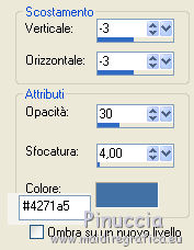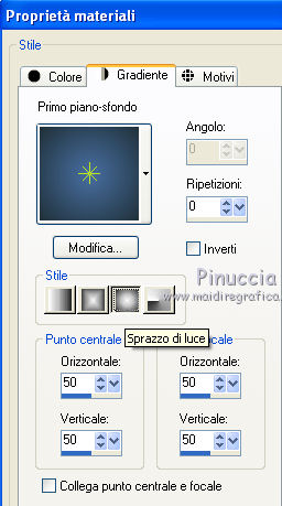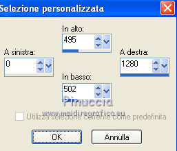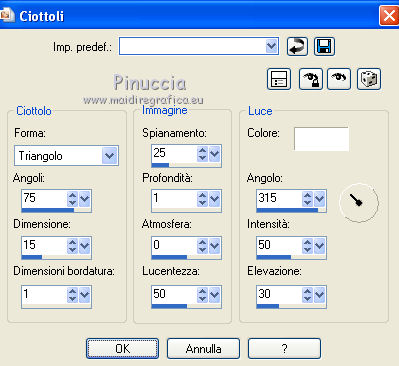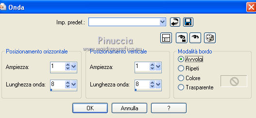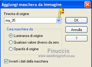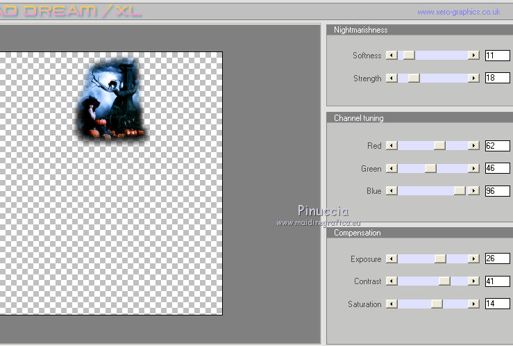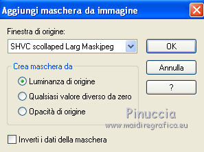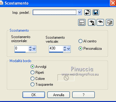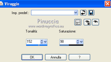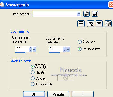 qui puoi trovare qualche risposta ai tuoi dubbi. Se l'argomento che ti interessa non è presente, ti prego di segnalarmelo. Per tradurre questo tutorial ho usato PSP X. Questo tutorial è una creazione di ©Titoune e non può essere copiato su altri siti nè essere offerto per il download. Lo stesso vale per la mia traduzione. Il materiale viene da vari gruppi di condivisione. Il copyright appartiene ai rispettivi autori. Grazie ai creatori dei tubes che mettono a disposizione il loro lavoro in vari gruppi di condivisione. Rispetta il lavoro degli autori, non cambiare il nome del file e non cancellare il watermark. Occorrente: Materiale qui Filtri: in caso di dubbi, ricorda di consultare la mia sezione filtri qui Graphics Plus - Cross Shadow qui Xero - Bad Dream qui ![]() Apri il pennello "Scareme" ed esportalo come Pennello personalizzato (vedi gli appunti sui Pennelli qui) Apri le maschere in PSP e minimizzale con il resto del materiale. 1. Imposta il colore di primo piano con il colore #486fa2, e il colore di sfondo con #213139. 2. Apri la maschera ma_35. 3. Immagine>Ruota per gradi - 90 gradi a destra, tutti i livelli selezionato. ![]() Minimizza nuovamente la maschera. 4. Apri una nuova immagine trasparente 500 x 500 pixels. 5. Passa il colore di primo piano a Gradiente. ![]() Riempi l'immagine trasparente con il gradiente.6. Livelli>Nuovo livello maschera>Da immagine. Apri il menu sotto la finestra di origine e vedrai la lista dei files aperti. Seleziona la maschera ma_35 con i seguenti settaggi. ![]() Livelli>Unisci>Unisci gruppo. 7. Immagine>Dimensione tela - 1280 x 500 e clicca sulla freccia a sinistra per disporre lo spazio extra sul lato destro. ![]() 8. Effetti>Effetti di immagine>Scostamento. ![]() 9. Livelli>Duplica. Immagine>Rifletti. Livelli>Unisci>Unisci giù. 10. Livelli>Nuovo livello raster. Livelli>Disponi>Sposta giù. Riempi con il gradiente.11. Livelli>Nuovo livello raster. Selezione>Seleziona tutto. 12. Apri l'immagine HaloWinMoon48_claro900 e vai a Modifica>Copia. Torna al tuo lavoro e vai a Modifica>Incolla nella selezione. Selezione>Deseleziona. Cambia la modalità di miscelatura di questo livello in Luce diffusa. Livelli>Duplica. 13. Attiva il livello superiore (il livello della maschera). Selezione>Seleziona tutto. Selezione>Mobile. Selezione>Modifica>Contrai - 4 pixels. 14. Livelli>Nuovo livello raster. 15. Apri il tube "Hall2". Regola>Tonalità e saturazione>Viraggio: ![]() Modifica>Copia. Torna al tuo lavoro e vai a Modifica>Incolla nella selezione. Cambia la modalità di miscelatura di questo livello in Luce diffusa. 16. Effetti>Effetti 3D>Sfalsa ombra, con il colore nero. ![]() Ripeti l'Effetto Sfalsa ombra, cambiando verticale e orizzontale con -3. 17. Effetti>Effetti 3D>Smusso a incasso. ![]() 18. Livelli>Nuovo livello raster. Livelli>Disponi>Porta sotto. 19. Immagine>Dimensione tela. ![]() Riempi con il colore di sfondo.20. Effetti>Plugins>Graphics Plus - Cross Shadow, con i settaggi standard. ![]() 21. Apri una nuova immagine trasparente 1280 x 500 pixels, e riempila con il colore di sfondo.22. Livelli>Nuovo livello maschera>Da immagine. Seleziona la maschera "SHVC scollaped Larg Maskjpeg" con i seguenti settaggi. ![]() Livelli>Unisci>Unisci gruppo. Modifica>Copia. Torna al tuo top e vai a Modifica>Incolla come nuovo livello. 23. Effetti>Effetti di immagine>Scostamento. ![]() 24. Effetti>Effetti 3D>Sfalsa ombra, con il colore #4271a5. ![]() Ripeti l'Effetto Sfalsa ombra, cambiando verticale e orizzontale con -3. 25. Attiva il livello superiore. Livelli>Nuovo livello raster. 26. Attiva lo strumento Selezione ,clicca sull'icona Selezione personalizzata ![]() e imposta i seguenti settaggi: ![]() Riempi la selezione con il gradiente.27. Effetti>Effetti di trama>Ciottoli. ![]() Selezione>Deseleziona. Livelli>Duplica. 28. Effetti>Effetti di distorsione>Onda. ![]() 29. Attiva il tuo tube, per il mio esempio "Halloween 2010-3-misted tube of a PSP Devil". Modifica>Copia. Torna al tuo lavoro e vai a Modifica>Incolla come nuovo livello. 30. Immagine>Ridimensiona, al 75%, tutti i livelli non selezionato. Regola>Messa a fuoco>Metti a fuoco. Posiziona il tube al centro del top.Livelli>Disponi>Sposta giù - 2 volte. 31. Effetti>Effetti 3D>Sfalsa ombra, con il colore nero. ![]() Ripeti l'Effetto Sfalsa ombra, cambiando verticale e orizzontale con -3. 32. Effetti>Plugins>Xero - Bad Dream XL. ![]() 33. Livelli>Nuovo livello raster. Riporta il colore di primo piano da Gradiente al Colore iniziale. 34. Attiva lo strumento Pennello ,cerca e seleziona il pennello "scareme", che hai esportato prima di iniziare, e applicalo con il colore di primo piano in basso a sinistra del tuo lavoro. Se necessario, posiziona correttamente il pennello.35. Aggiungi il tuo nome e/o il tuo watermark su un nuovo livello. 36. Livelli>Unisci>Unisci tutto e salva in formato jpg. ![]() ![]() Se hai problemi o dubbi, o trovi un link non funzionante, o anche soltanto per un saluto, scrivimi. 22 Ottobre 2010 |