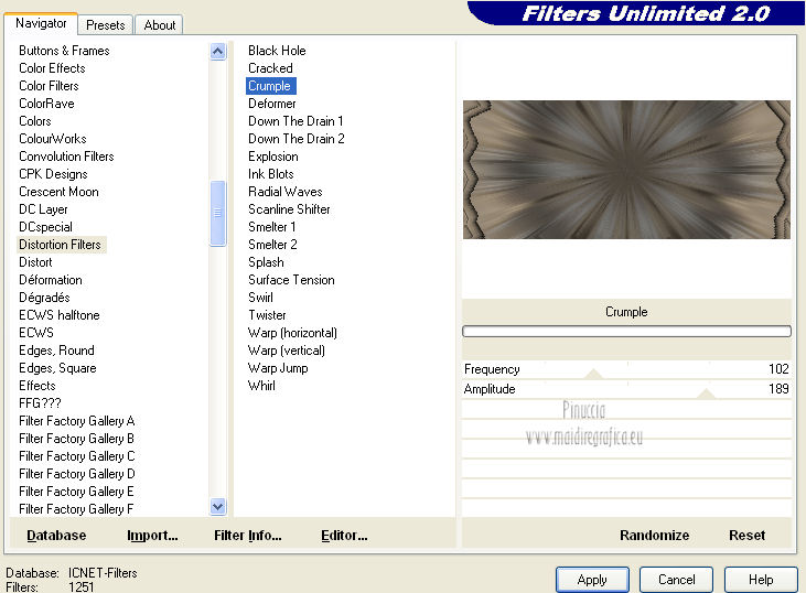 7. Effetti>Plugins>Filters Unlimited 2.0 - Distortion Filters - Crumple, con i settaggi standard.