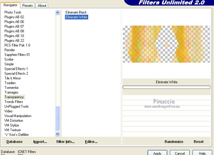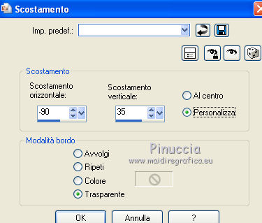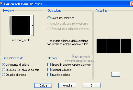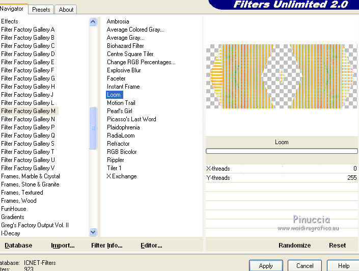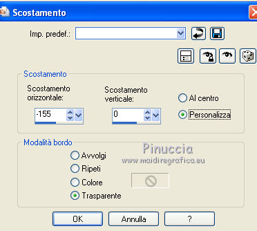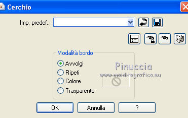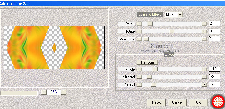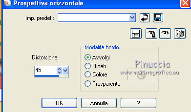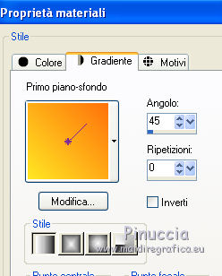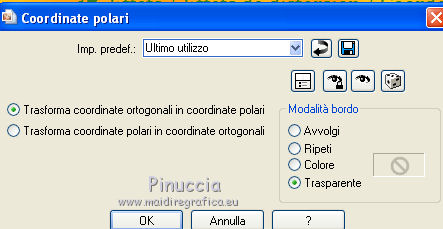 qui puoi trovare qualche risposta ai tuoi dubbi. Se l'argomento che ti interessa non č presente, ti prego di segnalarmelo. Per tradurre questo tutorial ho usato PSP X. Questo tutorial č una creazione di ŠTitoune e non puō essere copiato su altri siti nč essere offerto per il download. Lo stesso vale per la mia traduzione. Il materiale viene da vari gruppi di condivisione. Il copyright appartiene ai rispettivi autori. Grazie ai creatori dei tubes che mettono a disposizione il loro lavoro in vari gruppi di condivisione. Occorrente: Materiale qui Rispetta il lavoro degli autori, non cambiare il nome del file e non cancellare il watermark. Filtri: consulta, se necessario, la mia sezione filtri qui Filters Unlimited 2.0 qui Simple - Diamonds qui Transparency - Eliminate White qui Filter Factory Gallery M - Loom qui Mehdi - Kaleidoscope 2.1 qui I filtri Factory Gallery per essere usati devono prima essere convertiti. Come fare vedi qui Si usano importandoli in Filters Unlimited (come fare vedi qui) ma possono funzionare anche da soli ![]() Apri la maschera Mask_145_Brooke_Kroeger in PSP e minimizzala con il resto del materiale. Metti la selezione nella cartella Selezioni. 1. Imposta il colore di primo piano con #ffe723, e il colore di sfondo con #ff710c. 2. Passa il colore di primo piano a Gradiente, stile Lineare, con i seguenti settaggi. ![]() 3. Apri una nuova immagine trasparente 1280 x 550 pixels, e riempila con il gradiente.Selezione>Seleziona tutto. 4. Effetti>Plugins>Simple - Diamonds - 2 volte. Livelli>Nuovo livello raster. 5. Apri il tube n_061911. Attiva lo strumento Selezione a mano libera , da punto a punto,e seleziona il fiore di sinistra. ![]() Modifica>Copia. Selezione>Deseleziona, e minimizza il tube perchč ti servirā ancora. Torna al tuo lavoro e vai a Modifica>Incolla nella selezione. Selezione>Deseleziona. 6. Effetti>Effetti di immagine>Motivo unico, con i settaggi standard. ![]() Livelli>Unisci>Unisci visibile. 7. Regola>Sfocatura>Sfocatura radiale. ![]() Livelli>Duplica. 8. Effetti>Effetti geometrici>Prospettiva verticale. ![]() Effetti>Effetti di bordo>Aumenta. 9. Effetti>Effetti geometrici>Prospettiva verticale, con i settaggi precedenti. 10. Immagine>Ridimensiona, al 75%, tutti i livelli non selezionato. 11. Effetti>Effetti di immagine>Scostamento. ![]() 12. Effetti>Plugins>Mehdi - Kaleidoscope 2.1. ![]() 13. Effetti>Plugins>Filters Unlimited 2.0 - Filter Factory Gallery M - Loom, con i settaggi standard. ![]() 14. Effetti>Plugins>Filters Unlmited - Transparency - Eliminate White. a volte con questo filtro si ottengono risultati diversi se usato da solo o importato in Unlimited. In questo caso č indispensabile l'uso con Unlimited, come puoi vedere dalla schermata sotto. ![]() per curiositā, ecco cosa otterresti usando il filtro da solo. ![]() 15. Effetti>Effetti 3D>Sfalsa ombra, con il colore #68340a. ![]() Ripeti l'Effetto Sfalsa ombra, cambiando verticale e orizzontale con -3. Cambia la modalitā di miscelatura di questo livello in Luce netta. 16. Effetti>Effetti geometrici>Prospettiva orizzontale. ![]() Immagine>Rifletti. 17. Effetti>Effetti di distorsione>Coordinate polari. ![]() 18. Immagine>Ridimensiona, all'85%, tutti i livelli non selezionato. 19. Effetti>Effetti di immagine>Scostamento. ![]() 20. Effetti>Effetti di riflesso>Specchio rotante. ![]() 21. Effetti>Effetti 3D>sfalsa ombra, con i settaggi precedenti. 22. Effetti>Effetti di immagine>Scostamento. ![]() 23. Livelli>Nuovo livello raster. Selezione>Carica/Salva selezione>Carica selezione da disco. Cerca e carica "selection Lanitta". ![]() 24. Riempi la selezione con il gradiente.Selezione>Deseleziona. 25. Effetti>Effetti 3D>Smusso a incasso. ![]() 26. Effetti>Effetti geometrici>Cerchio. ![]() 27. Effetti>Effetti 3D>Sfalsa ombra, con i settaggi precedenti. 28. Effetti>Effetti geometrici>Cilindro verticale. ![]() 29. Attiva nuovamente il tube n_061911. Seleziona il fiore a destra del precedente con lo strumento Selezione a mano libera , da punto a punto.![]() Modifica>Copia. Torna al tuo lavoroo e vai a Modifica>Incolla come nuovo livello. 30. Immagine>Ridimensiona, al 75%, tutti i livelli non selezionato. 31. Effetti>Effetti di immagine>Scostamento. ![]() 32. Effetti>Effetti di riflesso>Specchio rotante. ![]() 33. Effetti>Effetti 3D>Sfalsa ombra, con i settaggi precedenti. 34. Apri il tube Unmasked-Lanitte_LR-09-02-09 e vai a Modifica>Copia. Torna al tuo lavoro e vai a Modifica>Incolla come nuovo livello. 35. Immagine>Ridimensiona, al 75%, tutti i livelli non selezionato. 36. Effetti>Effetti 3D>Sfalsa ombra, con i settaggi precedenti. Spostalo al centro del top.37. Attiva il livello inferiore. Modifica>Copia. 38. Selezione>Seleziona tutto. Immagine>Ritaglia la selezione. 39. Immagine>Dimensioni tela. ![]() 40. Livelli>Nuovo livello raster. Livelli>Disponi>Porta sotto. Riempi con il gradiente.41. Apri una nuova immagine trasparente 1280 x 550 pixels. Selezione>Seleziona tutto. Modifica>Incolla nella selezione. Selezione>Deseleziona. 42. Livelli>Nuovo livello maschera>Da immagine. Apri il menu sotto la finestra di origine e vedrai la lista dei files aperti. Tra questi la maschera. Seleziona la maschera Mask145_Brooke Kroeger, con i seguenti settaggi: ![]() Livelli>Unisci>Unisci gruppo. Modifica>Copia. Attiva il tuo top e vai a Modifica>Incolla come nuovo livello. 43. Effetti>Effetti di immagine>Scostamento. ![]() 44. Effetti>Effetti 3D>Sfalsa ombra, con i settaggi precedenti. Firma il tuo lavoro. 45. Livelli>Unisci>Unisci tutto e salva in formato jpg. ![]() ![]() Se hai problemi o dubbi, o trovi un link non funzionante, o anche soltanto per un saluto, scrivimi. 5 Agosto 2011 |