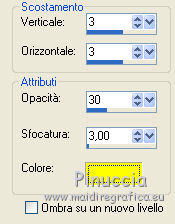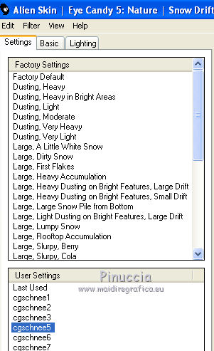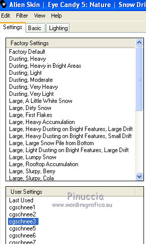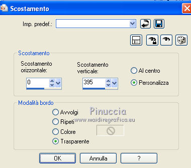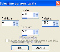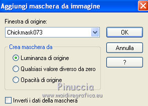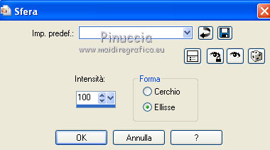 qui puoi trovare qualche risposta ai tuoi dubbi. Se l'argomento che ti interessa non è presente, ti prego di segnalarmelo. Per tradurre questo tutorial ho usato PSP X. Questo tutorial è una creazione di ©Titoune e non può essere copiato su altri siti nè essere offerto per il download. Lo stesso vale per la mia traduzione. Il materiale viene da vari gruppi di condivisione. Il copyright appartiene ai rispettivi autori. Grazie ai creatori dei tubes che mettono a disposizione il loro lavoro in vari gruppi di condivisione. Occorrente: Materiale qui Rispetta il lavoro degli autori, non cambiare il nome del file e non cancellare il watermark. Filtri: in caso di dubbi, ricorda di consultare la mia sezione filtri qui Penta.com - Color dot qui Transparency - Eliminate Black qui Alien Skin Eye Candy 5 Nature - Snow drift qui ![]() Metti i preset cgschnee3 e cgschnee5 nella cartella del filtro: Alien Skin Eye Candy 5 Impact>Settings>Glass. Se preferisci puoi importarlo, quando ti servirà, dalla cartella in cui hai scompattato il materiale. Vedi la scheda del filtro qui e come importare un preset in Eye Candy qui Apri le maschere in PSP, insieme al resto del materiale. 1. Imposta il colore di primo piano con il colore #fcb029, e il colore di sfondo con #6e0101. 2. Apri l'immagine red-christmas-background-with-christmas-balls-vector e vai a Modifica>Copia. 3. Apri una nuova immagine trasparente 400 x 500 pixels. Selezione>Seleziona tutto. Modifica>Incolla nella selezione. Selezione>Deseleziona. 4. Immagine>Dimensione tela - 1280 x 500 pixels. ![]() Livelli>Duplica. Immagine>Rifletti. Livelli>Unisci>Unisci giù. Selezione>Seleziona tutto. Selezione>Mobile. Selezione>Immobilizza. 5. Selezione>Modifica>Seleziona bordature selezione. ![]() Livelli>Nuovo livello raster. Riempi con il colore di primo piano.Selezione>Deseleziona. 6. Effetti>Plugins>Penta.com - Color dot, con i settaggi standard. ![]() 7. Effetti>Effetti 3D>Sfalsa ombra, con il colore #420203. ![]() Ripeti l'Effetto Sfalsa ombra, cambiando verticale e orizzontale con -3. Livelli>Duplica. 8. Effetti>Effetti geometrici>Sfera. ![]() Livelli>Unisci>Unisci giù - 2 volte. 9. Livelli>Nuovo livello raster. Livelli>Disponi>Sposta giù. Selezione>Seleziona tutto. 10. Apri l'immagine titoune_motif e vai a Modifica>Copia. Torna al tuo lavoro e vai a Modifica>Incolla nella selezione. Selezione>Deseleziona. 11. Apri una nuova immagine trasparente 480 x 500 pixels, e riempila con il colore di primo piano.Livelli>Nuovo livello maschera>Da immagine. Apri il menu sotto la finestra di origine e vedrai la lista dei files aperti. Tra questi la maschera. Seleziona la maschera wintermaske019_sigrid con i seguenti settaggi: ![]() Livelli>Unisci>Unisci gruppo. Modifica>Copia. Torna al tuo lavoro. Assicurati di essere posizionato sul livello inferiore e vai a Modifica>Incolla come nuovo livello. 12. Effetti>Effetti 3D>Sfalsa ombra, con i settaggi precedenti. 13. Apri l'immagine Christmas-tree-1373. Livelli>Innalza livello di sfondo. 14. Effetti>Plugins>Transparency - Eliminate Black. Modifica>Copia. Torna al tuo lavoro. Assicurati di essere posizionato sul livello superiore e vai a Modifica>Incolla come nuovo livello. 15. Immagine>Ridimensiona, al 50%, tutti i livelli non selezionato. Regola>Messa a fuoco>Metti a fuoco. Posiziona l'immagine al centro.![]() 16. Effetti>Effetti 3D>Sfalsa ombra con i settaggi precedenti. Livelli>Disponi>Sposta giù. 17. Apri il tuo tube - per il mio esempio GGSanta_095 - e vai a Modifica>Copia. Torna al tuo lavoro e vai a Modifica>Incolla come nuovo livello. 18. Immagine>Ridimensiona, al 115%, tutti i livelli non selezionato. Regola>Messa a fuoco>Metti a fuoco. Spostalo in basso a sinistra.Livelli>Duplica, e cambia la modalità di miscelatura di questo livello in Luce diffusa. 19. Effetti>Effetti 3D>Sfalsa ombra con i settaggi precedenti. Livelli>Unisci>Unisci giù. 20. Attiva lo strumento Gomma ![]() e cancella con cautela la manica del vestito in modo che la sfera sia completamente visibile. ![]() Dovresti avere questo. ![]() 21. Attiva il livello inferiore. Modifica>Copia. Selezione>Seleziona tutto. Immagine>Ritaglia la selezione. Livelli>Nuovo livello raster. 22. Livelli>Disponi>Porta sotto. Immagine>Dimensione tela - 1280 x 1500 pixels. ![]() Selezione>Seleziona tutto. Modifica>Incolla nella selezione. Selezione>Deseleziona. 23. Attiva il livello superiore. Livelli>Nuovo livello raster. 24. Attiva lo strumento Selezione ,clicca sull'icona Selezione personalizzata ![]() e imposta i seguenti settaggi: ![]() Riempi la selezione con il colore di primo piano.Attenzione: salva il lavoro in formato psp con la selezione attiva prima del prossimo passaggio. 25. Effetti>Plugins>Penta.com - Color Dot, con i settaggi standard. Se, cercando di applicare questo filtro, PSP si blocca e si chiude, avendo salvato il lavoro, potrai aprirlo nuovamente al punto in cui si è bloccato. In questo caso, evidentemente, il programma si è bloccato a causa della selezione. Quindi, una volta riaperto PSP e attivato il file salvato, prima di applicare il filtro vai a Selezione>Deseleziona. Applica il filtro e continua. Effetti>Effetti di bordo>Aumenta. 26. Effetti>Effetti 3D>Sfalsa ombra, con i settaggi precedenti. Selezione>Deseleziona (se hai seguito la variante, questo non serve, perchè hai già deselezionato prima). Effetti>Plugins>Alien Skin Eye Candy 5 Nature - Snow drift. Seleziona il preset cgschnee3 e ok. ![]() 28. Apri una nuova immagine trasparente 1280 x 500 pixels, e riempila con il colore di sfondo.29. Livelli>Nuovo livello maschera>Da immagine. Apri il menu sotto la finestra di origine e vedrai la lista dei files aperti. Tra questi le maschere. Seleziona la maschera Chickmask073 con i seguenti settaggi: ![]() Livelli>Unisci>Unisci gruppo. Modifica>Copia. Torna al tuo lavoro. Assicurati di essere posizionato sul livello inferiore e vai a Modifica>Incolla come nuovo livello. Effetti>Effetti di immagine>Scostamento. ![]() 31. Effetti>Plugins