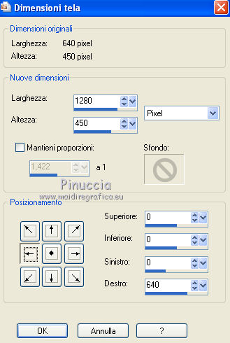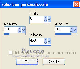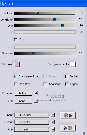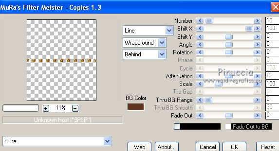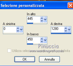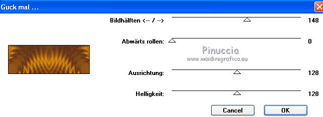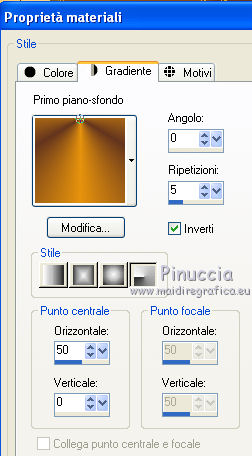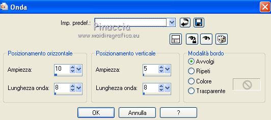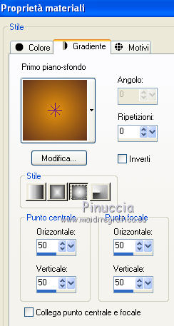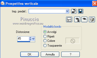 qui puoi trovare qualche risposta ai tuoi dubbi. Se l'argomento che ti interessa non è presente, ti prego di segnalarmelo. Per tradurre questo tutorial ho usato PSP X. Questo tutorial è una creazione di ©Titoune e non può essere copiato su altri siti nè essere offerto per il download. Lo stesso vale per la mia traduzione. Il materiale viene da vari gruppi di condivisione. Il copyright appartiene ai rispettivi autori. Grazie ai creatori dei tubes che mettono a disposizione il loro lavoro in vari gruppi di condivisione. Occorrente: Materiale qui Rispetta il lavoro degli autori, non cambiare il nome del file e non cancellare il watermark. Filtri: in caso di dubbi, ricorda di consultare la mia sezione filtri qui Flaming Pear - Flexify 2 qui Kiwi - Guck mal qui Mura's Meister - Copies qui Graphics Plus - Cross Shadow qui ![]() 1. Imposta il colore di primo piano con il colore #e6920d, e il colore di sfondo con #63341e. 2. Passa il colore di primo piano a Gradiente Radiale, con i seguenti settaggi. ![]() 3. Apri una nuova immagine trasparente 640 x 450 pixels, e riempila con il gradiente.4. Effetti>Effetti di distorsione>Onda. ![]() 5. Immagine>Dimensione tela - 1280 x 450 pixels. ![]() Livelli>Duplica. Immagine>Rifletti. Livelli>Unisci>Unisci giù. 6. Effetti>Plugins>Flaming Pear - Flexify 2. ![]() 7. Effetti>Plugins>Kiwi - Guck mal, con i settaggi standard. attenzione, trovi questo filtro in fondo alla lista, dopo le lettere dell'alfabeto ![]() ![]() 8. Effetti>Effetti geometrici>Prospettiva verticale. ![]() 9. Livelli>Nuovo livello raster. Attiva lo strumento Selezione ,clicca sull'icona Selezione personalizzata ![]() e imposta i seguenti settaggi: ![]() 10. Cambia i settaggi del gradiente. ![]() Riempi la selezione con questo gradiente.Cambia la modalità di miscelatura di questo livello in Dissolvi, e abbassa l'opacità al 20%. 11. Livelli>Nuovo livello raster. Riempi con il colore di sfondo.12. Effetti>Plugins>Graphics Plus - Cross Shadow, con i settaggi standard. ![]() 13. Selezione>Modifica>Contrai - 4 pixels. Premi sulla tastiera il tasto CANC. 14. Effetti>Effetti 3D>Sfalsa ombra, con il colore #100704. ![]() Ripeti l'Effetto Sfalsa ombra, cambiando verticale e orizzontale con -4. 15. Mantieni selezionato. Livelli>Nuovo livello raster. Apri il tube serce1 e vai a Modifica>Copia. Torna al tuo lavoro e vai a Modifica>Incolla nella selezione. Selezione>Deseleziona. 16. Livelli>Duplica. Cambia la modalità di miscelatura di questo livello in luce diffusa. 17. Effetti>Effetti 3D>Sfalsa ombra, con i settaggi precedenti. 18. Attiva il livello inferiore. Livelli>Nuovo livello raster. Livelli>Disponi>Porta sotto. 19. Immagine>Dimensione tela - 1280 x 1500 pixels. ![]() Imposta nuovamente il gradiente con i settaggi iniziali. ![]() Riempi il livello con questo gradiente.20. Attiva il livello superiore. Livelli>Nuovo livello raster. 21. Selezione personalizzata ![]() ![]() Riempi la selezione con il gradiente.22. Effetti>Plugins>Graphics Plus - Cross Shadow, con i settaggi standard. 23. Effetti>Effetti 3D>Sfalsa ombra, con i settaggi precedenti. 24. Selezione>Deseleziona. Apri il tube CJ_Jeweled Brooch (per il mio esempio ho scelto il livello Layer 1). Modifica>Copia. Torna al tuo lavoro e vai a Modifica>Incolla come nuovo livello. 25. Immagine>Ridimensiona, al 40%, tutti i livelli non selezionato. Regola>Messa a fuoco>Metti a fuoco. 26. Immagine>Ruota per gradi - 45 gradi a destra. ![]() 27. Effetti>Plugins>Mura's Meister - Copies. ![]() 28. Effetti>Effetti di immagine>Scostamento. ![]() 29. Effetti>Effetti 3D>Sfalsa ombra, con i settaggi precedenti. 30. Apri il tube Ginamistedfemme538 e vai a Modifica>Copia. Torna al tuo lavoro e vai a Modifica>Incolla come nuovo livello. 31. Immagine>Ridimensiona, al 65%, tutti i livelli non selezionato. Regola>Messa a fuoco>Metti a fuoco. Posiziona in basso a sinistra sul bordo.Livelli>Disponi>Sposta giù. Aggiungi il tuo nome e/o il tuo watermark. Livelli>Unisci>Unisci tutto e salva in formato jpg. ![]() ![]() Se hai problemi o dubbi, o trovi un link non funzionante, o anche soltanto per un saluto, scrivimi. 14 Ottobre 2010 |