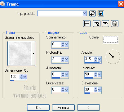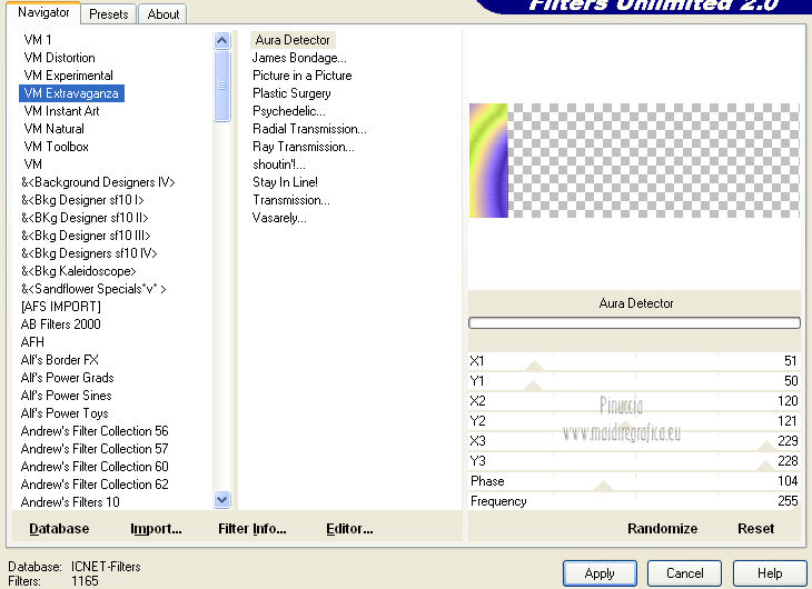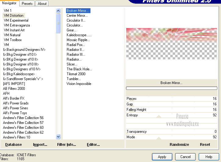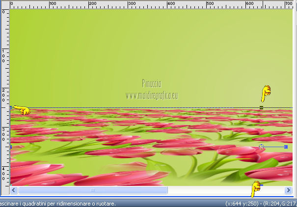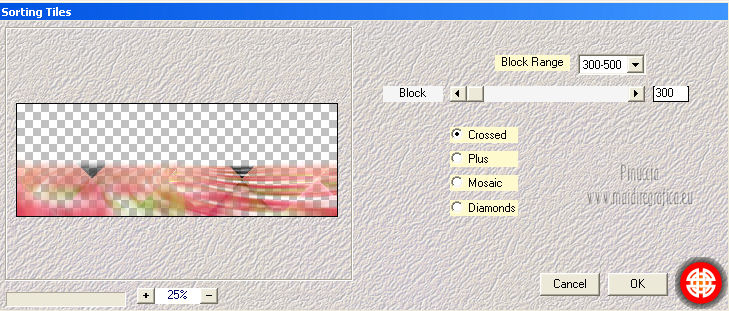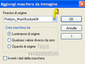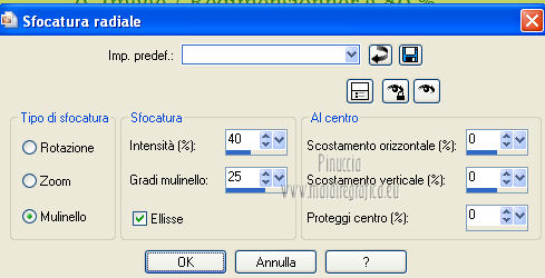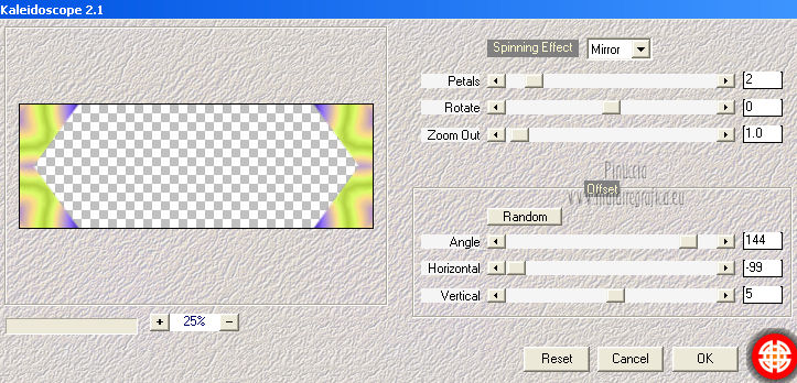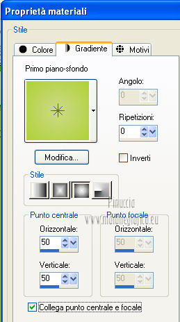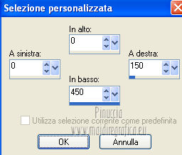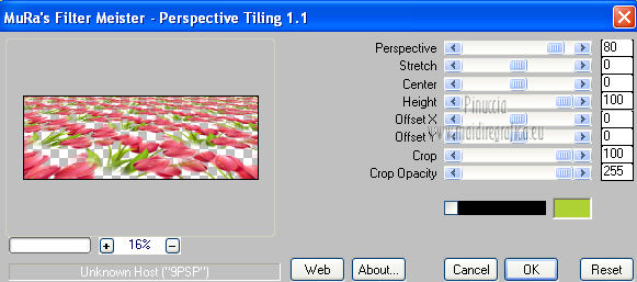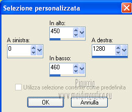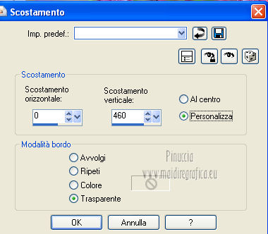 qui puoi trovare qualche risposta ai tuoi dubbi. Se l'argomento che ti interessa non è presente, ti prego di segnalarmelo. Per tradurre questo tutorial ho usato PSP X. Questo tutorial è una creazione di ©Titoune e non può essere copiato su altri siti nè essere offerto per il download. Lo stesso vale per la mia traduzione. Grazie ai creatori dei tubes che mettono a disposizione il loro lavoro in vari gruppi di condivisione. Rispetta il lavoro degli autori, non cambiare il nome del file e non cancellare il watermark. Occorrente: Materiale qui Il tube della donna è di IvoChile. Il tube "i022611" è di Jring's Pngs. Filtri: consulta, se necessario, la mia sezione filtri qui Mehdi - Kaleidoscope 2.1 qui Filters Unlimited 2.0 qui Mehdi - sorting Tiles qui VM Distortion - Broken Mirror qui VM Extravaganza - Aura Detector qui ![]() Apri la maschera "PrettyJu_MaskBordure04" in PSP e minimizzala con il resto del materiale. 1. Imposta il colore di primo piano con #cdd989, e il colore di sfondo con #aed234. Passa il colore di primo piano a Gradiente, stile Sprazzo di luce. ![]() 2. Apri una nuova immagine trasparente 1280 x 450 pixels, e riempila con il gradiente.3. Livelli>Nuovo livello raster. Selezione>Seleziona tutto. 4. Apri il tube i022611 e vai a Modifica>Copia. Torna al tuo lavoro e vai a Modifica>Incolla nella selezione. Selezione>Deseleziona. 5. Effetti>Effetti di immagine>Motivo unico, con i settaggi standard. ![]() 6. Effetti>Plugins>Mura's Meister - Perspective Tiling. ![]() Se non visualizzi i Righelli, vai a Visualizza>Righelli. 7. Attiva lo strumento Puntatore ![]() se stai usando PSP 9 lo strumento Deformazione ![]() in modalità Scala, spingi il nodo superiore centrale in basso fino a 250 pixels, (puoi controllare la posizione nella barra inferiore: quella che ti interessa è la posizione "Y"). ![]() Rinomina questo livello "tiling 1". Livelli>Duplica. 8. Effetti>Effetti di distorsione>Coordinate polari. ![]() 9. Immagine>Ridimensiona, all'80%, tutti i livelli non selezionato. Rinomina questo livello "tiling 2" e chiudilo per il momento. 10. Attiva il livello "tiling 1". Regola>Sfocatura>Sfocatura radiale. ![]() 11. Effetti>Effetti di trama>Trama - seleziona la trama Grana fine nuvoloso con i seguenti settaggi. ![]() Livelli>Duplica. Immagine>Capovolgi. 12. Effetti>Plugins>Filters Unlimited 2.0 - VM Distortion - Broken Mirror. ![]() Effetti>Effetti di bordo>Aumenta. 13. Effetti>Effetti 3D>Sfalsa ombra, con il colore #4c0816. ![]() Ripeti l'Effetto Sfalsa ombra, cambiando verticale e orizzontale con -3. Rinomina questo livello "tiling 3". 14. Attiva nuovamente il livello "tiling 1". Effetti>Plugins>Mehdi - Sorting Tiles. ![]() 15. Effetti>Effetti geometrici>Prospettiva verticale. ![]() Effetti>Effetti di bordo>Aumenta. 16. Apri e attiva il livello "tiling 2". Effetti>Effetti geometrici>Cilindro orizzontale. ![]() 17. Effetti>Effetti 3D>Sfalsa ombra, con i settaggi precedenti. 18. Attiva il livello Raster 1. Attiva lo strumento Selezione ,clicca sull'icona Selezione personalizzata ![]() e imposta i seguenti settaggi: ![]() Selezione>Innalza selezione a livello. Selezione>Deseleziona. 19. Effetti>Plugins>Filters Unlimited 2.0 - VM Extravaganza - Aura Detector. ![]() 20. Effetti>Plugins>Mehdi - Kaleidoscope 2.1. ![]() 21. Effetti>Effetti di distorsione>Coordinate polari, con i settaggi precedenti. 22. Effetti>Effetti geometrici>Cilindro orizzontale, con i settaggi precedenti. Livelli>Duplica. Immagine>Capovolgi. 23. Attiva il livello superiore (Tiling 2). Attiva nuovamente il tube i022611 e vai a Modifica>Copia. Torna al tuo lavoro e vai a Modifica>Incolla come nuovo livello. 24. Immagine>Ridimensiona, al 35%, tutti i livelli non selezionato. Regola>Messa a fuoco>Metti a fuoco. Spostalo in basso a sinistra.25. Effetti>Effetti di riflesso>Specchio rotante. ![]() 26. Effetti>Effetti 3D>Sfalsa ombra, con i settaggi precedenti. 27. Apri il tube CGS_PA_WENDYDEPAAUW_THEAUSTRALIANABC_10 e vai a Modifica>Copia. Torna al tuo lavoro e vai a Modifica>Incolla come nuovo livello. 28. Immagine>Ridimensiona, al 45%, tutti i livelli non selezionato. Regola>Messa a fuoco>Metti a fuoco. Spostalo in alto a sinistra.29. Effetti>Effetti di riflesso>Specchio rotante. ![]() Effetti>Effetti 3D>Sfalsa ombra, con i settaggi precedenti. 30. Apri il tube IvoChile 277-Baby doll e vai a Modifica>Copia. Torna al tuo lavoro e vai a Modifica>Incolla come nuovo livello. 31. Immagine>Ridimensiona, all'80%, tutti i livelli non selezionato. Immagine>Rifletti. Spostalo al centro, come nel mio esempio.32. Attiva il livello Raster 1. Selezione>Seleziona tutto. Immagine>Ritaglia la selezione. 33. Immagine>Dimensioni tela - 1280 x 1500. ![]() 35. Livelli>Nuovo livello raster. Livelli>Disponi>Sposta giù. Riempi con il gradiente di partenza.36. Apri una nuova immagine trasparente 1280 x 450 pixels, e riempila con lo stesso gradiente.37. Effetti>Effetti di trama>Trama, con i settaggi precedenti. 38. Livelli>Nuovo livello raster. Selezione>Seleziona tutto. Attiva nuovamente il tube i022611 e vai a Modifica>Copia. Torna al tuo lavoro e vai a Modifica>Incolla nella selezione. Selezione>Deseleziona. 39. Effetti>Effetti di riflesso>Specchio rotante, con i settaggi precedenti. 40. Effetti>Effetti di distorsione>Coordinate polari, con i settaggi precedenti. Livelli>Unisci>Unisci visibile. 41. Livelli>Nuovo livello maschera>Da immagine. Apri il menu sotto la finestra di origine e vedrai la lista dei files aperti. Seleziona la maschera PrettyJu_MaskBordure04, con i seguenti settaggi: ![]() Livelli>Unisci>Unisci gruppo. Modifica>Copia. Torna al tuo top e vai a Modifica>Incolla come nuovo livello. 42. Effetti>Effetti di immagine>Scostamento. ![]() Effetti>Effetti 3D>Sfalsa ombra, con i settaggi precedenti. 43. Selezione personalizzata ![]() ![]() Selezione>Innalza selezione a livello. Livelli>Disponi>Porta in alto. 44. Effetti>Effetti 3D>Smusso a incasso. ![]() Firma il tuo lavoro. 45. Livelli>Unisci>Unisci tutto e salva in formato j