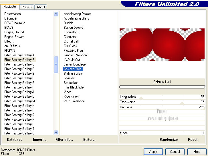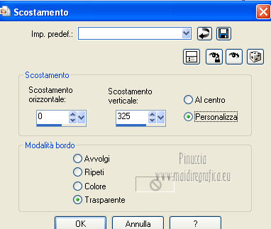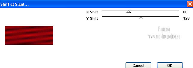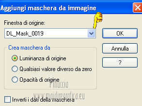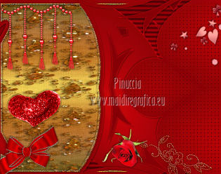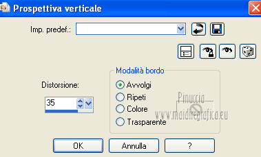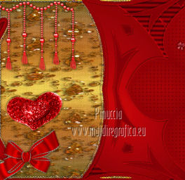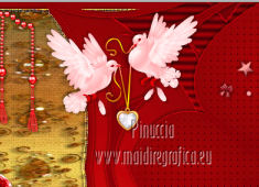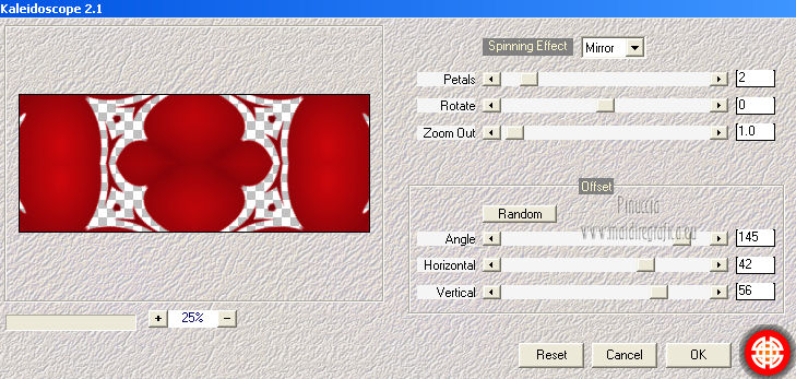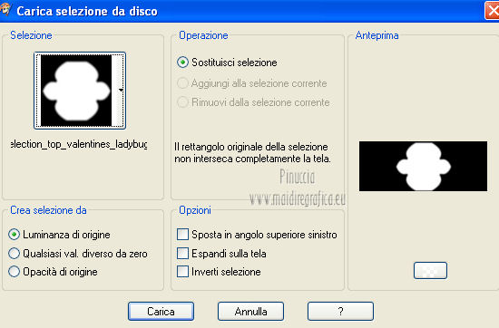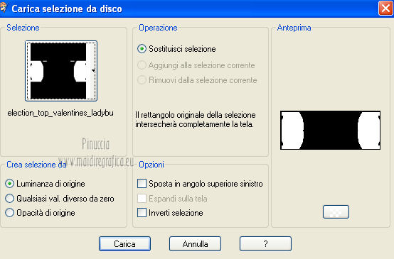 qui puoi trovare qualche risposta ai tuoi dubbi. Se l'argomento che ti interessa non è presente, ti prego di segnalarmelo. Per tradurre questo tutorial ho usato PSP X. Questo tutorial è una creazione di ©Titoune e non può essere copiato su altri siti nè essere offerto per il download. Lo stesso vale per la mia traduzione. Grazie ai creatori dei tubes che mettono a disposizione il loro lavoro in vari gruppi di condivisione. Rispetta il lavoro degli autori, non cambiare il nome del file e non cancellare il watermark. Occorrente: Un tube a scelta. Il resto del materiale qui Tubes utilizzati di Zezette2 Gli elementi scrap sono una creazione P&ADezigns Filtri: Penta.com - Dot and Cross qui Filters Unlimited 2.0 qui Filter Factory Gallery B - Seismic Twirl qui Mura's Seamless - Sift at Slant qui Mehdi - Kaleidoscope 2-1 qui ![]() Metti le selezioni nella cartella Selezioni. Apri la maschera in PSP e minimizzala con il resto del materiale. 1. Imposta il colore di primo piano con #cd060b, e il colore di sfondo con #390007. Passa il colore di primo piano a Gradiente, stile Sprazzo di luce. ![]() 2. Apri una nuova immagine trasparente 1280 x 500 pixels, e riempila con il gradiente.Livelli>Duplica. Immagine>Ridimensiona, all'85%, tutti i livelli non selezionato. 3. Effetti>Plugins>Filters Unlimited 2.0 - Filter Factory Gallery B - Seismic Twirl. ![]() Effetti>Effetti di bordo>Aumenta. 4. Effetti>Effetti di riflesso>Specchio rotante. ![]() 5. Effetti>Effetti geometrici>Prospettiva verticale. ![]() Livelli>Duplica. 6. Effetti>Plugins>Mehdi - Kaleidoscope 2.1. ![]() Rinomina questo livello "motivo". 7. Attiva il livello inferiore. Livelli>Duplica. 8. Effetti>Plugins>Mura's Seamless - Shift at Slant. ![]() 9. Attiva il livello "motivo". Selezione>Carica/Salva selezione>Carica selezione da disco. Cerca e carica la selezione "selection_top_valentine_ladybug". ![]() 10. Livelli>Nuovo livello raster. Apri la trama Paper14 e vai a Modifica>Copia. Torna al tuo lavoro e vai a Modifica>Incolla nella selezione. 11. Selezione>Modifica>Seleziona bordature selezione. ![]() 12. Effetti>Effetti 3D>Smusso a incasso. ![]() Effetti>Plugins>Penta.com - Dot and Cross, con i settaggi standard. ![]() Effetti>Effetti di bordo>Aumenta. Selezione>Innalza selezione a livello. Selezione>Deseleziona. 13. Effetti>Effetti 3D>Sfalsa ombra, con il colore #190102. ![]() Ripeti l'Effetto Sfalsa ombra, cambiando verticale e orizzontale con -3. 14. Attiva il livello "motivo". Selezione>Carica/Salva selezione>Carica selezione da disco. Cerca e carica la selezione "selection_top_valentine_ladybug2". ![]() 15. Effetti>Effetti di trama>Intessitura. Colore intessitura #950409 - Riempi spazi #530108. ![]() Selezione>Innalza selezione a livello. Selezione>Deseleziona. 16. Attiva nuovamente il livello "motivo". Effetti>Effetti 3D>Sfalsa ombra, con i settaggi precedenti. Attiva il livello superiore. 17. Apri l'elemento "23" e vai a Modifica>Copia. Torna al tuo lavoro e vai a Modifica>Incolla come nuovo livello. Spostalo al centro, come nel mio esempio.Effetti>Effetti 3D>Sfalsa ombra, con i settaggi precedenti. 18. Apri l'elemento "53" e vai a Modifica>Copia. Torna al tuo lavoro e vai a Modifica>Incolla come nuovo livello. Spostalo in alto.Vedi l'esempio finale. Effetti>Effetti 3D>Sfalsa ombra, con i settaggi precedenti. 19. Apri l'elemento "41" e vai a Modifica>Copia. Torna al tuo lavoro e vai a Modifica>Incolla come nuovo livello. Immagine>Rifletti. Spostalo in basso a sinistra.![]() 20. Effetti>Effetti di riflesso>Specchio rotante, con i settaggi precedenti. Effetti>Effetti 3D>Sfalsa ombra, con i settaggi precedenti. 21. Apri l'elemento BYMURFREEBIEVALENTINEDAY11(13) e vai a Modifica>Copia. Torna al tuo lavoro e vai a Modifica>Incolla come nuovo livello. 22. Regola>Tonalità e saturazione>Viraggio. ![]() Spostalo a sinistra.![]() Effetti>Effetti di riflesso>Specchio rotante, con i settaggi precedenti. Effetti>Effetti 3D>Sfalsa ombra, con i settaggi precedenti. 23. Apri l'elemento "33" e vai a Modifica>Copia. Torna al tuo lavoro e vai a Modifica>Incolla come nuovo livello. Spostalo in basso.Effetti>Effetti di riflesso>Specchio rotante, con i settaggi precedenti. Effetti>Effetti 3D>Sfalsa ombra, con i settaggi precedenti. ![]() 24. Apri l'elemento BYMURFREEBIEVALENTINEDAY11(8) e vai a Modifica>Copia. Torna al tuo lavoro e vai a Modifica>Incolla come nuovo livello. Spostalo in basso a sinistra.Effetti>Effetti di riflesso>Specchio rotante, con i settaggi precedenti. Effetti>Effetti 3D>Sfalsa ombra, con i settaggi precedenti. ![]() 25. Apri il tube delle colombe e vai a Modifica>Copia. Torna al tuo lavoro e vai a Modifica>Incolla come nuovo livello. Spostalo in alto a sinistra.Livelli>Duplica. Regola>Tonalità e saturazione>Viraggio, con i settaggi precedenti. 26. Attiva lo strumento Gomma , dimensione 20,e cancella le parti del gioiello della catena, in modo che appaia il colore originale. ![]() 27. Attiva il livello sottostante dell'originale. Effetti>Effetti 3D>Sfalsa ombra, con i settaggi precedenti. 28. Apri il tube Wordart e vai a Modifica>Copia. Torna al tuo lavoro e vai a Modifica>Incolla come nuovo livello. Spostalo in alto a destra.![]() 29. Apri il tuo tube e vai a Modifica>Copia. Torna al tuo lavoro e vai a Modifica>Incolla come nuovo livello. Immagine>Ridimensiona, se e quanto necessario, tutti i livelli non selezionato. Posiziona il tube come preferisci o vedi il mio esempio.Effetti>Effetti 3D>Sfalsa ombra, con i settaggi precedenti. 30. Attiva il livello Raster 1. Selezione>Seleziona tutto. Immagine>Ritaglia la selezione. 31. Immagine>Dimensioni tela - 1280 x 1500 pixels. ![]() 32. Livelli>Nuovo livello raster. Livelli>Disponi>Sposta giù. Riempi con il gradiente.33. Apri una nuova immagine trasparente 1280 x 350 pixels, e riempila con il gradiente.34. Livelli>Nuovo livello maschera>Da immagine. Apri il menu sotto la finestra di origine e vedrai la lista dei files aperti. Seleziona la maschera DL_Mask_0019, con i seguenti settag