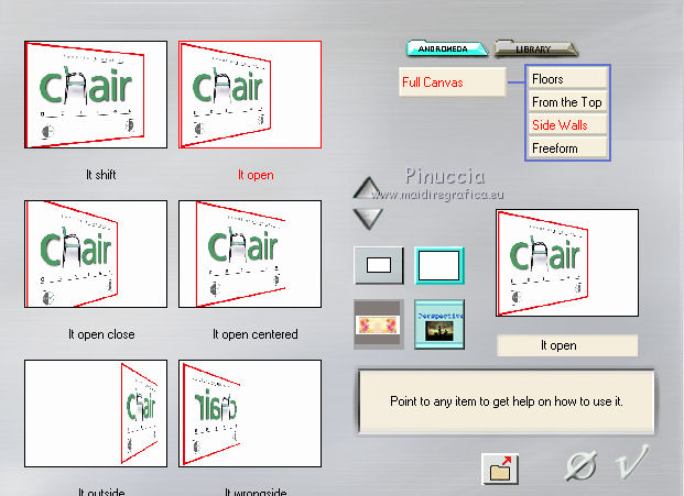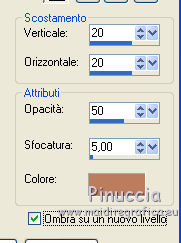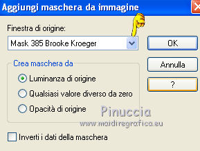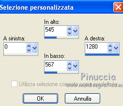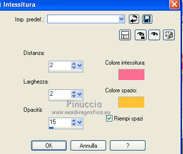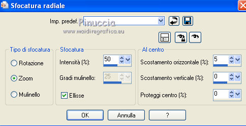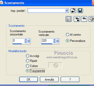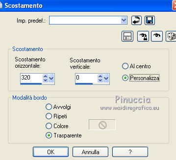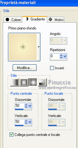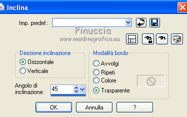 qui puoi trovare qualche risposta ai tuoi dubbi. Se l'argomento che ti interessa non è presente, ti prego di segnalarmelo. Per tradurre questo tutorial ho usato PSP X. Questo tutorial è una creazione di ©Titoune e non può essere copiato su altri siti nè essere offerto per il download. Lo stesso vale per la mia traduzione. Il materiale viene da vari gruppi di condivisione. Il copyright appartiene ai rispettivi autori. Grazie ai creatori dei tubes che mettono a disposizione il loro lavoro in vari gruppi di condivisione. Occorrente: Materiale qui Rispetta il lavoro degli autori, non cambiare il nome del file e non cancellare il watermark. Filtri: consulta, se necessario, la mia sezione filtri qui Tramages - Tow the line qui Andromeda - Perspective qui Simple - Diamonds qui ![]() Apri la maschera 385_Brooke_Kroeger in PSP e minimizzala con il resto del materiale. 1. Imposta il colore di primo piano con #faf5cb, e il colore di sfondo con #eddbb3. 2. Apri l'immagine "Flower decor". Duplicala usando la combinazione di tasti maiuscola+D e chiudi l'originale. La copia sarà la base del tuo lavoro. Livelli>Innalza livello di sfondo. 3. Immagine>Ridimensiona, a 640 x 550 pixels, mantieni proporzioni non selezionato. ![]() Immagine>Rifletti. 4. Immagine>Dimensioni tela - 1280 x 500 pixels. ![]() Livelli>Duplica. Immagine>Rifletti. Livelli>Unisci>Unisci giù. Fai una copia di questa immagine (maiuscola+D) e minimizzala. Ti servirà più tardi per la maschera. 5. Torna al tuo lavoro. Livelli>Duplica. Immagine>Ridimensiona, all'85%, tutti i livelli non selezionato. 6. Effetti>Plugins>Andromeda - Perspective. clicca su Preset ![]() e imposta i seguenti settaggi. ![]() 7. Attiva il livello inferiore. Selezione>Seleziona tutto. Selezione>Modifica>Contrai - 35 pixels. Selezione>Inverti. 8. Selezione>Innalza selezione a livello. Chiudi questo livello. Mantieni selezionato. 9. Attiva nuovamente il livello inferiore. Regola>Sfocatura>Sfocatura radiale. ![]() 10. Effetti>Effetti 3D>Smusso a incasso. ![]() 11. Riapri e attiva il livello della selezione innalzata. 12. Effetti>Plugins>Tramages - Tow the line, con i settaggi standard. ![]() 13. Effetti>Plugins>Simple - Diamonds. Selezione>Deseleziona. 14. Attiva il livello superiore (Andromeda). 15. Effetti>Effetti geometrici>Inclina. ![]() 16. Immagine>Ridimensiona, all'85%, tutti i livelli non selezionato. 17. Effetti>Effetti di immagine>Scostamento. ![]() 18. Effetti>Effetti 3D>Sfalsa ombra, con il colore #bc7d5e, ombra su nuovo livello selezionato. ![]() 19. Rimani posizionato sul livello dell'ombra. Effetti>Effetti di trama>Intessitura. ![]() 20. Attiva il livello superiore. Livelli>Unisci>Unisci giù. 21. Selezione>Seleziona tutto. Selezione>Modifica>Contrai - 35 pixels. Selezione>Inverti. Premi sulla tastiera il tasto CANC. Selezione>Deseleziona. 22. Effetti>Effetti 3D>Sfalsa ombra, con il colore #bb7d5e, non dimenticare di deselezionare Ombra su nuovo livello. ![]() Ripeti l'Effetto Sfalsa ombra, cambiando verticale e orizzontale con -2. 23. Apri l'immagine Hed_Kandi_Serve_Chilled e vai a Modifica>Copia. Torna al tuo lavoro e vai a Modifica>Incolla come nuovo livello. 24. Immagine>Ridimensiona, al 35%, tutti i livelli non selezionato. 25. Effetti>Effetti di immagine>Scostamento. ![]() 26. Selezione>Seleziona tutto. Selezione>Mobile. Selezione>Immobilizza. 27. Selezione>Modifica>Seleziona bordature selezione. ![]() 28. Attiva il livello inferiore. Selezione>Innalza selezione a livello. 29. Effetti>Effetti 3D>Smusso a incasso, con i settaggi precedenti. Selezione>Deseleziona. 30. Livelli>Disponi>Porta in alto (sopra il livello dell'immagine vettoriale). Livelli>Unisci>Unisci giù. 30. Effetti>Effetti 3D>Sfalsa ombra, con il colore #bb7d5e. ![]() Ripeti l'Effetto Sfalsa ombra, cambiando verticale e orizzontale con -1. Livelli>Disponi>Sposta giù. 31. Attiva il livello superiore. Apri il tube di Thafs e vai a Modifica>Copia. Torna al tuo lavoro e vai a Modifica>Incolla come nuovo livello. 32. Immagine>Ridimensiona, al 65%, tutti i livelli non selezionato. Spostalo in basso a sinistra.33. Effetti>Effetti 3D>Sfalsa ombra, con i settaggi precedenti. 34. Attiva il livello Raster 1. Selezione>Seleziona tutto. Immagine>Ritaglia la selezione. 35. Immagine>Dimensioni tela - 1280 x 1500 pixels. ![]() 36. Livelli>Nuovo livello raster. Livelli>Disponi>Sposta giù. 37. Passa il colore di primo piano a Gradiente. ![]() 38. Riempi il livello con il gradiente.39. Apri una nuova immagine trasparente 1280 x 350 pixels. Selezione>Seleziona tutto. 40. Attiva l'immagine che hai minimizzato all'inizio e vai a Modifica>Copia. Torna al tuo lavoro e vai a Modifica>Incolla nella selezione. Selezione>Deseleziona. 41. Livelli>Nuovo livello maschera>Da immagine. Apri il menu sotto la finestra di origine e vedrai la lista dei files aperti. Tra questi la maschera. Seleziona la maschera Mask385_Brooke Kroeger, con i seguenti settaggi: ![]() Livelli>Unisci>Unisci gruppo. Modifica>Copia. Attiva il tuo top e vai a Modifica>Incolla come nuovo livello. 42. Effetti>Effetti di immagine>Scostamento. ![]() 43. Attiva lo strumento Selezione ,clicca sull'icona Selezione personalizzata ![]() e imposta i seguenti settaggi: ![]() 44. Effetti>Effetti 3D>Smusso a incasso, con i settaggi precedenti. Selezione>Deseleziona. 45. Effetti>Effetti 3D>Sfalsa ombra, con i settaggi precedenti. Firma il tuo lavoro. Livelli>Unisci>Unisci tutto e salva in formato jpg. ![]() ![]() Se hai problemi o dubbi, o trovi un link non funzionante, o anche soltanto per un saluto, scrivimi. 10 Luglio 2011 |