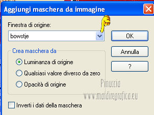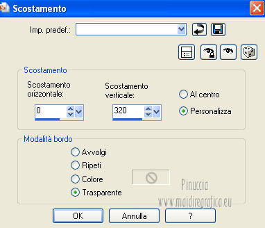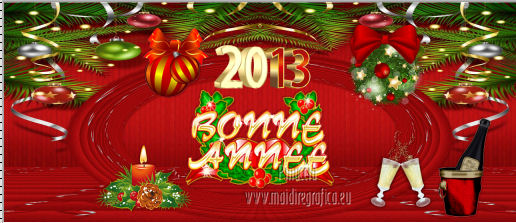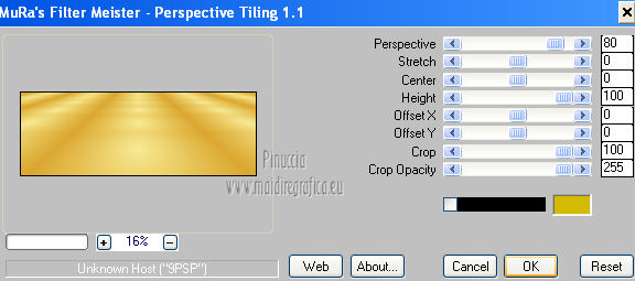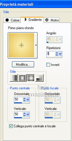 qui puoi trovare qualche risposta ai tuoi dubbi. Se l'argomento che ti interessa non è presente, ti prego di segnalarmelo. Per tradurre questo tutorial ho usato PSP X. Questo tutorial è una creazione di ©Titoune e non può essere copiato su altri siti nè essere offerto per il download. Lo stesso vale per la mia traduzione. Grazie ai creatori dei tubes che mettono a disposizione il loro lavoro in vari gruppi di condivisione. Rispetta il lavoro degli autori, non cambiare il nome del file e non cancellare il watermark. Occorrente: Un tube a scelta. Il resto del materiale qui Il tube è di Gerry. Tubes ed elementi di Zezette2. Filtri: Adjust - Variations qui Mura's Meister - Perspective Tiling qui ![]() Apri la maschera in PSP e minimizzala con il resto del materiale. 1. Imposta il colore di primo piano con #fbf3b7, e il colore di sfondo con #e6bf52. 2. Apri una nuova immagine trasparente 1280 x 550 pixels. Selezione>Seleziona tutto. 3. Apri l'elemento 815c711e e vai a Modifica>Copia. Torna al tuo lavoro e vai a Modifica>Incolla nella selezione. Selezione>Deseleziona. 4. Immagine>Ridimensiona, al 75%, tutti i livelli non selezionato. Sposta l'immagine in alto a sinistra.![]() 5. Effetti>Effetti di riflesso>Specchio rotante. ![]() Dovresti avere questo. ![]() Livelli>Duplica, e chiudi questo livello. 6. Attiva il livello sottostante dell'originale. Attiva lo strumento Puntatore ![]() se stai usando PSP 9 lo strumento deformazione ,e - in modalità Scala - spingi in basso il nodo superiore al centro, fino a coprire la parte trasparente. ![]() 7. Apri e attiva il livello superiore della copia. Attiva lo strumento Bacchetta magica ![]() e clicca nella parte trasparente per selezionarla. ![]() Selezione>Inverti. 8. Attiva il livello sottostante dell'originale. Premi sulla tastiera il tasto CANC. Selezione>Deseleziona. Rimani posizionato su questo livello. 9. Effetti>Plugins>Mura's Meister - Perspective Tiling. ![]() 10. Se non visualizzi i Righelli, vai a Visualizza>Righelli. Attiva lo strumento Puntatore /Deformazione ,e - in modalità Scala - spingi in basso il nodo superiore al centro, fino a 400 pixels. eventualmente, per vedere meglio, chiudi momentaneamente il livello superiore ![]() Livelli>Duplica. Livelli>Disponi>Porta in alto. Riapri il livello chiuso, rimanendo posizionato sul livello superiore. ![]() 11. Effetti>Effetti di distorsione>Coordinate polari. ![]() 12. Immagine>Ridimensiona, al 75%, tutti i livelli non selezionato. Sposta l'immagine un po' più in basso.![]() Regola>Messa a fuoco>Metti a fuoco. 13. Effetti>Effetti 3D>Sfalsa ombra, con il colore #400000. ![]() Ripeti l'Effetto Sfalsa ombra, cambiando verticale e orizzontale con -3. 14. Apri l'elemento 2013 (b222a1d5_z_gold) e vai a Modifica>Copia. Torna al tuo lavoro e vai a Modifica>Incolla come nuovo livello. Spostalo in alto.Vedi l'esempio finale. Effetti>Effetti 3D>Sfalsa ombra, con i settaggi precedenti. 15. Apri l'elemento bonne_annee e vai a Modifica>Copia. Torna al tuo lavoro e vai a Modifica>Incolla come nuovo livello. Spostalo nell'ellise.![]() 16. Apri l'elemento a29870dd e vai a Modifica>Copia. Torna al tuo lavoro e vai a Modifica>Incolla come nuovo livello. Sposta l'elemento in alto a sinistra.![]() Effetti>Effetti 3D>Sfalsa ombra, con i settaggi precedenti. 17. Apri l'elemento 0f64a52d e vai a Modifica>Copia. Torna al tuo lavoro e vai a Modifica>Incolla come nuovo livello. Spostalo in alto a destra.![]() Effetti>Effetti 3D>Sfalsa ombra, con i settaggi precedenti. 18. Apri l'elemento f1b4035c e vai a Modifica>Copia. Torna al tuo lavoro e vai a Modifica>Incolla come nuovo livello. Spostalo in basso a sinistra.Vedi l'esempio finale. Effetti>Effetti 3D>Sfalsa ombra, con i settaggi precedenti. 19. Apri l'elemento NQ-champagna bottle and buckle e vai a Modifica>Copia. Torna al tuo lavoro e vai a Modifica>Incolla come nuovo livello. Spostalo in basso a destra.Vedi l'esempio finale. Effetti>Effetti 3D>Sfalsa ombra, con i settaggi precedenti. 20. Apri l'elemento Champagne Glazen e vai a Modifica>Copia. Torna al tuo lavoro e vai a Modifica>Incolla come nuovo livello. Spostalo in basso a destra.Nessun Effetto Sfalsa ombra. ![]() 21. Apri il tuo tube e vai a Modifica>Copia. Torna al tuo lavoro e vai a Modifica>Incolla come nuovo livello. Immagine>Ridimensiona, se e quanto necessario, tutti i livelli non selezionato. Regola>Messa a fuoco>Metti a fuoco. Spostalo dove preferisci o vedi il mio esempio.Effetti>Effetti 3D>Sfalsa ombra, con i settaggi precedenti. Se vuoi, decora il top a tuo piacimento. 22. Attiva il livello Raster 1. Selezione>Seleziona tutto. Immagine>Ritaglia la selezione. 23. Immagine>Dimensioni tela - 1280 x 1500 pixels. ![]() 24. Livelli>Nuovo livello raster. Livelli>Disponi>Sposta giù. 25. Selezione>Seleziona tutto. Apri l'elemento "tuile" e vai a Modifica>Copia. Torna al tuo lavoro e vai a Modifica>Incolla nella selezione. Selezione>Deseleziona. 26. Apri una nuova immagine trasparente 1280 x 450 pixels. Passa il colore di primo piano a Gradiente, stile Sprazzo di luce. ![]() Riempi l'immagine trasparente con il gradiente.27. Selezione>Seleziona tutto. Selezione>Modifica>Contrai - 25 pixels. Selezione>Innalza selezione a livello. Selezione>Deseleziona. 28. Effetti>Plugins>Adjust - Variations, un clic su Original, per annullare eventuali precedenti settaggi memorizzati dal filtro, due clic su Darker e ok. 29. Effetti>Plugins>Mura's Meister - Perspective Tiling. ![]() Effetti>Effetti di bordo>Aumenta. 30. Attiva lo strumento Puntatore /Deformazione ,e - in modalità Scala - spingi in basso il nodo superiore centrale fino a 300 pixels. ![]() 31. Effetti>Effetti 3D>Sfalsa ombra, con il colore #400000. ![]() Ripeti l'Effetto Sfalsa ombra, cambiando verticale e orizzontale con -3. Livelli>Unisci>Unisci giù. 32. Livelli>Nuovo livello maschera>Da immagine. Apri il menu sotto la finestra di origine e vedrai la lista dei files aperti. Seleziona la maschera bowstje, con i seguenti settaggi. ![]() Livelli>Unisci