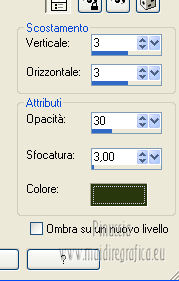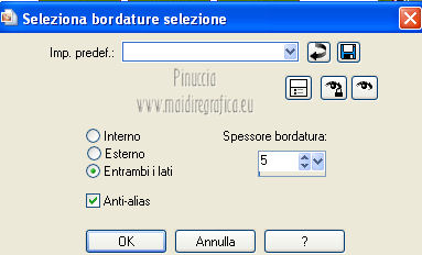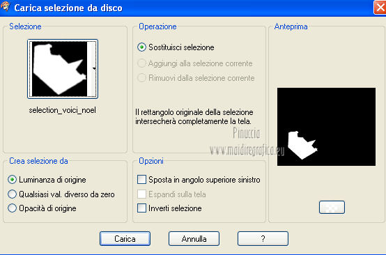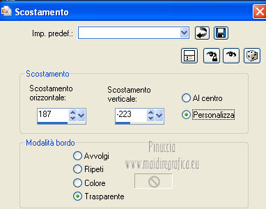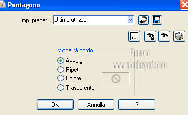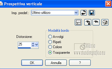 qui puoi trovare qualche risposta ai tuoi dubbi. Se l'argomento che ti interessa non è presente, ti prego di segnalarmelo. Per tradurre questo tutorial ho usato PSP X. Questo tutorial è una creazione di ©Titoune e non può essere copiato su altri siti nè essere offerto per il download. Lo stesso vale per la mia traduzione. Grazie ai creatori dei tubes che mettono a disposizione il loro lavoro in vari gruppi di condivisione. Rispetta il lavoro degli autori, non cambiare il nome del file e non cancellare il watermark. Occorrente: Materiale qui Filtri: Flaming Pear - Flexify 2 qui Animation Shop qui ![]() Metti la selezione nella cartella Selezioni. 1. Apri una nuova immagine trasparente 750 x 600 pixels. Selezione>Seleziona tutto. 2. Apri l'elemento Christmas e vai a Modifica>Copia. Torna al tuo lavoro e vai a Modifica>Incolla nella selezione. Selezione>Deseleziona. 3. Livelli>Duplica. Immagine>Ridimensiona, all'85%, tutti i livelli non selezionato. Rinomina questo livello "deco". 4. Selezione>Seleziona tutto. Selezione>Mobile. Selezione>Immobilizza. Selezione>Inverti. 5. Attiva il livello Raster 1. Regola>Sfocatura>Sfocatura gaussiana - raggio 25. ![]() Selezione>Innalza selezione a livello. Di nuovo Livelli>Duplica. 6. Effetti>Plugins>Flaming Pear - Flexify 2. ![]() Livelli>Unisci>Unisci giù. 7. Effetti>Effetti 3D>Smusso a incasso. ![]() Selezione>Deseleziona. Livelli>Duplica. 8. Effetti>Effetti di distorsione>Coordinate polari. ![]() 9. Effetti>Effetti geometrici>Prospettiva verticale. ![]() 10. Effetti>Effetti geometrici>Pentagono. ![]() Effetti>Effetti geometrici>Prospettiva verticale, con i settaggi precedenti. 11. Attiva il livello superiore. Selezione>Seleziona tutto. Selezione>Mobile. Selezione>Immobilizza. 12. Selezione>Modifica>Seleziona bordature selezione. ![]() 13. Attiva il livello Raster 1. Selezione>Innalza selezione a livello. Livelli>Disponi>Porta in alto. Effetti>Effetti 3D>Smusso a incasso, con i settaggi precedenti. Selezione>Deseleziona. 14. Effetti>Effetti 3D>Sfalsa ombra, con il colore #29380f. ![]() Ripeti l'Effetto Sfalsa ombra, cambiando verticale e orizzontale con -3. 15. Selezione>Seleziona tutto. Selezione>Modifica>Contrai - 4 pixels. Selezione>Inverti. 16. Livelli>Nuovo livello raster. Attiva nuovamente l'elemento Christmas e vai a Modifica>Copia. Torna al tuo lavoro e vai a Modifica>Incolla nella selezione. Effetti>Effetti 3D>Smusso a incasso, con i settaggi precedenti. Selezione>Deseleziona. Effetti>Effetti 3D>Sfalsa ombra, con i settaggi precedenti. 17. Apri l'elemento 68651ca0 e vai a Modifica>Copia. Torna al tuo lavoro e vai a Modifica>Incolla come nuovo livello. Effetti>Effetti 3D>Sfalsa ombra, con i settaggi precedenti. 18. Apri l'elemento ArticSpruce_LW e vai a Modifica>Copia. Torna al tuo lavoro e vai a Modifica>Incolla come nuovo livello. Effetti>Effetti di immagine>Scostamento. ![]() Effetti>Effetti 3D>Sfalsa ombra, con i settaggi precedenti. 19. Apri l'elemento Noel_Enfants_032_b_dedinelle e vai a Modifica>Copia. Torna al tuo lavoro e vai a Modifica>Incolla come nuovo livello. 20. Effetti>Effetti di immagine>Scostamento. ![]() Effetti>EFfetti 3D>Sfalsa ombra, con i settaggi precedenti. 21. Apri il tube CherSwitz~Santa_8-16-05-1 e vai a Modifica>Copia. Torna al tuo lavoro e vai a Modifica>Incolla come nuovo livello. Non spostare il tube. Livelli>Disponi>Sposta giù. 22. Selezione>Carica/Salva selezione>Carica selezione da disco. Cerca e carica la selezione "selection_voici_noel". ![]() Premi sulla tastiera il tasto CANC. Selezione>Deseleziona. Livelli>Duplica. Cambia la modalità di miscelatura di questo livello in Luce diffusa. 23. Attiva il livello sottostante del tube originale. Effetti>Effetti 3D>Sfalsa ombra, con i settaggi precedenti. Firma il tuo lavoro. 24. Animazione. Modifica>Copia Unione. Apri Animation Shop e vai a Modifica>Incolla>Incolla come nuova animazione. Modifica>Duplica e ripeti per ottenere 3 fotogrammi. Clicca sul primo fotogramma per selezionarlo e vai a Modifica>Seleziona tutto. 25. Apri la gif "EP_Weihn-Deko02", che è composta da 4 fotogrammi, ma ne serviranno soltanto 3. Modifica>Seleziona tutto. Modifica>Copia. Torna al tuo lavoro e vai a Modifica>Incolla>Incolla nel fotogramma selezionato. Posiziona la gif nell'angolo in basso a sinistra. 26. Apri la gif "etoi561". Modifica>Seleziona tutto. 27. Animazione>Ridimensiona animazione - al 70%. Modifica>Copia. Torna al tuo lavoro e vai a Modifica>Incolla>Incolla nel fotogramma selezionato. Posiziona la gif sulla base dell'albero - vedi il risultato finale. 28. Attiva nuovamente la gif "etoi561". Ancora Animazione>Ridimensiona - al 70%. Modifica>Copia. Sul tuo lavoro: Modifica>Incolla>Incolla nel fotogramma selezionato. Posiziona la gif sull'albero. 29. Ripeti ancora 2 volte questo passaggio. Controlla il risultato cliccando su Visualizza ![]() e salva in formato gif. ![]() Se hai problemi o dubbi, o trovi un link non funzionante, o anche soltanto per un saluto, scrivimi. 2 Dicembre 2012 |