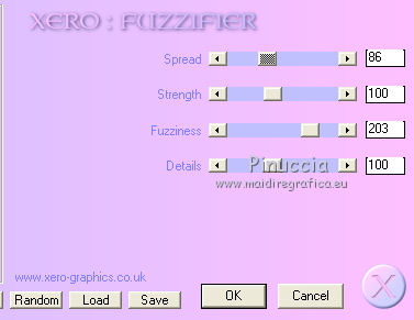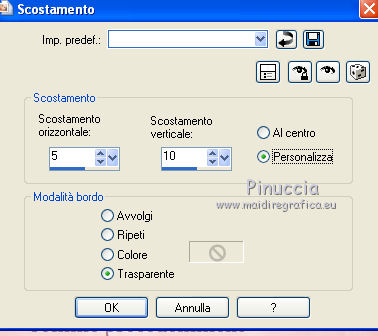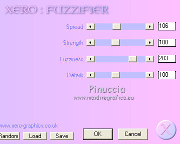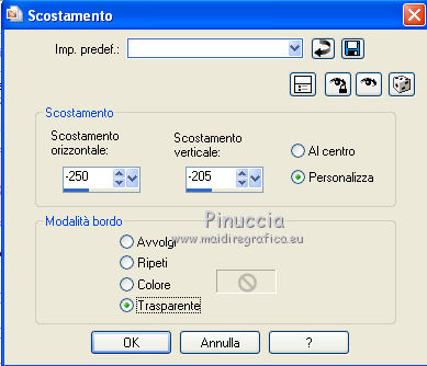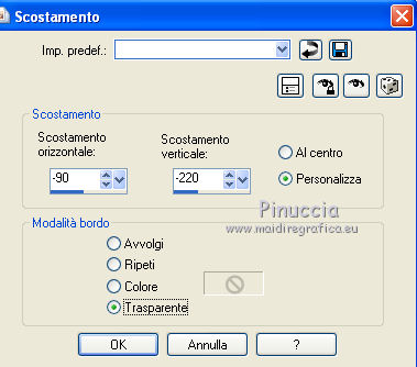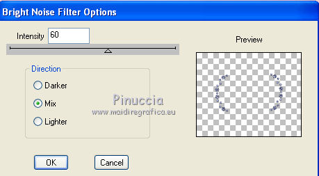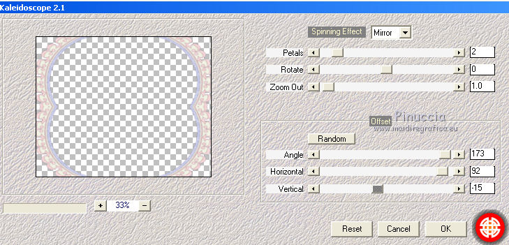 qui puoi trovare qualche risposta ai tuoi dubbi. Se l'argomento che ti interessa non è presente, ti prego di segnalarmelo. Per tradurre questo tutorial ho usato PSP X. Questo tutorial è una creazione di ©Titoune e non può essere copiato su altri siti nè essere offerto per il download. Lo stesso vale per la mia traduzione. Il materiale viene da vari gruppi di condivisione. Il copyright appartiene ai rispettivi autori. Grazie ai creatori dei tubes che mettono a disposizione il loro lavoro in vari gruppi di condivisione. Occorrente: Materiale qui Il tube usato è di Logane. Gli elementi dello scrap Winter Flowers che trovi sono una creazione di Alevtina Rispetta il lavoro degli autori, non cambiare il nome del file e non cancellare il watermark. Filtri: consulta, se necessario, la mia sezione filtri qui Penta.com - Jeans qui Tramages - Panel Stripes qui Simple - 4Way average qui Mehdi - Kaleidoscope 2.1 qui Penta.com - Color dot qui Xero - Fuzzifier qui DSB Flux - Bright Noise qui Animation Shop qui ![]() 1. Apri una nuova immagine trasparente 750 x 600 pixels. Selezione>Seleziona tutto. 2. Apri il tube alevtina_winter_flowers(2) e vai a Modifica>Copia. Torna al tuo lavoro e vai a Modifica>Incolla nella selezione. Mantieni selezionato. 3. Livelli>Nuovo livello raster. Apri il tube alevtina_winter_flowers(3) e vai a Modifica>Copia. Torna al tuo lavoro e vai a Modifica>Incolla nella selezione. 4. Selezione>Modifica>Contrai - 35 pixels. Modifica>Taglia. Livelli>Nuovo livello raster. Livelli>Disponi>Sposta giù. Modifica>Incolla nella selezione. Selezione>Inverti. 5. Attiva il livello superiore del bordo. Effetti>Plugins>Tramages - Panel Stripes, con i settaggi standard. ![]() 6. Effetti>Effetti 3D>Smusso a incasso. ![]() 7. Effetti>Plugins>Simple - 4Way Average. Di nuovo: Selezione>Inverti. 8. Effetti>Effetti 3D>Sfalsa ombra, con il colore #977e7d. ![]() Ripeti l'Effetto Sfalsa ombra, cambiando verticale e orizzontale con -3. 9. Livelli>Nuovo livello raster. Apri il tube alevtina_winter_flowers e vai a Modifica>Copia. Torna al tuo lavoro e vai a Modifica>Incolla nella selezione. Selezione>Deseleziona. Livelli>Disponi>Sposta giù. Rinomina questo livello "animazione". 10. Livelli>Duplica. Livelli>Disponi>Porta in alto. 11. Effetti>Plugins>Mehdi - Kaleidoscope 2.1. ![]() 12. Immagine>Ridimensiona, al 120%, tutti i livelli non selezionato. Regola>Messa a fuoco>Metti a fuoco. 13. Effetti>Effetti 3D>Sfalsa ombra, con i settaggi precedenti. 14. Apri il tube alevtina_winter_flowers(5) e vai a Modifica>Copia. Torna al tuo lavoro e vai a Modifica>Incolla come nuovo livello. 15. Effetti>Effetti di immagine>Scostamento. ![]() 16. Effetti>Effetti di distorsione>Specchio rotante. ![]() 17. Effetti>Effetti 3D>Sfalsa ombra, con i settaggi precedenti. 18. Apri il tube alevtina_winter_flowers(10) e vai a Modifica>Copia. Torna al tuo lavoro e vai a Modifica>Incolla come nuovo livello. 19. Immagine>Ruota per gradi - 90 gradi a sinistra. ![]() 20. Effetti>Effetti di immagine>Scostamento. ![]() 21. Effetti>Effetti di distorsione>Specchio rotante, con i settaggi precedenti. 22. Effetti>Effetti 3D>Sfalsa ombra, con i settaggi precedenti. Rinomina questo livello "fiori centrali". 23. Apri il tube alevtina_winter_flowers(6) e vai a Modifica>Copia. Torna al tuo lavoro e vai a Modifica>Incolla come nuovo livello. 24. Immagine>Ruota per gradi - 25 gradi a sinistra. ![]() 25. Effetti>Effetti di immagine>Scostamento. ![]() 26. Effetti>Effetti 3D>Sfalsa ombra, con i settaggi precedenti. 27. Apri il tube alevtina_winter_flowers(4) e vai a Modifica>Copia. Torna al tuo lavoro e vai a Modifica>Incolla come nuovo livello. 28. Effetti>Effetti di immagine>Scostamento. ![]() 29. Effetti>Effetti di distorsione>Specchio rotante, con i settaggi precedenti. 30. Effetti>Effetti 3D>Sfalsa ombra, con i settaggi precedenti. Attiva il livello "animazione". 31. Apri il tube titoune_accents_winter_flowers e vai a Modifica>Copia. Torna al tuo lavoro e vai a Modifica>Incolla come nuovo livello. 32. Effetti>Effetti di immagine>Scostamento. ![]() Livelli>Disponi>Sposta giù. Rinomina questo livello "animazione 2". 33. Attiva il livello "fiori centrali". Apri il tube logane_femme2_juin201119 e vai a Modifica>Copia. Torna al tuo lavoro e vai a Modifica>Incolla come nuovo livello. 34. Immagine>Ridimensiona, al 65%, tutti i livelli non selezionato. Regola>Messa a fuoco>Metti a fuoco. Livelli>Disponi>Sposta giù. Posiziona il tube come nel mio esempio.Livelli>Duplica, e cambia la modalità di miscelatura di questo livello in Luce diffusa. 35. Attiva il livello sottostante dell'originale. Effetti>Effetti 3D>Sfalsa ombra con i settaggi precedenti. 36. Livelli>Nuovo livello raster. Livelli>Disponi>Porta in alto. Imposta il colore di primo piano con un colore della tua tag; per l'esempio #a17b82, e riempi il livello con questo colore.37. Selezione>Seleziona tutto. Selezione>Modifica>Contrai - 2 pixels. Premi sulla tastiera il tasto CANC. Selezione>Inverti. 38. Effetti>Plugins>Penta.com - Color dot, con i settaggi standard. ![]() Selezione>Deseleziona. 39. Effetti>Effetti 3D>Sfalsa ombra, con i settaggi precedenti. Firma il tuo lavoro. 40. Animazione. Attiva il livello "animazione". Livelli>Duplica - 2 volte, e rimani posizionato sul livello della seconda copia. Effetti>Plugins>Xero - Fuzzifier. ![]() Chiudi il livello e attiva il livello sottostante della prima copia. Effetti>Plugins>Xero - Fuzzifier - cambia Spread con 106 e ok. ![]() Chiudi questo livello e attiva il livello "animazione". Effetti>Plugins>Xero - Fuzzifier - Spread a 86 e ok. ![]() Lascia questo livello visibile. 41. Attiva il livello "animazione2". Livelli>Duplica - 2 volte, e rimani posizionato sul livello della seconda copia. Effetti>Plugins>Dsb Flux - Bright Noise. ![]() Chiudi il livello e attiva il livello sottostante della prima copia. Effetti>Plugins>Dsb Flux - Bright Noise, clicca sul pallino di Mix per cambiare l'aspetto del disturbo, e ok. Chiudi questo livello e attiva il