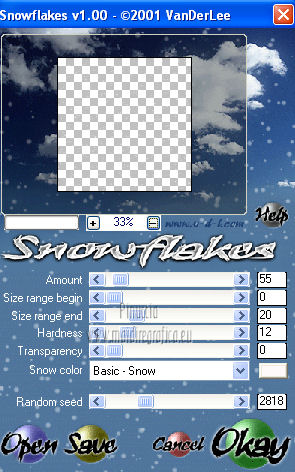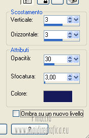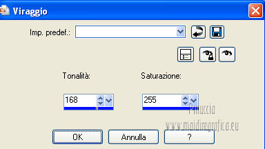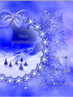 qui puoi trovare qualche risposta ai tuoi dubbi. Se l'argomento che ti interessa non è presente, ti prego di segnalarmelo. Per tradurre questo tutorial ho usato PSP X. Questo tutorial è una creazione di ©Titoune e non può essere copiato su altri siti nè essere offerto per il download. Lo stesso vale per la mia traduzione. Grazie ai creatori dei tubes che mettono a disposizione il loro lavoro in vari gruppi di condivisione. Rispetta il lavoro degli autori, non cambiare il nome del file e non cancellare il watermark. Occorrente: Un tube a scelta. Il resto del materiale qui Il tube utilizzato è di AnaRidzi I tubes dei paesaggi sono di Luna e K@rine Lo scrap "Bling Scrap" è di Misfits Filtri: Simple - Left right wrap (bonus) qui VDL Adrenaline - Snowflakes qui Animation Shop qui ![]() 1. Scegli un colore dall'immagine "blingscrap" per l'esempio #a3a8ff. Prendi nota dei valori di Tonalità (H) e Saturazione (S) di questo colore: ti serviranno per il Viraggio. Per l'esempio: ![]() 2. Apri l'immagine "Départ". Duplicala usando la combinazione di tasti maiuscola+D e chiudi l'originale. Attiva la copia che sarà la base del tuo lavoro. Regola>Tonalità e saturazione>Viraggio e trascrivi i valori annotati nelle rispettive caselle. ![]() 3. Apri il tube "lunapaisagem1370" e vai a Modifica>Copia. Torna al tuo lavoro e vai a Modifica>Incolla come nuovo livello. 4. Effetti>Plugins>Simple - Left Right Wrap. Cambia la modalità di miscelatura di questo livello in Sovrapponi. 5. Apri il tube "LYA_WinterSong-el16" e vai a Modifica>Copia. Torna al tuo lavoro e vai a Modifica>Incolla come nuovo livello. Regola>Tonalità e saturazione>Viraggio, con i settaggi precedenti. 6. Effetti>Effetti 3D>Sfalsa ombra, con il colore #181c5a. ![]() Ripeti l'Effetto Sfalsa ombra, cambiando verticale e orizzontale con -3. 7. Apri l'immagine "blingscrap". Attiva il livello "Circlebackground" e vai a Modifica>Copia. Torna al tuo lavoro e vai a Modifica>Incolla come nuovo livello. Regola>Tonalità e saturazione>Viraggio, con i settaggi precedenti. Non spostarlo. Effetti>Effetti 3D>Sfalsa ombra, con i settaggi precedenti. 8. Attiva l'immagine "blingscrap" e copia il livello "snowflakecircle". Torna al tuo lavoro e vai a Modifica>Incolla come nuovo livello. Regola>Tonalità e saturazione>Viraggio, con i settaggi precedenti. Non spostarlo. Rinomina questo livello "cornice". 9. Attiva l'immagine "blingscrap" e copia il livello "ringdiamonds". Torna al tuo lavoro e vai a Modifica>Incolla come nuovo livello. Regola>Tonalità e saturazione>Viraggio, con i settaggi precedenti. Non spostarlo. Effetti>Effetti 3D>Sfalsa ombra, con i settaggi precedenti. 10. Attiva il livello "cornice". Clicca al centro della cornice con la bacchetta magica ![]() Selezione>Modifica>Espandi - 5 pixels. 11. Livelli>Nuovo livello raster. Livelli>Disponi>Sposta giù. Apri il tube k@rine_ dreams _Misted_Winter_2084_Novembre_2011 e vai a Modifica>Copia. Torna al tuo lavoro e vai a Modifica>Incolla nella selezione. Livelli>Duplica. Cambia la modalità di miscelatura di questo livello in luce diffusa. Selezione>Deseleziona. 12. Attiva nuovamente il livello "cornice". Effetti>Effetti 3D>Sfalsa ombra, con i settaggi precedenti. 13. Attiva il livello superiore. Attiva l'immagine "blingscrap" e copia il livello "lgbow". Torna al tuo lavoro e vai a Modifica>Incolla come nuovo livello. Regola>Tonalità e saturazione>Viraggio, con i settaggi precedenti. Spostalo sopra la cornice.Effetti>Effetti 3D>Sfalsa ombra, con i settaggi precedenti. 14. Attiva l'immagine "blingscrap" e copia il livello "medallion". Torna al tuo lavoro e vai a Modifica>Incolla come nuovo livello. Regola>Tonalità e saturazione>Viraggio, con i settaggi precedenti. Spostalo al centro del nodo.![]() Effetti>Effetti 3D>Sfalsa ombra, con i settaggi precedenti. 15. Attiva l'immagine "blingscrap" e copia il livello "leftleaves". Torna al tuo lavoro e vai a Modifica>Incolla come nuovo livello. Regola>Tonalità e saturazione>Viraggio, con i settaggi precedenti. Spostalo in alto, come nel mio esempio.Nella paletta dei livelli porta questo livello sotto il livello "circlebackground". Effetti>Effetti 3D>Sfalsa ombra, con i settaggi precedenti. 16. Rimani su questo livello. Attiva l'immagine "blingscrap" e copia il livello "rightleaves". Torna al tuo lavoro e vai a Modifica>Incolla come nuovo livello. Immagine>Rifletti. Regola>Tonalità e saturazione>Viraggio, con i settaggi precedenti. Il tube è coperto dai livelli superiori. Per spostarlo premi il tasto D per attivare lo strumento Deformazione ![]() e spostalo in basso a destra. ![]() Effetti>Effetti 3D>Sfalsa ombra, con i settaggi precedenti. 17. Attiva il livello superiore. Attiva l'immagine "blingscrap" e copia il livello "middlestrand". Torna al tuo lavoro e vai a Modifica>Incolla come nuovo livello. Regola>Tonalità e saturazione>Viraggio, con i settaggi precedenti. Spostalo in alto a sinistra,vedi l'esempio finale. Effetti>Effetti 3D>Sfalsa ombra, con i settaggi precedenti. Rinomina questo livello "middlestrand". 18. Attiva l'immagine "blingscrap" e copia il livello "smmedallions". Torna al tuo lavoro e vai a Modifica>Incolla come nuovo livello. Cancella uno dei due anelli.Regola>Tonalità e saturazione>Viraggio, con i settaggi precedenti. 19. Immagine>Ruota per gradi - 10 gradi a sinistra. ![]() Spostalo in alto a sinistra, sotto la catena.![]() Effetti>Effetti 3D>Sfalsa ombra, con i settaggi precedenti. 20. Attiva l'immagine "blingscrap" e copia il livello "lgsnowflakeleft". Torna al tuo lavoro e vai a Modifica>Incolla come nuovo livello. Cancella una delle due maglie.Regola>Tonalità e saturazione>Viraggio, con i settaggi precedenti. Spostalo in alto a sinistra sotto l'anello.![]() Effetti>Effetti 3D>Sfalsa ombra, con i settaggi precedenti. 21. Attiva l'immagine "blingscrap" e copia il livello "smbows". Torna al tuo lavoro e vai a Modifica>Incolla come nuovo livello. Cancella uno dei due nodi.Regola>Tonalità e saturazione>Viraggio, con i set