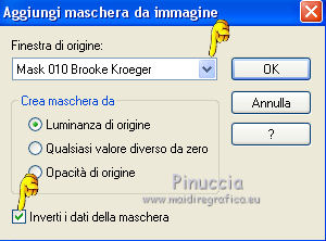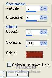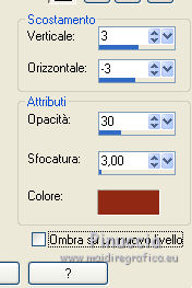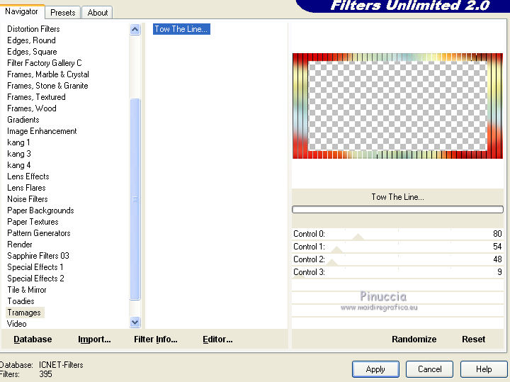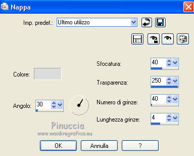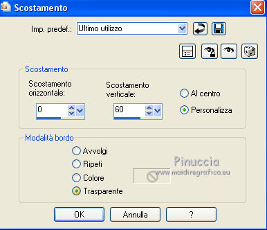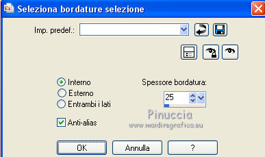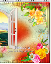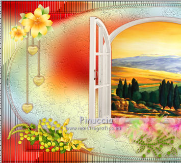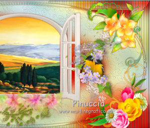 qui puoi trovare qualche risposta ai tuoi dubbi. Se l'argomento che ti interessa non è presente, ti prego di segnalarmelo. Questo tutorial è una creazione di ©Titoune e non può essere copiato su altri siti nè essere offerto per il download. Lo stesso vale per la mia traduzione. Il tutorial è stato creato con PSP X5, ma può essere eseguito anche con le altre versioni di PSP. Secondo la versione utilizzata (anteriore a PSP X) potresti ottenere dei risultati differenti. Vedi la mia scheda riguardante le funzioni Rifletti>Capovolgi in X4 e X5 qui Per tradure il tutorial ho usato PSP X. Occorrente: Un tube a scelta. Il resto del materiale qui Il tube utilizzato è di Choupinette57 Filtri: Filters Unlimited 2.0 qui Tramage - Tow the line qui I filtri Tramage si possono usare da soli o importati in Filters Unlimited 2.0 (come fare vedi qui) Se un filtro fornito appare con questa icona ![]() 1. Apri l'immagine "tuile_depart". Modifica>Copia. non chiuderla perchè ti servirà ancora 2. Apri una nuova immagine trasparente 1280 x 650 pixels. Selezione>Seleziona tutto. Modifica>Incolla nella selezione. Selezione>Deseleziona. ***** Note. Se vuoi realizzare una tua immagine di partenza, con lo strumento Selezione ![]() seleziona una parte della tua immagine. Copiala e incollala nella selezione. Effetti>Effetti di immagine>Motivo unico, con i settaggi standard. ![]() Regola>Sfocatura>Sfocatura gaussiana - raggio 25. ![]() Effetti>Effetti 3D>Smusso a incasso. ![]() ****** 2. Livelli>Duplica. Immagine>Ridimensiona, all'85%, tutti i livelli non selezionato. Selezione>Seleziona tutto. Selezione>Mobile. Selezione>Immobilizza. 3. Chiudi questo livello e attiva il livello sottostante. Selezione>Inverti. Selezione>Innalza selezione a livello. Effetti>Plugins>Filters Unlimited 2.0 - Tramages - Tow the line, con i settaggi standard. ![]() Selezione>Deseleziona. Effetti>Effetti 3D>Smusso a incasso. ![]() 4. Riapri e attiva il livello superiore. Selezione>Seleziona tutto. Selezione>Mobile. Selezione>Immobilizza. 5. Selezione>Modifica>Seleziona bordature selezione. ![]() Selezione>Innalza selezione a livello. Effetti>Plugins>Filters Unlimited 2.0 - Tramages - Tow the line, con i settaggi standard. Effetti>Effetti 3D>Smusso a incasso, con i settaggi precedenti. Selezione>Deseleziona. 6. Effetti>Effetti geometrici>Sfera. ![]() 7. Attiva il livello immediatamente sotto. Effetti>Effetti geometrici>Sfera, con i settaggi precedenti. 8. Effetti>Effetti di trama>Nappa. ![]() 9. Attiva il livello superiore. Effetti>Effetti 3D>Sfalsa ombra, colore #912915. ![]() Ripeti l'Effetto Sfalsa ombra, cambiando verticale e orizzontale con -3/3. ![]() 10. Apri l'elemento "window" e vai a Modifica>Copia. Torna al tuo lavoro e vai a Modifica>Incolla come nuovo livello. Spostalo un po' più in alto.Vedi l'esempio finale. Effetti>Effetti 3D>Sfalsa ombra, con i settaggi precedenti. 11. Attiva lo strumento Bacchetta magica ![]() e clicca al centro della finestra per selezionarla. ![]() Selezione>Modifica>Espandi - 5 pixels. ![]() 12. Livelli>Nuovo livello raster. Livelli>Disponi>Sposta giù. Apri l'immagine del paesaggio e vai a Modifica>Copia. Torna al tuo lavoro e vai a Modifica>Incolla nella selezione. Selezione>Deseleziona. 13. Attiva il livello superiore. Apri l'elemento "WindowStell" e vai a Modifica>Copia. Torna al tuo lavoro e vai a Modifica>Incolla come nuovo livello. Spostalo sotto la finestra.Vedi l'esempio finale. Effetti>Effetti 3D>Sfalsa ombra, con i settaggi precedenti. 14. Apri l'elemento "j 052511 Jring" e vai a Modifica>Copia. Torna al tuo lavoro e vai a Modifica>Incolla come nuovo livello. Sposta anche questo elemento sotto la finestra.![]() Effetti>Effetti 3D>Sfalsa ombra, con i settaggi precedenti. 15. Apri l'elemento "s 063111 Jring" e vai a Modifica>Copia. Torna al tuo lavoro e vai a Modifica>Incolla come nuovo livello. Spostalo in alto a destra.Vedi l'esempio finale. Effetti>Effetti 3D>Sfalsa ombra, con i settaggi precedenti. 16. Apri l'elemento "fbba38d0" e vai a Modifica>Copia. Torna al tuo lavoro e vai a Modifica>Incolla come nuovo livello. Spostalo in basso a destra.![]() Effetti>Effetti 3D>Sfalsa ombra, con i settaggi precedenti. 17. Apri l'elemento "birds" e vai a Modifica>Copia. Torna al tuo lavoro e vai a Modifica>Incolla come nuovo livello. Spostalo a destra.![]() Effetti>Effetti 3D>Sfalsa ombra, con i settaggi precedenti. 18. Apri l'elemento "0_c1cf2_b6b319b8_XL" e vai a Modifica>Copia. Torna al tuo lavoro e vai a Modifica>Incolla come nuovo livello. Spostalo in basso a sinistra.Vedi l'esempio finale. Effetti>Effetti 3D>Sfalsa ombra, con i settaggi precedenti. 19. Apri l'elemento "hearts_png_by_melissa_tm-d4lwfam" e vai a Modifica>Copia. Torna al tuo lavoro e vai a Modifica>Incolla come nuovo livello. Spostalo in alto a sinistra.Vedi l'esempio finale. Effetti>Effetti 3D>Sfalsa ombra, con i settaggi precedenti. 20. Apri l'elemento "Large_Yellow_Flower_Clipart" e vai a Modifica>Copia. Torna al tuo lavoro e vai a Modifica>Incolla come nuovo livello. Spostalo in alto a sinistra.![]() Effetti>Effetti 3D>Sfalsa ombra, con i settaggi precedenti. 21. Apri il tuo tube e vai a Modifica>Copia. Torna al tuo lavoro e vai a Modifica>Incolla come nuovo livello. Immagine>Ridimensiona, se e quanto necessario, tutti i livelli non selezionato. Spostalo dove preferisci,o vedi il mio esempio. Effetti>Effetti 3D>Sfalsa ombra, con i settaggi precedenti. 22. Attiva il livello inferiore. Modifica>Copia. Selezione>Seleziona tutto. Immagine>Ritaglia la selezione. 23. Immagine>Dimensioni tela - 1280 x 1500 pixels. ![]() 24. Livelli>Nuovo livello raster. Livelli>Disponi>Sposta giù. Selezione>Seleziona tutto. Modifica>Incolla nella selezione. Selezione>Deseleziona. 25. Apri una nuova immagine trasparente 1280 x 350 pixels. Selezione>Seleziona tutto. 26. Attiva nuovamente l'immagine tuile_depart e vai a Modifica>Copia. Torna al tuo lavoro e vai a Modifica>Incolla nella selezione. Selezione>Deseleziona. 27. Livelli>Nuovo livello m